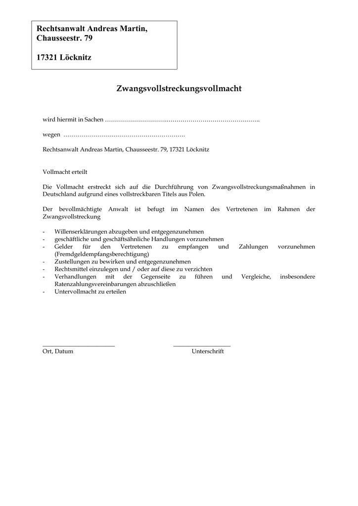 Rechtsanwalt Andreas Martin, Chausseestr. 79 17321 Löcknitz Zwangsvollstreckungsvollmacht wird hiermit in Sachen ………………………….……………………………………….. wegen ……………………………………………………. Rechtsanwalt Andreas Martin, Chausseestr. 79, 17321 Löcknitz Vollmacht erteilt Die Vollmacht erstreckt sich auf die Durchführung von Zwangsvollstreckungsmaßnahmen in Deutschland aufgrund eines vollstreckbaren Titels aus Polen. Der bevollmächtigte Zwangsvollstreckung - Anwalt ist befugt im Namen des Vertretenen Willenserklärungen abzugeben und entgegenzunehmen geschäftliche und geschäftsähnliche Handlungen vorzunehmen Gelder für den Vertretenen zu empfangen und (Fremdgeldempfangsberechtigung) Zustellungen zu bewirken und entgegenzunehmen Rechtsmittel einzulegen und / oder auf diese zu verzichten Verhandlungen mit der Gegenseite zu führen und Ratenzahlungsvereinbarungen abzuschließen Untervollmacht zu erteilen ________________________ Ort, Datum ___________________ Unterschrift im Zahlungen Vergleiche, Rahmen der vorzunehmen insbesondere Rechtsanwalt Andreas Martin, Chausseestr. 79 17321 Löcknitz Pełnomocnictwo do przeprowadzenia egzekucji przymusowej w sprawie ………………………….……………………………………….. dla ……………………………………………………. niemieckiego mecenasa Andreasa Martina, Chausseestr. 79, 17321 Löcknitz upełnomocnia Pełnomocnictwo rozciąga się na przeprowadzenie sankcji egzekucyjnej w Niemczech na podstawie tytułu egzekucyjnego z Polski. Umocowany adwokat jest upoważniony w imieniu reprezentowanego w ramach egzekucji przymusowej do: - przyjmowania i składania oświadczeń woli podejmowania dzialań handlowych i podobnych do handlowych odbierania pieniędzy dla reprezentowanego i podejmowania zapłaty dokonywania i przyjmowania doręczeń wnoszenia środków prawnych oraz rezygnowania ze środkow prawnych zawierania ze stroną przeciwną ugód, w szczególności zawarcia ugody zapłaty ratalnej udzielania substytucji procesowej ………………………………. Miejsce, data ………………………….. Podpis