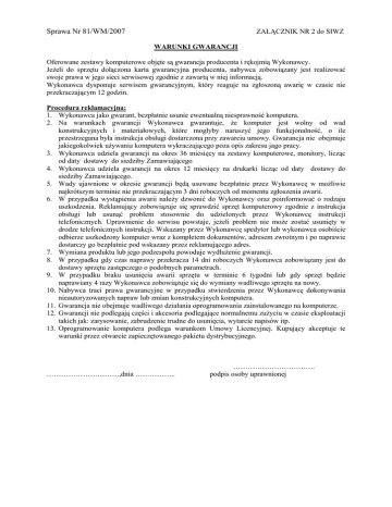 Sprawa Nr 81/WM/2007 ZAŁĄCZNIK NR 2 do SIWZ WARUNKI GWARANCJI Oferowane zestawy komputerowe objęte są gwarancja producenta i rękojmią Wykonawcy. Jeżeli do sprzętu dołączona karta gwarancyjna producenta, nabywca zobowiązany jest realizować swoje prawa w jego sieci serwisowej zgodnie z zawartą w niej informacją. Wykonawca dysponuje serwisem gwarancyjnym, który reaguje na zgłoszoną awarię w czasie nie przekraczającym 12 godzin. Procedura reklamacyjna: 1. Wykonawca jako gwarant, bezpłatnie usunie ewentualną niesprawność komputera. 2. Na warunkach gwarancji Wykonawca gwarantuje, że komputer jest wolny od wad konstrukcyjnych i materiałowych, które mogłyby naruszyć jego funkcjonalność, o ile przestrzegana była instrukcja obsługi dostarczona przy zawarciu umowy. Gwarancja nie obejmuje jakiegokolwiek używania komputera wykraczającego poza opis zakresu jago pracy. 3. Wykonawca udziela gwarancji na okres 36 miesięcy na zestawy komputerowe, monitory, licząc od daty dostawy do siedziby Zamawiającego 4. Wykonawca udziela gwarancji na okres 12 miesięcy na drukarki licząc od daty dostawy do siedziby Zamawiającego. 5. Wady ujawnione w okresie gwarancji będą usuwane bezpłatnie przez Wykonawcę w możliwie najkrótszym terminie nie przekraczającym 3 dni roboczych od momentu zgłoszenia awarii. 6. W przypadku wystąpienia awarii należy dzwonić do Wykonawcy oraz poinformować o rodzaju uszkodzenia. Reklamujący zobowiązuje się sprawdzić sprzęt komputerowy zgodnie z instrukcja obsługi lub usunąć problem stosownie do udzielonych przez Wykonawcę instrukcji telefonicznych. Uprawnienie do serwisu powstaje, jeżeli problem nie może zostać usunięty w drodze telefonicznych instrukcji. Wskazany przez Wykonawcę spedytor lub wykonawca osobiście odbierze uszkodzony komputer wraz z kompletem dokumentów, adresem zwrotnym i po naprawie dostarczy go bezpłatnie pod wskazany przez reklamującego adres. 7. Wymiana produktu lub jego podzespołu powoduje wydłużenie gwarancji. 8. W przypadku gdy czas naprawy przekracza 14 dni roboczych Wykonawca zobowiązany jest do dostawy sprzętu zastępczego o podobnych parametrach. 9. W przypadku braku usunięcia awarii sprzętu w terminie 6 tygodni lub gdy sprzęt będzie naprawiany 4 razy Wykonawca zobowiązuje się do wymiany wadliwego sprzętu na nowy. 10. Nabywca traci prawa gwarancyjne w przypadku stwierdzenia przez Wykonawcę dokonywania nieautoryzowanych napraw lub zmian konstrukcyjnych komputera. 11. Gwarancja nie obejmuje wadliwego działania oprogramowania zainstalowanego na komputerze. 12. Gwarancji nie podlegają części i akcesoria podlegające normalnemu zużyciu w czasie eksploatacji takich jak: zarysowanie, zabrudzenie trudne do usunięcia, wytarcie napisów itp. 13. Oprogramowanie komputera podlega warunkom Umowy Licencyjnej. Kupujący akceptuje te warunki przez otwarcie zapieczętowanego pakietu dystrybucyjnego. …………………………,dnia …………….. ……………………………. podpis osoby uprawnionej
