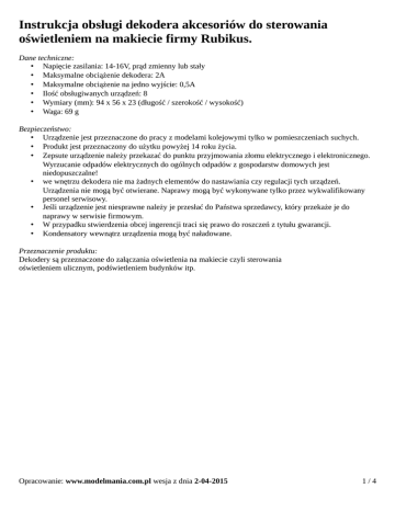 Instrukcja obsługi dekodera akcesoriów do sterowania oświetleniem na makiecie firmy Rubikus. Dane techniczne: • Napięcie zasilania: 14-16V, prąd zmienny lub stały • Maksymalne obciążenie dekodera: 2A • Maksymalne obciążenie na jedno wyjście: 0,5A • Ilość obsługiwanych urządzeń: 8 • Wymiary (mm): 94 x 56 x 23 (długość / szerokość / wysokość) • Waga: 69 g Bezpieczeństwo: • Urządzenie jest przeznaczone do pracy z modelami kolejowymi tylko w pomieszczeniach suchych. • Produkt jest przeznaczony do użytku powyżej 14 roku życia. • Zepsute urządzenie należy przekazać do punktu przyjmowania złomu elektrycznego i elektronicznego. Wyrzucanie odpadów elektrycznych do ogólnych odpadów z gospodarstw domowych jest niedopuszczalne! • we wnętrzu dekodera nie ma żadnych elementów do nastawiania czy regulacji tych urządzeń. Urządzenia nie mogą być otwierane. Naprawy mogą być wykonywane tylko przez wykwalifikowany personel serwisowy. • Jeśli urządzenie jest niesprawne należy je przesłać do Państwa sprzedawcy, który przekaże je do naprawy w serwisie firmowym. • W przypadku stwierdzenia obcej ingerencji traci się prawo do roszczeń z tytułu gwarancji. • Kondensatory wewnątrz urządzenia mogą być naładowane. Przeznaczenie produktu: Dekodery są przeznaczone do załączania oświetlenia na makiecie czyli sterowania oświetleniem ulicznym, podświetleniem budynków itp. Opracowanie: www.modelmania.com.pl wesja z dnia 2-04-2015 1/4 Podłączenie: Połączeń dokonujemy za pomocą przewodów z usuniętą izolacją na końcu. Przewód umieszczamy w odpowiednim zacisku i unieruchamiamy dokręcając śrubkę w zacisku. Trwałość połączenia można sprawdzić lekko pociągając z przewód. Przeznaczenie wyjść / wejść: DCC - podłączenie sygnału DCC z torów lub bezpośrednio z centralki sterownia cyfrowego, kolejność przewodów nie ma znaczenia AC - podłączenie zasilacza do transformatora prądu zmiennego lub stałego 14-16V, kolejność przewodów nie ma znaczenia Opracowanie: www.modelmania.com.pl wesja z dnia 2-04-2015 2/4 Możliwe jest także podłączenie zasilania bezpośrednio z torów lub centralki, jak pokazano na rysunku poniżej, jednak w takim przypadku programowanie dekodera nie będzie możliwe, należy także pamiętać że urządzenia podłączone do dekodera obiążają zasilacz od sterowania cyfrowego. Przy nadmiernym poborze prądu lokomotywy mogą zatrzymywać lub nie jeździć płynnie. OUT1 - OUT4 – Wyjścia sterujące obwodami oświetlenia makietowego. W dekoderze mamy osiem niezależnych wyjść pogrupowanych w pary (OUT1 - OUT4). Każde wyjście (OUT1 - OUT4) posiada 3 zaciski: 1 - obwód pierwszy dla danego wyjścia OUT 3 - obwód drugi dla danego wyjścia OUT 2 - wspólny zacisk dla obydwu obwodów danego wyjścia OUT Opracowanie: www.modelmania.com.pl wesja z dnia 2-04-2015 3/4 Programowanie: Dekoder podzielony jest na dwie połówki czyli programujemy dwa adresy urządzeń dla jednego dekodera. Każda połówka steruje czterema obwodami na kolejnych adresach urządzeń w sterowaniu dcc. Przykładowa procedura programowania adresów:, załóżmy, że chcemy aby pierwsze cztery obwody miały adresy urządzeń od 9 do 12, a drugie cztery od 13 do 16. Wzór na wyliczenie adresu: ilość wyjść w połówce dekodera+x = adres docelowy pierwszego wyjścia + 1 czyli: adres docelowy pierwszego wyjścia odjąć 1 podzielone przez 4 = x gdzie x to wartość szukana do wpisania do CV1. dla pierwszej połówki wyliczamy: 9 – 1 = 8 podzielić przez 4 = 2 Postępujemy następująco: w trybie programowania wpisujemy do CV33 wartość 0, teraz do CV1 wpisujemy adres pierwszej polówki dekodera czyli 2. Czemu? Bo ze wzoru wynika, że: 9-1= 8/4 =2. Teraz do CV33 wpisujemy wartość 143 i do CV1 wartość 3 (13-1=12/4=3) i mamy zaprogramowaną drugą połówkę dekodera. Wygląda to trochę skomplikowanie ale po zrozumieniu wzoru jest naprawdę proste. (domyślnie 0, czyli dla OUT1 adres 1) Poniższa tabela przedstawia jakie adresy zostaną przypisane poszczególnym wyjściom: programowanie adres OUT1 adres OUT2 adres OUT3 adres OUT4 CV1 = 0 1 2 3 4 CV1 = 1 5 6 7 8 CV1 = 2 9 10 11 12 CV1 = 3 13 14 15 16 CV1 = 4 17 18 19 20 CV1 = 5 21 22 23 24 CV1 = 6 25 26 27 28 Dziękujemy za zakup naszego urządzenia i życzymy przyjemnej zabawy. Więcej produktów firmy Rubikus na www.modelmania.com.pl. Opracowanie: www.modelmania.com.pl wesja z dnia 2-04-2015 4/4