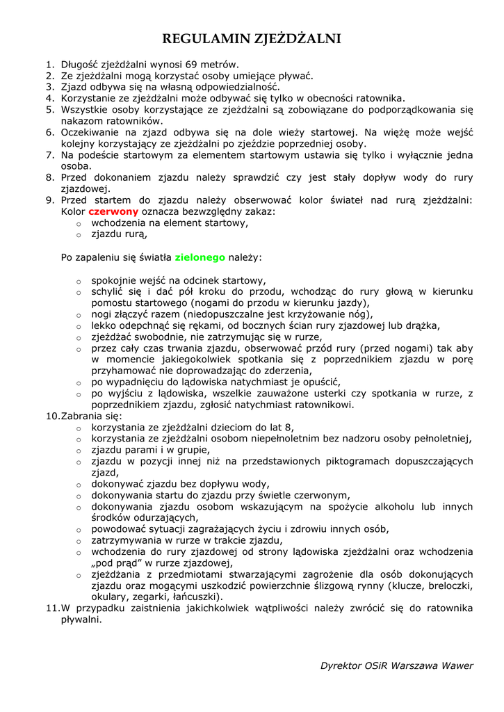 REGULAMIN ZJEŻDŻALNI 1. 2. 3. 4. 5. 6. 7. 8. 9. Długość zjeżdżalni wynosi 69 metrów. Ze zjeżdżalni mogą korzystać osoby umiejące pływać. Zjazd odbywa się na własną odpowiedzialność. Korzystanie ze zjeżdżalni może odbywać się tylko w obecności ratownika. Wszystkie osoby korzystające ze zjeżdżalni są zobowiązane do podporządkowania się nakazom ratowników. Oczekiwanie na zjazd odbywa się na dole wieży startowej. Na więżę może wejść kolejny korzystający ze zjeżdżalni po zjeździe poprzedniej osoby. Na podeście startowym za elementem startowym ustawia się tylko i wyłącznie jedna osoba. Przed dokonaniem zjazdu należy sprawdzić czy jest stały dopływ wody do rury zjazdowej. Przed startem do zjazdu należy obserwować kolor świateł nad rurą zjeżdżalni: Kolor czerwony oznacza bezwzględny zakaz: o wchodzenia na element startowy, o zjazdu rurą, Po zapaleniu się światła zielonego należy: spokojnie wejść na odcinek startowy, schylić się i dać pół kroku do przodu, wchodząc do rury głową w kierunku pomostu startowego (nogami do przodu w kierunku jazdy), o nogi złączyć razem (niedopuszczalne jest krzyżowanie nóg), o lekko odepchnąć się rękami, od bocznych ścian rury zjazdowej lub drążka, o zjeżdżać swobodnie, nie zatrzymując się w rurze, o przez cały czas trwania zjazdu, obserwować przód rury (przed nogami) tak aby w momencie jakiegokolwiek spotkania się z poprzednikiem zjazdu w porę przyhamować nie doprowadzając do zderzenia, o po wypadnięciu do lądowiska natychmiast je opuścić, o po wyjściu z lądowiska, wszelkie zauważone usterki czy spotkania w rurze, z poprzednikiem zjazdu, zgłosić natychmiast ratownikowi. 10.Zabrania się: o korzystania ze zjeżdżalni dzieciom do lat 8, o korzystania ze zjeżdżalni osobom niepełnoletnim bez nadzoru osoby pełnoletniej, o zjazdu parami i w grupie, o zjazdu w pozycji innej niż na przedstawionych piktogramach dopuszczających zjazd, o dokonywać zjazdu bez dopływu wody, o dokonywania startu do zjazdu przy świetle czerwonym, o dokonywania zjazdu osobom wskazującym na spożycie alkoholu lub innych środków odurzających, o powodować sytuacji zagrażających życiu i zdrowiu innych osób, o zatrzymywania w rurze w trakcie zjazdu, o wchodzenia do rury zjazdowej od strony lądowiska zjeżdżalni oraz wchodzenia „pod prąd” w rurze zjazdowej, o zjeżdżania z przedmiotami stwarzającymi zagrożenie dla osób dokonujących zjazdu oraz mogącymi uszkodzić powierzchnie ślizgową rynny (klucze, breloczki, okulary, zegarki, łańcuszki). 11.W przypadku zaistnienia jakichkolwiek wątpliwości należy zwrócić się do ratownika pływalni. o o Dyrektor OSiR Warszawa Wawer