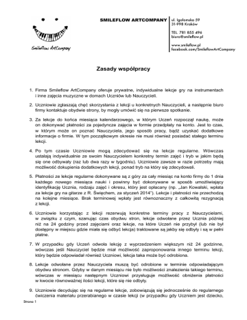 SMILEFLOW ARTCOMPANY ul. Igołomska 59 31-998 Kraków TEL. 781 855 496 [email protected] www.smileflow.pl facebook.com/SmileflowArtCompany Zasady współpracy 1. Firma Smileflow ArtCompany oferuje prywatne, indywidualne lekcje gry na instrumentach i inne zajęcia muzyczne w domach Uczniów lub Nauczycieli. 2. Uczniowie zgłaszają chęć skorzystania z lekcji u konkretnych Nauczycieli, a następnie biuro firmy kontaktuje obydwie strony, by mogły umówić się na pierwsze spotkanie. 3. Za lekcje do końca miesiąca kalendarzowego, w którym Uczeń rozpoczął naukę, może on dokonywać płatności za pojedyncze zajęcia w formie przedpłaty na konto. Jest to czas, w którym może on poznać Nauczyciela, jego sposób pracy, bądź uzyskać dodatkowe informacje o firmie. W tym początkowym okresie nie musi również posiadać stałego terminu lekcji. 4. Po tym czasie Uczniowie mogą zdecydować się na lekcje regularne. Wówczas ustalają indywidualnie ze swoim Nauczycielem konkretny termin zajęć i tryb w jakim będą się one odbywały (raz lub dwa razy w tygodniu). Uczniowie zawsze w razie potrzeby mają możliwość dokupienia dodatkowych lekcji, ponad tryb na który się zdecydowali. 5. Płatności ze lekcje regularne dokonywane są z góry za cały miesiąc na konto firmy do 1 dnia każdego nowego miesiąca nauki i powinny być dokonywane w sposób umożliwiający identyfikację Ucznia, rodzaju zajęć i okresu, który jest opłacany (np. „Jan Kowalski, wpłata za lekcje gry na gitarze z R. Święchem, za styczeń 2014”). Lekcje i płatności nie przechodzą na kolejne miesiące. Brak terminowej wpłaty jest równoznaczny z całkowitą rezygnacją z lekcji. 6. Uczniowie korzystając z lekcji rezerwują konkretne terminy pracy z Nauczycielami, w związku z czym, szanując czas obydwu stron, lekcje odwołane przez Ucznia później niż na 24 godziny przed zajęciami oraz lekcje, na które Uczeń nie przybył (lub nie był dostępny w miejscu gdzie miała się odbyć lekcja) traktowane są jakby się odbyły i są w pełni płatne. 7. W przypadku gdy Uczeń odwoła lekcję z wyprzedzeniem większym niż 24 godzinne, wówczas jeśli Nauczyciel będzie miał możliwość zaproponowania innego terminu lekcji, który będzie odpowiadał również Uczniowi, lekcja taka może być odrobiona. 8. Lekcje odwołane przez Nauczyciela muszą być odrobione w terminie odpowiadającym obydwu stronom. Gdyby w danym miesiącu nie było możliwości znalezienia takiego terminu, wówczas w miesiącu następnym Uczniowi przysługuje możliwość obniżenia płatności w kwocie równoważnej ilości lekcji, które się nie odbyły. 9. Uczniowie decydując się na regularne lekcje, zobowiązują się jednocześnie do regularnego ćwiczenia materiału przerabianego w czasie lekcji (w przypadku gdy Uczniem jest dziecko, Strona 1 wówczas to Rodzice zobowiązują się pracować z dzieckiem pilnując, by ćwiczyło regularnie i efektywnie), bądź też zadawanego przez Nauczyciela jako praca domowa tak, by poziom wiedzy i umiejętności Ucznia umożliwiał sukcesywną realizację przyjętego programu nauczania. 10.Po każdych trzech miesiącach pracy z Uczniem, Nauczyciel przedstawia Właścicielowi Firmy opinię na temat pracy Ucznia, poczynionych przez niego postępów, stopnia przygotowania i realizacji przyjętego programu nauczania. W przypadku opinii negatywnej (notoryczny brak przygotowania do lekcji, złe zachowanie itp.) Nauczyciel ma prawo zrezygnować z dalszej pracy z danym Uczniem. 11.O dopuszczeniu do możliwości wystąpienia Ucznia w czasie Koncertów Uczniów Smileflow ArtCompany oraz korzystania ze wszelkich innych zajęć w ramach Smileflow ArtCompany decyduje Właściciel Firmy na podstawie opinii Nauczyciela opartej na dokonanej przez niego obserwacji postępów Ucznia, stopnia jego przygotowania i realizacji programu nauczania. 12.Korzystanie z usług firmy Smileflow ArtCompany jest równoznaczne z akceptacją niniejszych Zasad współpracy. Z poważaniem, Ryszard Święch, Właściciel firmy Smileflow ArtCompany Niniejsze Zasady współpracy obowiązują od dnia 1 stycznia 2014 roku Strona 2
