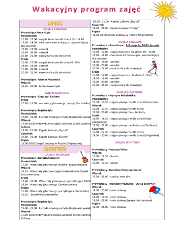 ZAJĘCIA TANECZNE Prowadząca Anna Hupa: Poniedziałek 16.00 - 17.00 - zajęcia taneczne dla dzieci 10 – 14 lat 17.00 - 18.00 - ćwiczenia wzmacniająco - usprawniające dla seniorek 18.00 - 19.00 - aerobik 19.00 - 20.00 - aerobik 20.00 - 21.00 - nauka tańca dla dorosłych Środa 16.00 - 17.00 - zajęcia taneczne dla dzieci 6 - 9 lat 18.00 - 19.00 - aerobik 19.00 - 20.00 - aerobik 20.00 - 21.00 - nauka tańca dla dorosłych Prowadzący - Marcin Majewski: Wtorek 18.30 - 20.00 - taniec towarzyski 18.00 - 21.00 - Kapela Ludowa „Dyszel” Czwartek 18.00 - 21.00 - Kapela Ludowa "Dyszel" Piątek 18.00-20.00 Zespół Ludowy w Rudzie Żmigrodzkiej ZAJĘCIA TANECZNE Prowadząca - Anna Hupa: 1-3 sierpnia, 20-31 sierpnia Poniedziałek 16.00 - 17.00 - zajęcia taneczne dla dzieci 10 – 14 lat 17.00 - 18.00 - ćwiczenia wzmacniająco - usprawniające dla seniorek 18.00 - 19.00 - aerobik 19.00 - 20.00 - aerobik 20.00 - 21.00 - nauka tańca dla dorosłych Środa 16.00 - 17.00 - zajęcia taneczne dla dzieci 6 - 9 lat 18.00 - 19.00 - aerobik 19.00 - 20.00 - aerobik 20.00 - 21.00 - nauka tańca dla dorosłych ZAJĘCIA PLASTYCZNE ZAJĘCIA MUZYCZNE Prowadząca Krystyna Kobylańska: Prowadzący - Krzysztof Szubert: Poniedziałek Środa 10.00 - 11.00 - warsztaty gitarowe gr. począt.(Korzeńsko) 16.30 - 18.30 - zajęcia plastyczne dla dzieci (Korzeńsko) Wtorek 16.00 - 17.30 - zajęcia plastyczne dla dzieci Prowadzący- Bogdan Syk: 17.30 - 20.00 - zajęcia plastyczne – Seniorzy Poniedziałek Środa 17.00 - 21.00 - Estrada młodego artysty (keyboard, wokal) 16.30 - 18.30 - zajęcia plastyczne dla dzieci (Ruda Wtorek Żmigrodzka) 17.00-18.00 Indywidualne zajęcia wokalne dzieci z pieśnią 19.00 - 21.00 - zajęcia plastyczne Seniorzy (Chodlewo) ludową Czwartek 18.00 - 21.00 - Kapela Ludowa „Dyszel” 16.00 - 17.30 - zajęcia plastyczne dla dzieci Czwartek 18.00 - 20.00 - zajęcia plastyczne dla dzieci (Żmigródek) 18.00 - 21.00 - Kapela Ludowa "Dyszel" Piątek ZAJĘCIA SPORTOWE 18.00-20.00 Zespół Ludowy w Rudzie Żmigrodzkiej ZAJĘCIA MUZYCZNE Prowadzący- Krzysztof Szubert: Poniedziałek 17.00 - Warsztaty gitarowe gr. średnio- zaawansowana Wtorek 18.15 - Warsztaty gitarowe zajęcia indywidualne Zespół instrumentalny Środa 17.00 - 18.00 - Warsztaty gitarowe gr. początkująca 18.00 19.00 - Warsztaty gitarowe gr. Zaawansowana Piątek 15.00 - Warsztaty gitarowe gr. początkująca (Korzeńsko) 16.15 - Zespół instrumentalny Prowadzący - Krzysztof Glina: Wtorek 15.00 - 17.30 – karate Czwartek 15.00 - 17.30 - karate Prowadzący- Stanisław Chorążyczewski: Wtorek 17.00 - 21.00 - szachy, warcaby Prowadzący - Krzysztof Przybylski: OD 16 SIERPNIA Wtorek 18.00 - 20.00 - tenis stołowy Czwartek 18.00 - 19.30 - tenis stołowy 19.30 - 21.00 - tenis stołowy (grupa niezrzeszona) Prowadzący- Bogdan Syk: Piątek Poniedziałek 17.00 - 21.00 - Estrada młodego artysty (keyboard, wokal) 18.00 - 21.00 - tenis stołowy Wtorek 17.00-18.00 Indywidualne zajęcia wokalne dzieci z pieśnią ludową
