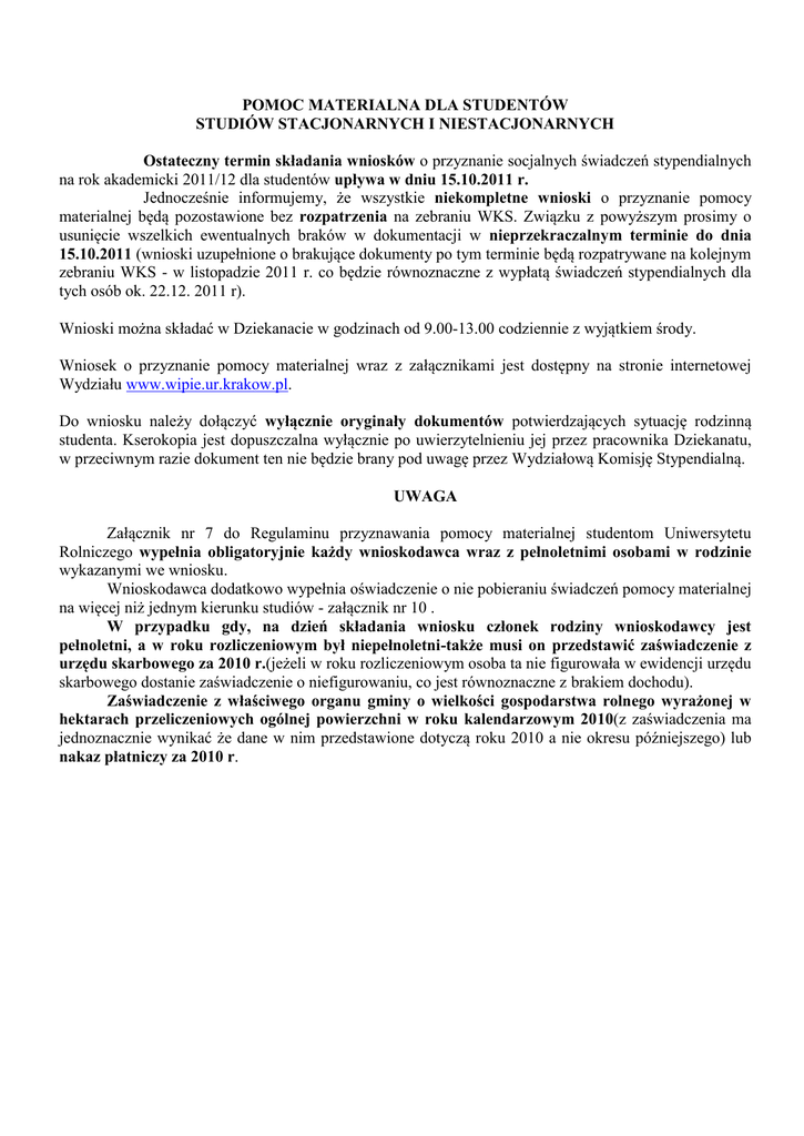 POMOC MATERIALNA DLA STUDENTÓW STUDIÓW STACJONARNYCH I NIESTACJONARNYCH Ostateczny termin składania wniosków o przyznanie socjalnych świadczeń stypendialnych na rok akademicki 2011/12 dla studentów upływa w dniu 15.10.2011 r. Jednocześnie informujemy, że wszystkie niekompletne wnioski o przyznanie pomocy materialnej będą pozostawione bez rozpatrzenia na zebraniu WKS. Związku z powyższym prosimy o usunięcie wszelkich ewentualnych braków w dokumentacji w nieprzekraczalnym terminie do dnia 15.10.2011 (wnioski uzupełnione o brakujące dokumenty po tym terminie będą rozpatrywane na kolejnym zebraniu WKS - w listopadzie 2011 r. co będzie równoznaczne z wypłatą świadczeń stypendialnych dla tych osób ok. 22.12. 2011 r). Wnioski można składać w Dziekanacie w godzinach od 9.00-13.00 codziennie z wyjątkiem środy. Wniosek o przyznanie pomocy materialnej wraz z załącznikami jest dostępny na stronie internetowej Wydziału www.wipie.ur.krakow.pl. Do wniosku należy dołączyć wyłącznie oryginały dokumentów potwierdzających sytuację rodzinną studenta. Kserokopia jest dopuszczalna wyłącznie po uwierzytelnieniu jej przez pracownika Dziekanatu, w przeciwnym razie dokument ten nie będzie brany pod uwagę przez Wydziałową Komisję Stypendialną. UWAGA Załącznik nr 7 do Regulaminu przyznawania pomocy materialnej studentom Uniwersytetu Rolniczego wypełnia obligatoryjnie każdy wnioskodawca wraz z pełnoletnimi osobami w rodzinie wykazanymi we wniosku. Wnioskodawca dodatkowo wypełnia oświadczenie o nie pobieraniu świadczeń pomocy materialnej na więcej niż jednym kierunku studiów - załącznik nr 10 . W przypadku gdy, na dzień składania wniosku członek rodziny wnioskodawcy jest pełnoletni, a w roku rozliczeniowym był niepełnoletni-także musi on przedstawić zaświadczenie z urzędu skarbowego za 2010 r.(jeżeli w roku rozliczeniowym osoba ta nie figurowała w ewidencji urzędu skarbowego dostanie zaświadczenie o niefigurowaniu, co jest równoznaczne z brakiem dochodu). Zaświadczenie z właściwego organu gminy o wielkości gospodarstwa rolnego wyrażonej w hektarach przeliczeniowych ogólnej powierzchni w roku kalendarzowym 2010(z zaświadczenia ma jednoznacznie wynikać że dane w nim przedstawione dotyczą roku 2010 a nie okresu późniejszego) lub nakaz płatniczy za 2010 r.