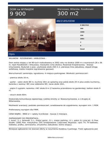 DOM na WYNAJEM 9 900 Warszawa, Wilanów, Rzodkiewki 300 m2 48/2185/ODW 9 900 PLN 300 1000 250 2001 2 6 Good Opis WILANÓW - RZODKIEWKI / ARBUZOWA Dom wolno stojący z lat 90-tych rozbudowany w 2002 roku na działce 1000 m o wymiarach 28 x 36 m, rejon Rzodkiewki / Arbuzowa, niezwykle cicha okolica, Rezerwat Krajobrazowy - Skarpa Ursynowska. Budynek o pow. użytkowej około 250 m 2, pierwsza linia zabudowy, dojazd drogą asfaltową, media miejskie (ogrzewanie gazowe). Nieruchomość zamknięta, ogrodzona, 4 miejsca parkingowe. Wielkości pomieszczeń : - piwnica około 10 m, - parter - salon około 80 m, kuchnia 16m ze spiżarką oraz pokój około 20 m plus aneks kuchenny, łazienka z wanną i WC oraz oddzielne WC, taras około 10m, - piętro 5 sypialni, łazienka z WC około 8 m (2 łazienka przerobiona na garderobę), balkon około 9 m, - strych około 60m. Doskonałą komunikację zapewniają z jednej stronty ul. Nowoursynowska, a z drugiej al. Wilanowska. Możliwość aranżacji, podziału pomieszczeń, umeblowanie do uzgodnienia, wynajem min. 1 ROK. Preferowany wynajem dla FIRM. CENA NAJMU - 9900 zł + opłaty licznikowe - kaucja 2 miesiące. ZAPRASZAMY DO PREZENTACJI.; L. kond.: 2; L. łazienek: 3; L. miejsc garaż.: 0; L. miejsc parking.: 4; L. pokoi: 6; Linie tel.: 0; Pow. działki: 1000; Pow. mieszkalna: 250; Umeblowanie: częściowe; Wyposaż.: opis: TV, TV kablowa, lodówka, pralka, zamrażarka, zmywarka; Zabudowa: wolno stojący; _____________________________________________________ Niniejsze ogłoszenie nie stanowi oferty w rozumieniu Kodeksu Cywilnego. Treść ogłoszenia jest ABRA-Nieruchomości oparta na informacjach uzyskanych od właściciela oferty. Zapytaj naszego doradcę o pomoc w uzyskaniu kredytu ! _____________________________________________________ ZAUFAJ NASZEMU DOŚWIADCZENIU ! Pomagamy klientom od 1990 roku. Gwarantujemy BEZPIECZNĄ, profesjonalną obsługę przy transakcjach kupna-sprzedaży i wynajmu. Stanisław Kołodziej tel. 510 208 508 tel. 22 646 50 55 email: [email protected] ABRA-Nieruchomości Powered by TCPDF (www.tcpdf.org)
