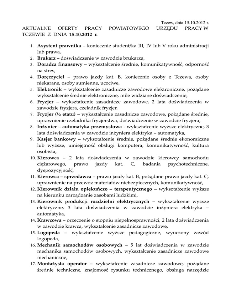 Tczew, dnia 15.10.2012 r. AKTUALNE OFERTY PRACY TCZEWIE Z DNIA 15.10.2012 r. POWIATOWEGO URZĘDU PRACY W 1. Asystent prawnika – koniecznie student/ka III, IV lub V roku administracji lub prawa, 2. Brukarz – doświadczenie w zawodzie brukarza, 3. Doradca finansowy – wykształcenie średnie, komunikatywność, odporność na stres, 4. Doręczyciel – prawo jazdy kat. B, koniecznie osoby z Tczewa, osoby niekarane, osoby sumienne, uczciwe, 5. Elektronik – wykształcenie zasadnicze zawodowe elektroniczne, pożądane wykształcenie średnie elektroniczne, mile widziane doświadczenie, 6. Fryzjer – wykształcenie zasadnicze zawodowe, 2 lata doświadczenia w zawodzie fryzjera, czeladnik fryzjer, 7. Fryzjer (½ etatu) – wykształcenie zasadnicze zawodowe, pożądane średnie, uprawnienie czeladnika fryzjerstwa, doświadczenie w zawodzie fryzjera, 8. Inżynier – automatyka przemysłowa - wykształcenie wyższe elektryczne, 3 lata doświadczenia w zawodzie inżyniera elektryka – automatyka, 9. Kasjer bankowy – wykształcenie średnie, pożądane średnie ekonomiczne lub wyższe, umiejętność obsługi komputera, komunikatywność, kultura osobista, 10. Kierowca – 2 lata doświadczenia w zawodzie kierowcy samochodu ciężarowego, prawo jazdy kat. C, badania psychotechniczne, dyspozycyjność, 11. Kierowca – sprzedawca – prawo jazdy kat. B, pożądane prawo jazdy kat. C, uprawnienie na przewóz materiałów niebezpiecznych, komunikatywność, 12. Kierownik działu opiekuńczo – terapeutycznego – wykształcenie wyższe na kierunku zarządzanie zasobami ludzkimi, 13. Kierownik produkcji rozdzielni elektrycznych – wykształcenie wyższe elektryczne, 3 lata doświadczenia w zawodzie inżyniera elektryka – automatyka, 14. Krawcowa – orzeczenie o stopniu niepełnosprawności, 2 lata doświadczenia w zawodzie krawca, wykształcenie zasadnicze zawodowe, 15. Logopeda – wykształcenie wyższe pedagogiczne, wyuczony zawód logopeda, 16. Mechanik samochodów osobowych – 5 lat doświadczenia w zawodzie mechanika samochodów osobowych, wykształcenie zasadnicze zawodowe mechaniczne, 17. Montażysta operator – wykształcenie zasadnicze zawodowe, pożądane średnie techniczne, znajomość rysunku technicznego, obsługa narzędzie ręcznych typu szlifierka, wiertarka, wkrętarka, zdolności manualne, roczne doświadczenie w pracy na podobnym stanowisku, 18. Monter rozdzielni elektrycznych – 3 lata doświadczenia w zawodzie elektryka, wykształcenie zasadnicze zawodowe elektryczne, znajomość rysunku technicznego, 19. Operator produkcji – wykształcenie zasadnicze zawodowe, gotowość do pracy zmianowej, mile widziane doświadczenie w środowisku produkcyjnym, mile widziane doświadczenie w pracy na podobnym stanowisku, CV na adres [email protected] z dopiskiem „OP/UPT/1012”, 20. Pomocnik operatora maszyn pakujących – wykształcenie zasadnicze zawodowe, pożądane średnie, mile widziane uprawnienie do obsługi wózków widłowych, 21. Pracownik produkcji (ubój /rozbiór) – mile widziane wykształcenie zasadnicze zawodowe, mile widziane roczne doświadczenie w zawodzie rzeźnika, mile widziana książeczka sanitarno – epidemiologiczna, osoby sprawne fizycznie, 22. Projektant – wykształcenie wyższe budowlane, umiejętność obsługi AUTO CAD, mile widziane uprawnienia budowlane, 23. Przedstawiciel handlowy – orzeczenie o stopniu niepełnosprawności, 2 lata doświadczenia w zawodzie przedstawiciela handlowego, wykształcenie zasadnicze zawodowe handlowe, prawo jazdy kat. B, komunikatywność, 24. Psycholog – wykształcenie wyższe pedagogiczne, wyuczony zawód psychologa, 25. Serwisant maszyn rolniczych – wykształcenie zasadnicze zawodowe, pożądane średnie, średnie techniczne lub średnie mechaniczne, prawo jazdy kat. B, pożądane prawo jazdy kat. T, znajomość obsługi komputera, 26. Specjalista do spraw finansowo – ubezpieczeniowych – wykształcenie średnie, chęci do pracy, 5 lat doświadczenia zawodowego, 27. Specjalista do spraw handlowych – wykształcenie średnie, pożądane wyższe, komunikatywna znajomość języka angielskiego, umiejętność obsługi komputera, ogólna wiedza o technice i przemyśle, 28. Specjalista ds. turystyki – wykształcenie wyższe turystyczne, komunikatywna znajomość języka angielskiego, umiejętność obsługi komputera, doświadczenie w biurze podróży, znajomość systemów rezerwacyjnych, 29. Sprzedawca – wykształcenie zasadnicze zawodowe, pożądane średnie, mile widziane dwa lata doświadczenia w zawodzie sprzedawcy, mile widziane uprawnienia do obsługi wózków widłowych, umiejętność obsługi komputera, pakietu MS Office, umiejętność obsługi kas fiskalnych, mile widziana komunikatywna znajomość języka angielskiego, 30. Sprzedawca na dziale budowlanym - wykształcenie średnie, umiejętność obsługi komputera, znajomość zagadnień budowlanych, doświadczenie w handlu, 31. Sprzedawca na dział majsterkowanie – wykształcenie średnie, umiejętność obsługi komputera, znajomość zagadnień technicznych, doświadczenie w handlu, 32. Sprzedawca odzieży – 1 rok doświadczenia w zawodzie sprzedawcy w sklepie odzieżowym, 33. Stanowisko ds. księgowości budżetowej i płac na ¼ etatu – wykształcenie średnie, pożądane wyższe, znajomość ustawy o finansach publicznych, o rachunkowości, prawo zamówień publicznych, o samorządzie gminnym, o pracownikach samorządowych oraz instrukcji kancelaryjnej, 34. Stolarz – 5 lat doświadczenia w zawodzie stolarza, wykształcenie zasadnicze zawodowe, mile widziane średnie, umiejętność obsługi piły, 35. Telefoniczny doradca klienta – wykształcenie średnie, umiejętność obsługi komputera, dobra dykcja,