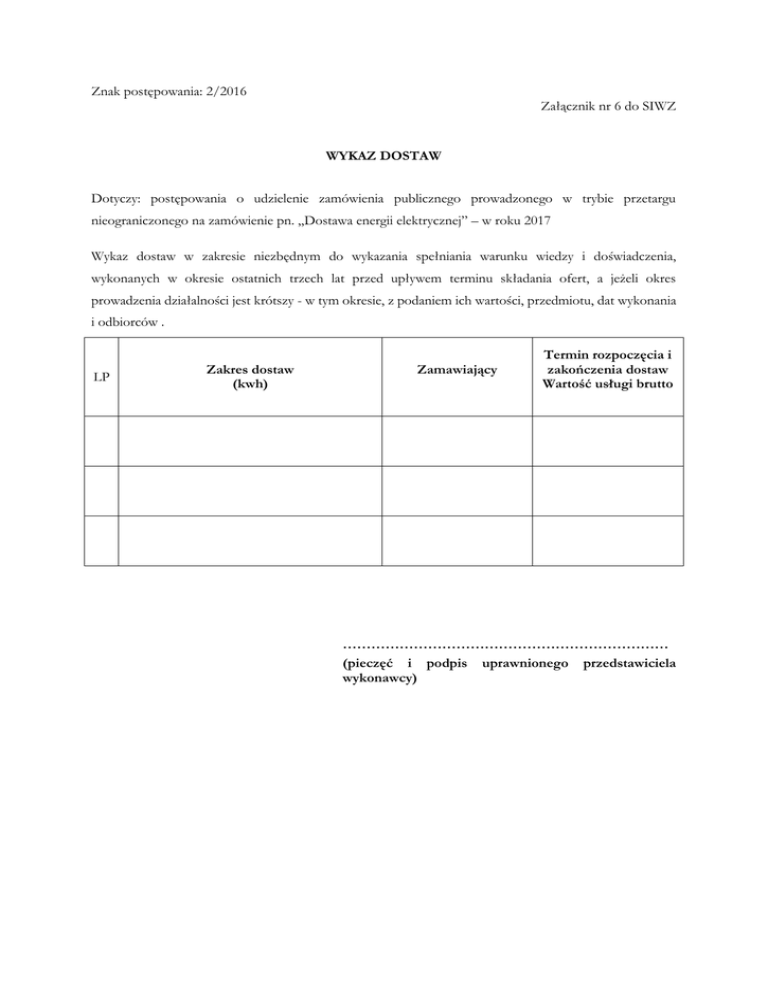 Znak postępowania: 2/2016 Załącznik nr 6 do SIWZ WYKAZ DOSTAW Dotyczy: postępowania o udzielenie zamówienia publicznego prowadzonego w trybie przetargu nieograniczonego na zamówienie pn. „Dostawa energii elektrycznej” – w roku 2017 Wykaz dostaw w zakresie niezbędnym do wykazania spełniania warunku wiedzy i doświadczenia, wykonanych w okresie ostatnich trzech lat przed upływem terminu składania ofert, a jeżeli okres prowadzenia działalności jest krótszy - w tym okresie, z podaniem ich wartości, przedmiotu, dat wykonania i odbiorców . LP Zakres dostaw (kwh) Zamawiający Termin rozpoczęcia i zakończenia dostaw Wartość usługi brutto …………………………………………………………… (pieczęć i podpis uprawnionego przedstawiciela wykonawcy)