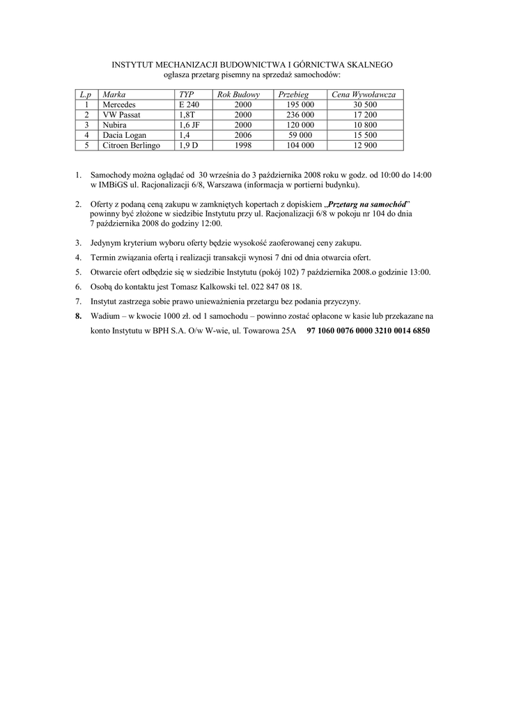 INSTYTUT MECHANIZACJI BUDOWNICTWA I GÓRNICTWA SKALNEGO ogłasza przetarg pisemny na sprzedaż samochodów: L.p 1 2 3 4 5 Marka Mercedes VW Passat Nubira Dacia Logan Citroen Berlingo TYP E 240 1,8T 1,6 JF 1,4 1,9 D Rok Budowy 2000 2000 2000 2006 1998 Przebieg 195 000 236 000 120 000 59 000 104 000 Cena Wywoławcza 30 500 17 200 10 800 15 500 12 900 1. Samochody można oglądać od 30 września do 3 października 2008 roku w godz. od 10:00 do 14:00 w IMBiGS ul. Racjonalizacji 6/8, Warszawa (informacja w portierni budynku). 2. Oferty z podaną ceną zakupu w zamkniętych kopertach z dopiskiem „Przetarg na samochód” powinny być złożone w siedzibie Instytutu przy ul. Racjonalizacji 6/8 w pokoju nr 104 do dnia 7 października 2008 do godziny 12:00. 3. Jedynym kryterium wyboru oferty będzie wysokość zaoferowanej ceny zakupu. 4. Termin związania ofertą i realizacji transakcji wynosi 7 dni od dnia otwarcia ofert. 5. Otwarcie ofert odbędzie się w siedzibie Instytutu (pokój 102) 7 października 2008.o godzinie 13:00. 6. Osobą do kontaktu jest Tomasz Kalkowski tel. 022 847 08 18. 7. Instytut zastrzega sobie prawo unieważnienia przetargu bez podania przyczyny. 8. Wadium – w kwocie 1000 zł. od 1 samochodu – powinno zostać opłacone w kasie lub przekazane na konto Instytutu w BPH S.A. O/w W-wie, ul. Towarowa 25A 97 1060 0076 0000 3210 0014 6850
