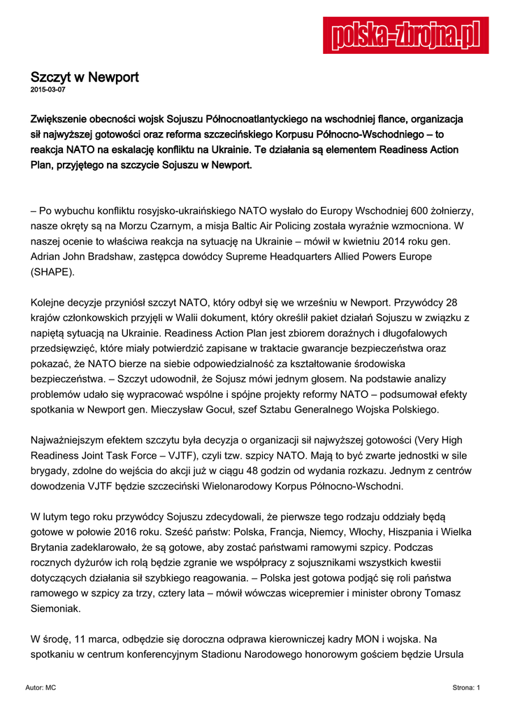Szczyt w Newport 2015-03-07 Zwiększenie obecności wojsk Sojuszu Północnoatlantyckiego na wschodniej flance, organizacja sił najwyższej gotowości oraz reforma szczecińskiego Korpusu Północno-Wschodniego – to reakcja NATO na eskalację konfliktu na Ukrainie. Te działania są elementem Readiness Action Plan, przyjętego na szczycie Sojuszu w Newport. – Po wybuchu konfliktu rosyjsko-ukraińskiego NATO wysłało do Europy Wschodniej 600 żołnierzy, nasze okręty są na Morzu Czarnym, a misja Baltic Air Policing została wyraźnie wzmocniona. W naszej ocenie to właściwa reakcja na sytuację na Ukrainie – mówił w kwietniu 2014 roku gen. Adrian John Bradshaw, zastępca dowódcy Supreme Headquarters Allied Powers Europe (SHAPE). Kolejne decyzje przyniósł szczyt NATO, który odbył się we wrześniu w Newport. Przywódcy 28 krajów członkowskich przyjęli w Walii dokument, który określił pakiet działań Sojuszu w związku z napiętą sytuacją na Ukrainie. Readiness Action Plan jest zbiorem doraźnych i długofalowych przedsięwzięć, które miały potwierdzić zapisane w traktacie gwarancje bezpieczeństwa oraz pokazać, że NATO bierze na siebie odpowiedzialność za kształtowanie środowiska bezpieczeństwa. – Szczyt udowodnił, że Sojusz mówi jednym głosem. Na podstawie analizy problemów udało się wypracować wspólne i spójne projekty reformy NATO – podsumował efekty spotkania w Newport gen. Mieczysław Gocuł, szef Sztabu Generalnego Wojska Polskiego. Najważniejszym efektem szczytu była decyzja o organizacji sił najwyższej gotowości (Very High Readiness Joint Task Force – VJTF), czyli tzw. szpicy NATO. Mają to być zwarte jednostki w sile brygady, zdolne do wejścia do akcji już w ciągu 48 godzin od wydania rozkazu. Jednym z centrów dowodzenia VJTF będzie szczeciński Wielonarodowy Korpus Północno-Wschodni. W lutym tego roku przywódcy Sojuszu zdecydowali, że pierwsze tego rodzaju oddziały będą gotowe w połowie 2016 roku. Sześć państw: Polska, Francja, Niemcy, Włochy, Hiszpania i Wielka Brytania zadeklarowało, że są gotowe, aby zostać państwami ramowymi szpicy. Podczas rocznych dyżurów ich rolą będzie zgranie we współpracy z sojusznikami wszystkich kwestii dotyczących działania sił szybkiego reagowania. – Polska jest gotowa podjąć się roli państwa ramowego w szpicy za trzy, cztery lata – mówił wówczas wicepremier i minister obrony Tomasz Siemoniak. W środę, 11 marca, odbędzie się doroczna odprawa kierowniczej kadry MON i wojska. Na spotkaniu w centrum konferencyjnym Stadionu Narodowego honorowym gościem będzie Ursula Autor: MC Strona: 1 von der Leyen, minister obrony Niemiec. W październiku ubiegłego roku minister obrony narodowej Tomasz Siemoniak brał udział w naradzie wojskowej i cywilnej kadry Bundeswehry w Berlinie. Kierownictwo MON i wojska spotyka się, aby podsumować realizację zadań z ubiegłego roku oraz określić priorytety działania na kolejne lata. Organizacja odprawy w centrum konferencyjnym Stadionu Narodowego będzie pierwszą próbą przed szczytem NATO w 2016 roku, który odbędzie się w Warszawie. Autor: MC Strona: 2