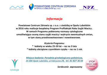 Informacja Powiatowe Centrum Zdrowia sp. z o.o. z siedzibą w Opolu Lubelskim w 2016 roku realizuje bezpłatny Program Profilaktyki Raka Szyjki Macicy . W ramach Programu pobieramy rozmazy cytologiczne umożliwiające ocenę stanu szyjki macicy i wykrycie ewentualnych zmian, w tym stany przednowotworowe i nowotworowe. Kryteria Programu: * kobiety w wieku 25-59 lat – raz na 3 lata * kobiety obciążone czynnikiem ryzyka – raz na 1 rok. Miejsce badania: Poradnia ginekologiczno-położnicza, 24-300 Opole Lubelskie, ul.Fabryczna 24, tel. 81 827 36 64 Serdecznie zapraszamy