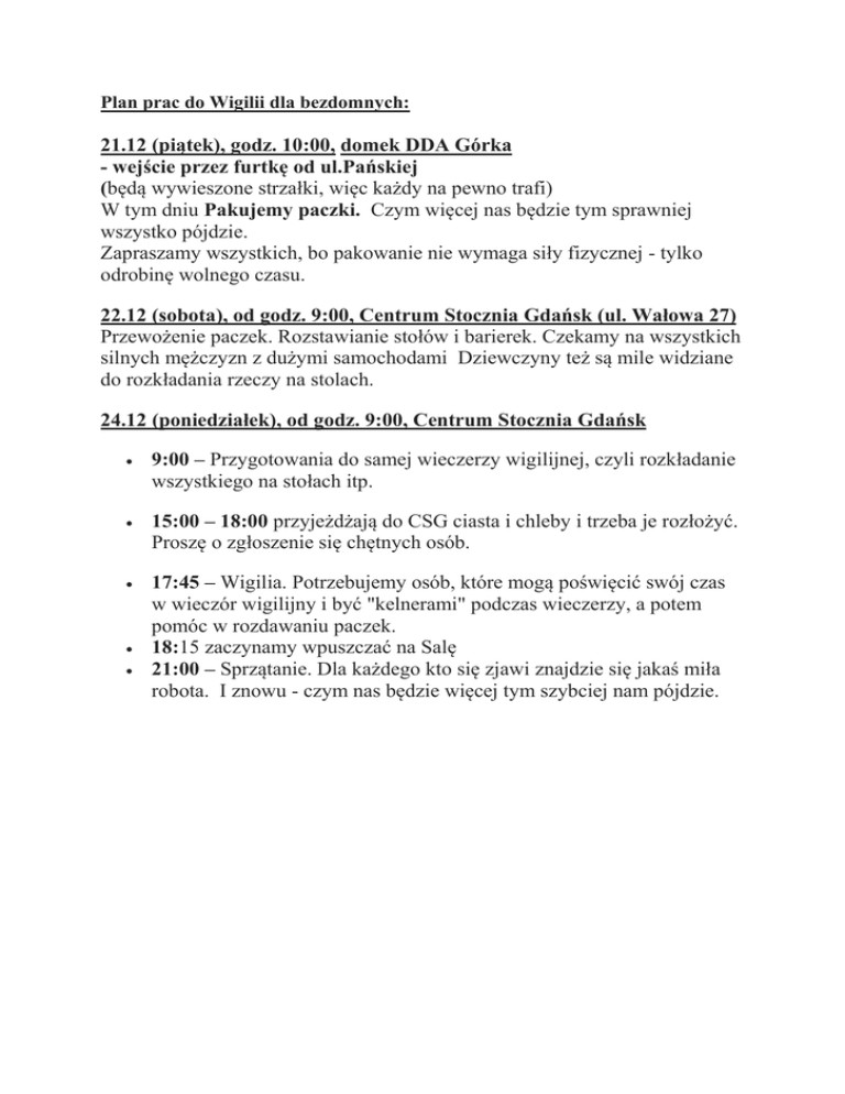 Plan prac do Wigilii dla bezdomnych: 21.12 (piątek), godz. 10:00, domek DDA Górka - wejście przez furtkę od ul.Pańskiej (będą wywieszone strzałki, więc każdy na pewno trafi) W tym dniu Pakujemy paczki. Czym więcej nas będzie tym sprawniej wszystko pójdzie. Zapraszamy wszystkich, bo pakowanie nie wymaga siły fizycznej - tylko odrobinę wolnego czasu. 22.12 (sobota), od godz. 9:00, Centrum Stocznia Gdańsk (ul. Wałowa 27) Przewożenie paczek. Rozstawianie stołów i barierek. Czekamy na wszystkich silnych mężczyzn z dużymi samochodami Dziewczyny też są mile widziane do rozkładania rzeczy na stolach. 24.12 (poniedziałek), od godz. 9:00, Centrum Stocznia Gdańsk 9:00 – Przygotowania do samej wieczerzy wigilijnej, czyli rozkładanie wszystkiego na stołach itp. 15:00 – 18:00 przyjeżdżają do CSG ciasta i chleby i trzeba je rozłożyć. Proszę o zgłoszenie się chętnych osób. 17:45 – Wigilia. Potrzebujemy osób, które mogą poświęcić swój czas w wieczór wigilijny i być "kelnerami" podczas wieczerzy, a potem pomóc w rozdawaniu paczek. 18:15 zaczynamy wpuszczać na Salę 21:00 – Sprzątanie. Dla każdego kto się zjawi znajdzie się jakaś miła robota. I znowu - czym nas będzie więcej tym szybciej nam pójdzie.