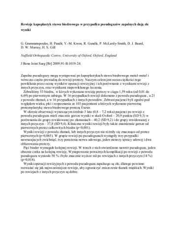 Rewizje kapoplastyk stawu biodrowego w przypadku pseudoguzów zapalnych dają złe wyniki G. Grammatopoulos, H. Pandit, Y.-M. Kwon, R. Gundle, P. McLardy-Smith, D. J. Beard, D. W. Murray, H. S. Gill Nuffield Orthopaedic Centre, University of Oxford, Oxford, England J Bone Joint Surg [Br] 2009;91-B:1019-24. Zapalne pseudoguzy mogą występować po kapoplastykach stawu biodrowego metal- metal i wówczas częśto prowadzą do rewizji protezy. Naszym celem jest ocean ciężkości tego powikłania przez ocenę wyników operacji rewizyjnej i ich porównanie z wynikami rewizji z innych przyczyn, oraz wynikami niepowikłanego leczenia. Zebraliśmy 53 biodra, w kórych wykonano rewizję protezy w ciągu 1,59 roku (od 0,01 do 6,69) po pierwotnym zabiegu. W 16 przypadkach rewizji doko nano z powodu pseudoguza , u 21 z powodu złamań, a w 16 przypadkach z innych powodów. Zebrani pacjenci byli zgodni pod względem wieku, płci i rozpoznania ze 103 pacjentami u których wykonano pierwotną protezoplastykę stawu biodrowego protezą Exeter. W okresie obserwacji wynoszącym średnio 3 lata (0,8 – 7,2 roku) pacjenci po rewizji z powodu pseudoguza mieli znacznie gorsze wyniki w skali Oxford – 20,9 punkta (SD 9,3) w porównaniu do grupy rewidowanej po złamaniach – 40,2 (SD 9,2) i do grupy rewidowanej z innych przyczyn – 37,8 (SD 9,4). Kliniczne wyniki rewizji były także znamiennie gorsze od pierwotnych protez całkowitych biodra (p<0,001). Wyniki rewizji z powodu złamań, lub innych przyczyn nie różniły się znaczoąco od protez pierwotnych (p=0,065). W grupie rewizji po pseudoguzach wystąpiły trzy przypadki nawracajacych zwichnięć, trzy porażenia nerwu udowego, jeden stenozy tętnicy udowej i dwa obluzowania protezy. Pięć bioder wymagało kolejnej rewizji. W trzech z nich stwierdzono nawrót pseudoguza, jeden obecnie czeka na kolejną rewizję. Występowanie poważnych komplikacji po rewizji z powodu pseudoguza wyniosło 50 % i było znacznie wyższe niż po rewizjach z innych przyczyn (14 %) (p=0,018). Wyniki operacji rewizyjnych z powodu pseudoguza zapalnego są złe, d latego powinno rozważać się jak najwcześniejsze rewizje, aby ograniczyć zniszczenie tkanek miękkich. Wyniki po rewizjach z innych przyczyn są dobre.