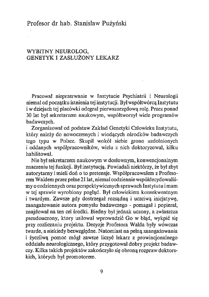 Profesor dr hab. Stanisław Pużyński WYBITNY NEUROLOG, GENETYK I ZASŁUŻONY LEKARZ Pracowal nieprzerwanie w Instytucie Psychiatrii i Neurologii niemal od początku istnienia tej instytucji. Bylwspóltwórcą Instytutu i w dziejach tej placówki odegrał pierwszorzędową rolę. Przez ponad 30 lat był sekretarzem naukowym, współtworzył wiele programów badawczych. Zorganizował od podstaw Zakład Genetyki Człowieka Instytutu, który należy do nowoczesnych i wiodących ośrodków badawczych tego typu w Polsce. Skupił wokół siebie grono uzdolnionych i oddanych współpracowników, wielu z nich doktoryzował, kilku habilitował. Nie był sekretarzem naukowym w dosłownym, konwencjonalnym znaczeniu tej funkcji. Był instytucją. Powiadali niektórzy, że był zbyt autorytarny i mieli doń o to pretensje. Współpracowałem z Profesorem Waldem przez pełne 21 lat, niemal codziennie współdecydowaliś my O codziennych oraz perspektywicznych sprawach Instytutu i mam w tej sprawie wyrobiony pogląd. Był człowiekiem konsekwentnym i twardym. Zawsze gdy dostrzegał rozsądną i uczciwą inicjatywę, zaangażowanie autora pomysłu badawczego - pomagał i popierał, znajdował na ten cel środki. Biedny był jednak uczony, a zwłaszcza pseudouczony, ktory usiłował wprowadzić Go w błąd, wykpić się przy rozliczaniu projektu. Decyzje Profesora Wałda były wówczas twarde, a niekiedy bezwzględne. Natomiast na pełną zaangażowania i życzliwą pomoc mógl zawsze liczyć lekarz z prowincjonalnego oddziału neurologicznego, który przygotował dobry projekt badawczy. Kilka takich projektów zakończyło się obroną rozpraw doktorskich, których był promotorem. 9 Był uczonym wszechstronnie wykształconym, o szerokim zakresie zainteresowań, wykraczających znacznie poza obręb ściśle profesjonalny. Był autorem blisko 150 publikacji. Pracę doktorską poświęcił afazji u poliglotów, rozprawę habilitacyjną - zwyrodnieniu wątrobowo-soczewkowemu. Wraz ze współpracownikami duży cykl prac poświęcił temu schorżeniu, w tym aspektom metabolicznym choroby Wilsona. Badał uwarunkowania genetyczne, społeczne i epidemiologiczne upośledzenia umysłowego, jest autorem wartoś ciowych prac badawczych dotyczących alkoholu. Miał doskonałą, encyklopedyczną pamięć, w której zakodowany był olbrzymi zakres wiedzy. Wiedząco tym korzystaliśmy z tej pamięci jak z encyklopedii. On jeden był w staI;lie bez trudu przytoczyć opisy niemal wszystkich rzadkich zespołów chorobowych. Jako badacz i organizator nauki wypełniał białe plamy na polu badań naukowych, zajmował się trudnymi i mało popularnymi, pomijanymi lub lekceważonymi przez innych problemami badawczymi i społecznymi. Jedną z takich białych plam były zagadnienia związane z upośledzeniem umysłowym. Inicjował pierwsze w Polsce kompleksowe badania, inspirował innych, zapoczątkował społeczne działania na rzecz osób upośledzonych, skupił wokół siebie grono zaangażowanych badaczy i działaczy. Konsekwentne działanie i uporczywe starania Profesora Walda zaowocowały w latach 70-tych zgodą władz na ustanowienie specjalnego centralnego programu badań dotyczących społecznych i zdrowotnych aspektów używania alkoholu. Program ten, którym kierował ponad 10 lat, zaowocował powstaniem kilkunastu zespołów badawczych i licznymi oryginalnymi pracami o dużej randze społecz nej i medycznej. Pod Jego kierunkiem opracowano dwa obszerne raporty o sytuacji w Polsce związanej z piciem alkoholu, skierowano je do ówczesnych władz państwowych. Działalność Profesora Walda nie zawsze spotykała się z uznaniem władz państwowych. Przełom lat 60-tych i 70-tych i lata 70-te były dlań trudne. Na tytuł profesora nadzwyczajnego oczekiwal od podjęcia uchwały Rady Naukowej Instytutu II lat. Utrudni~nia, jakie napotykał i próby skłonienia Go do wyjazdu nie powiodły się. Pozostał w Kraju. Doceniało Go zawsze środowisko naukowe, o czym świadczą liczne członkostwa honorowe towarzystw krajowych i zagranicznych i pełnione w nich funkcje. 10 Profesor Ignacy Wald był cenionym i często wykorzystywanym ekspertem Światowej Organizacji Zdrowia. Jego pozycja w tej organizacji niewątpliwie torowała drogę do wskazania Instytutu Psychiatrii i Neurologii w Warszawie jako ośrodka współpracy z WHO (collaborative center), zaś upór i wytrwałość w załatwianiu skomplikowanych formalności zaowocowały uzyskaniem przez Instytut odpowiedniej nominacji. Był dobrym lekarzem, pomagał wszystkim, którzy zgłaszali się do Niego o pomoc. Budziło to niekiedy zniecierpliwienie i protesty tych, którym zlecał badania, konsultacje. Był w takich sytuacjach nieustęp liwy . Twierdził, że pacjent zgłaszający się do Instytutu nie może odejść nie uzyskawszy pomocy lub porady. Brak formalnego skierowania nie usprawiedliwiał w Jego przekonaniu odmowy pomocy. Był wymagający wobec siebie. Ostre wymogi, które stawiał sobie budziły w latach ostatnich nasz niepokój i niekiedy protesty. Wiedzieliśmy, że nadmiar obowiązków nie sprzyja Jego zdrowiu a wręcz szkodzi. W realizacji swoich zadań życiowych i obowiązków, których się podjął był konsekwentny i uparty, argumenty zaś osób bliskich jak gdyby doń nie docierały, zbywał je milczeniem, bądź pobłażliwym uśmiechem i robił swoje. Odszedł od nas niepospolity lekarz i uczony, który dobrze zapisał się w najnowszych dziejach polskiej neurologii, neurogenetyki i pśy chiatrii. Będzie Go nam brak. Cześć Jego pamięci. 11