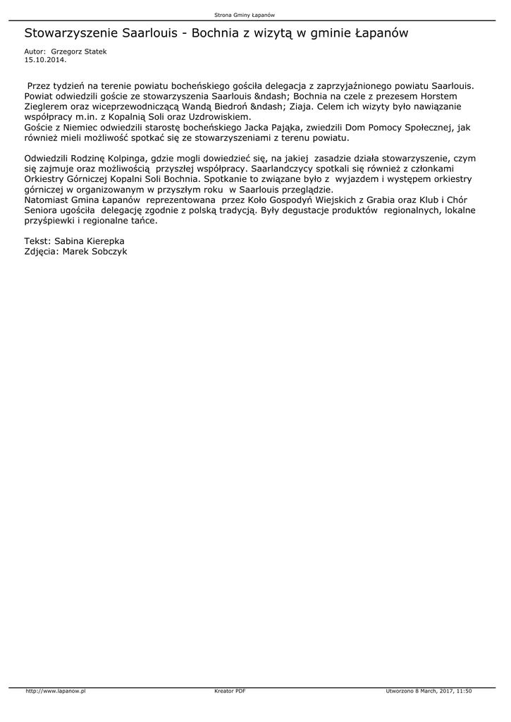 Strona Gminy Łapanów Stowarzyszenie Saarlouis - Bochnia z wizytą w gminie Łapanów Autor: Grzegorz Statek 15.10.2014. Przez tydzień na terenie powiatu bocheńskiego gościła delegacja z zaprzyjaźnionego powiatu Saarlouis. Powiat odwiedzili goście ze stowarzyszenia Saarlouis – Bochnia na czele z prezesem Horstem Zieglerem oraz wiceprzewodniczącą Wandą Biedroń – Ziaja. Celem ich wizyty było nawiązanie współpracy m.in. z Kopalnią Soli oraz Uzdrowiskiem. Goście z Niemiec odwiedzili starostę bocheńskiego Jacka Pająka, zwiedzili Dom Pomocy Społecznej, jak również mieli możliwość spotkać się ze stowarzyszeniami z terenu powiatu. Odwiedzili Rodzinę Kolpinga, gdzie mogli dowiedzieć się, na jakiej zasadzie działa stowarzyszenie, czym się zajmuje oraz możliwością przyszłej współpracy. Saarlandczycy spotkali się również z członkami Orkiestry Górniczej Kopalni Soli Bochnia. Spotkanie to związane było z wyjazdem i występem orkiestry górniczej w organizowanym w przyszłym roku w Saarlouis przeglądzie. Natomiast Gmina Łapanów reprezentowana przez Koło Gospodyń Wiejskich z Grabia oraz Klub i Chór Seniora ugościła delegację zgodnie z polską tradycją. Były degustacje produktów regionalnych, lokalne przyśpiewki i regionalne tańce. Tekst: Sabina Kierepka Zdjęcia: Marek Sobczyk http://www.lapanow.pl Kreator PDF Utworzono 8 March, 2017, 11:50