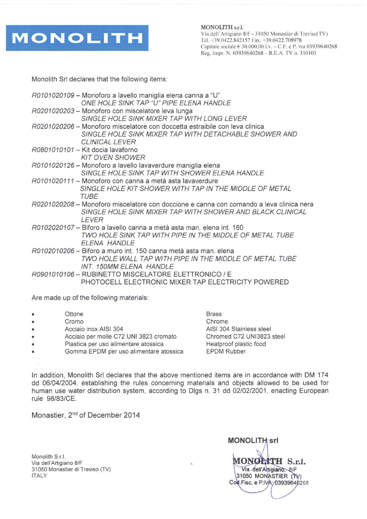 TŁUMACZENIE MONOLITH s.r.l. Via dell’Artigiano 8/F - 31050 Monastier di Treviso(TV) Tel. +39.0422.842157 Fax. +39.0422.708978 Capitale sociale € 30.000.00 i.v. - C.F. e.P. iva 03939640268 Rep. Impr. N. 03939640268 - R.E.A. TV n. 310101 Firma Monolith Srl deklaruje, że wymienione pozycje: R0101020109 - Monoforo a lavello maniglia elena canna a „U” 651102 BATERIA SZTORCOWA R0201020203- Monoforo con miscelatore leva lunga 651112 BATERIA UMYWALKOWA R0201020206 - Monoforo miscelatore con doccetta estraibile con leva clinica 651113 BATERIA UMYWALKOWA Z PRYSZNICEM R0801010101 - Kit docia lavaforno ZESTAW PRYSZNICOWY DO PIECA R0101020126- Monoforo a lavello lavaverdure maniglia elena 651513 NAPEŁNIACZ BEZ WYLEWKI R0101020111 - Monoforo con canna a meta asta lavaverdure 651524 NAPEŁNIACZ Z WYLEWKĄ R0201020208 - Monoforo miscelatore con doccione e canna con comando a leva clinica nera 651525 NAPEŁNIACZ Z WYLEWKĄ ŁOKCIOWY R0102020107-Btiwo a lavello canna a meta asta man. elena int. 160 NAPEŁNIACZ Z WYLEWKĄ DWUOTWOROWY R0102010206 - Biforo a muro int. 150 canna meta asta man. elena 651543 NAPEŁNIACZ Z WYLEWKĄ DWUOTWOROWY MONTOWANY DO ŚCIANY R0901010106 – RUBINETTO MISCELATORE ELETTRONICO / E BATERIA UMYWALKOWA NA FOTO-KOMÓRKĘ Wykonane zostały z wymienionych materiałów: • • • • • • Mosiądz Chrom Stal nierdzewna AISI 304 Stal chromowana C72 UNI3823 Żaroodporne tworzywo sztuczne Guma EPDM Ponadto, Monolith Sri oświadcza, że wyżej wymienione elementy są zgodne z DM 174 dd 04.06.2004, ustanawiającego przepisy dotyczące materiałów i przedmiotów mogących być użyte w systemach dystrybucji wody , zgodnie z Dfgs n. 31 dcf 02.02.2001, ustanowienia normy Europejskiej 98/83/CE. Monastier, 02 grudzień 2014 Monolith S.r.l. Via dell’Artigiano 8/F 31050 Monastier di Treviso (TV) WŁOCHY Wpis do rejestru: XIII Wydział Gospodarczy Krajowego Rejestru Sadowego, KRS 0000010073, NIP 952-18-66-652, Kapitał zakładowy PLN 150.000,- Stalgast sp. z o.o. ul. Staniewicka 5 03-310 Warszawa tel.: 22 517 15 75 fax: 22 517 15 77 www.stalgast.com email: [email protected]