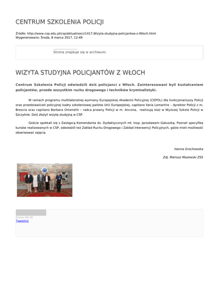 CENTRUM SZKOLENIA POLICJI Źródło: http://www.csp.edu.pl/csp/aktualnosci/1417,Wizyta-studyjna-policjantow-z-Wloch.html Wygenerowano: Środa, 8 marca 2017, 12:49 Strona znajduje się w archiwum. WIZYTA STUDYJNA POLICJANTÓW Z WŁOCH Centrum Szkolenia Policji odwiedzili dziś policjanci z Włoch. Zainteresowani byli kształceniem policjantów, przede wszystkim ruchu drogowego i techników kryminalistyki. W ramach programu multilateralnej wymiany Europejskiej Akademii Policyjnej (CEPOL) dla funkcjonariuszy Policji oraz przedstawicieli policyjnej kadry szkoleniowej państw Unii Europejskiej, capitano Ilaria Lomartire – dyrektor Policji z m. Brescia oraz capitano Barbara Omenetti – radca prawny Policji w m. Ancona, realizują staż w Wyższej Szkole Policji w Szczytnie. Dziś złożyli wizytę studyjną w CSP. Goście spotkali się z Zastępcą Komendanta ds. Dydaktycznych mł. insp. Jarosławem Gałuszką. Poznali specyfikę kursów realizowanych w CSP, odwiedzili też Zakład Ruchu Drogowego i Zakład Interwencji Policyjnych, gdzie mieli możliwość obserwować zajęcia. Hanna Grochowska Zdj. Mariusz Mazewski ZSS Ocena: 0/5 (0) Tweetnij
