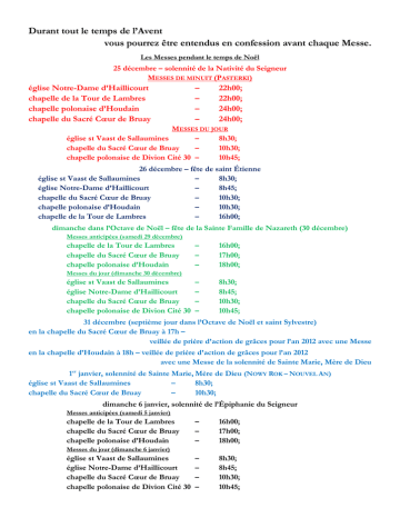 Durant tout le temps de l’Avent vous pourrez être entendus en confession avant chaque Messe. Les Messes pendant le temps de Noël 25 décembre – solennité de la Nativité du Seigneur MESSES DE MINUIT (PASTERKI) église Notre-Dame d’Haillicourt chapelle de la Tour de Lambres chapelle polonaise d’Houdain chapelle du Sacré Cœur de Bruay – – – – 22h00; 22h00; 24h00; 24h00; MESSES DU JOUR église st Vaast de Sallaumines – 8h30; chapelle du Sacré Cœur de Bruay – 10h30; chapelle polonaise de Divion Cité 30 – 10h45; 26 décembre – fête de saint Étienne église st Vaast de Sallaumines – 8h30; église Notre-Dame d’Haillicourt – 8h45; chapelle du Sacré Cœur de Bruay – 10h30; chapelle polonaise d’Houdain – 10h30; chapelle de la Tour de Lambres – 16h00; dimanche dans l’Octave de Noël – fête de la Sainte Famille de Nazareth (30 décembre) Messes anticipées (samedi 29 décembre) chapelle de la Tour de Lambres chapelle du Sacré Cœur de Bruay chapelle polonaise d’Houdain – – – 16h00; 17h00; 18h00; – – – – 8h30; 8h45; 10h30; 10h45; Messes du jour (dimanche 30 décembre) église st Vaast de Sallaumines église Notre-Dame d’Haillicourt chapelle du Sacré Cœur de Bruay chapelle polonaise de Divion Cité 30 31 décembre (septième jour dans l’Octave de Noël et saint Sylvestre) en la chapelle du Sacré Cœur de Bruay à 17h – veillée de prière d’action de grâces pour l’an 2012 avec une Messe en la chapelle d’Houdain à 18h – veillée de prière d’action de grâces pour l’an 2012 avec une Messe de la solennité de Sainte Marie, Mère de Dieu 1er janvier, solennité de Sainte Marie, Mère de Dieu (NOWY ROK – NOUVEL AN) église st Vaast de Sallaumines – 8h30; chapelle du Sacré Cœur de Bruay – 10h30; dimanche 6 janvier, solennité de l’Épiphanie du Seigneur Messes anticipées (samedi 5 janvier) chapelle de la Tour de Lambres chapelle du Sacré Cœur de Bruay chapelle polonaise d’Houdain – – – 16h00; 17h00; 18h00; – – – – 8h30; 8h45; 10h30; 10h45; Messes du jour (dimanche 6 janvier) église st Vaast de Sallaumines église Notre-Dame d’Haillicourt chapelle du Sacré Cœur de Bruay chapelle polonaise de Divion Cité 30 Msze Święte w okresie Narodzenia Pańskiego (od Pasterek do Mszy w uroczystość Objawienia Pańskiego) 25 grudnia – uroczystość Narodzenia Pańskiego PASTERKI (MSZE ŚWIĘTE W NOC BOŻEGO NARODZENIA) kościół Notre-Dame w Haillicourt – godz. 2200; kaplica Tour de Lambres (Bruay-Miasto) – godz. 2200; kaplica polska w Houdain – godz. 2400; kaplica Najświętszego Serca Pana Jezusa w Bruay La Buissière – godz. 2400; MSZE ŚWIĘTE W DZIEŃ BOŻEGO NARODZENIA kościół st Vaast w Sallaumines – godz. 830; kaplica Najświętszego Serca Pana Jezusa w Bruay La Buissière – godz. 1030; kaplica polska w Divion Cité 30 – godz. 1045; 26 grudnia – święto św. Szczepana, diakona i pierwszego męczennika kościół st Vaast w Sallaumines – godz. 830; kościół Notre-Dame w Haillicourt – godz. 845; kaplica Najświętszego Serca Pana Jezusa w Bruay La Buissière – godz. 1030; kaplica polska w Houdain – godz. 1030; kaplica Tour de Lambres (Bruay-Miasto) – godz. 1600; niedziela w Oktawie Narodzenia Pańskiego – święto Świętej Rodziny z Nazaretu (30 grudnia) Msze antycypowane (w sobotę 29 grudnia) kaplica Tour de Lambres (Bruay-Miasto) – godz. 1600; kaplica Najświętszego Serca Pana Jezusa w Bruay La Buissière – godz. 1700; kaplica polska w Houdain – godz. 1800; Msze «ipsa dies» (w niedzielę 30 grudnia) kościół st Vaast w Sallaumines – godz. 830; kościół Notre-Dame w Haillicourt – godz. 845; kaplica Najświętszego Serca Pana Jezusa w Bruay La Buissière – godz. 1030; kaplica polska w Divion Cité 30 – godz. 1045; 31 grudnia (siódmy dzień w Oktawie Narodzenia Pańskiego i ostatni dzień roku) w kaplicy Najświętszego Serca Pana Jezusa w Bruay La Buissière o godz. 1700 – nabożeństwo dziękczynno-przebłagalne za mijający rok i Msza Święta w kaplicy polskiej NMP Królowej świata w Houdain o godz. 1800 – nabożeństwo dziękczynno-przebłagalne za mijający rok oraz Msza Święta ‘wigilijna’ z uroczystość Świętej Bożej Rodzicielki Maryi 1 stycznia, uroczystość Świętej Bożej Rodzicielki Maryi (NOWY ROK – NOUVEL AN) kościół st Vaast w Sallaumines – godz. 830; kaplica Najświętszego Serca Pana Jezusa w Bruay La Buissière – godz. 1030; 6 stycznia, uroczystość Objawienia Pańskiego Msze antycypowane (w sobotę 5 stycznia) kaplica Tour de Lambres (Bruay-Miasto) – godz. 1600; kaplica Najświętszego Serca Pana Jezusa w Bruay La Buissière – godz. 1700; kaplica polska w Houdain – godz. 1800; Msze «ipsa dies» (w niedzielę 6 stycznia) kościół st Vaast w Sallaumines – godz. 830; kościół Notre-Dame w Haillicourt – godz. 845; kaplica Najświętszego Serca Pana Jezusa w Bruay La Buissière – godz. 1030; kaplica polska w Divion Cité 30 – godz. 1045;