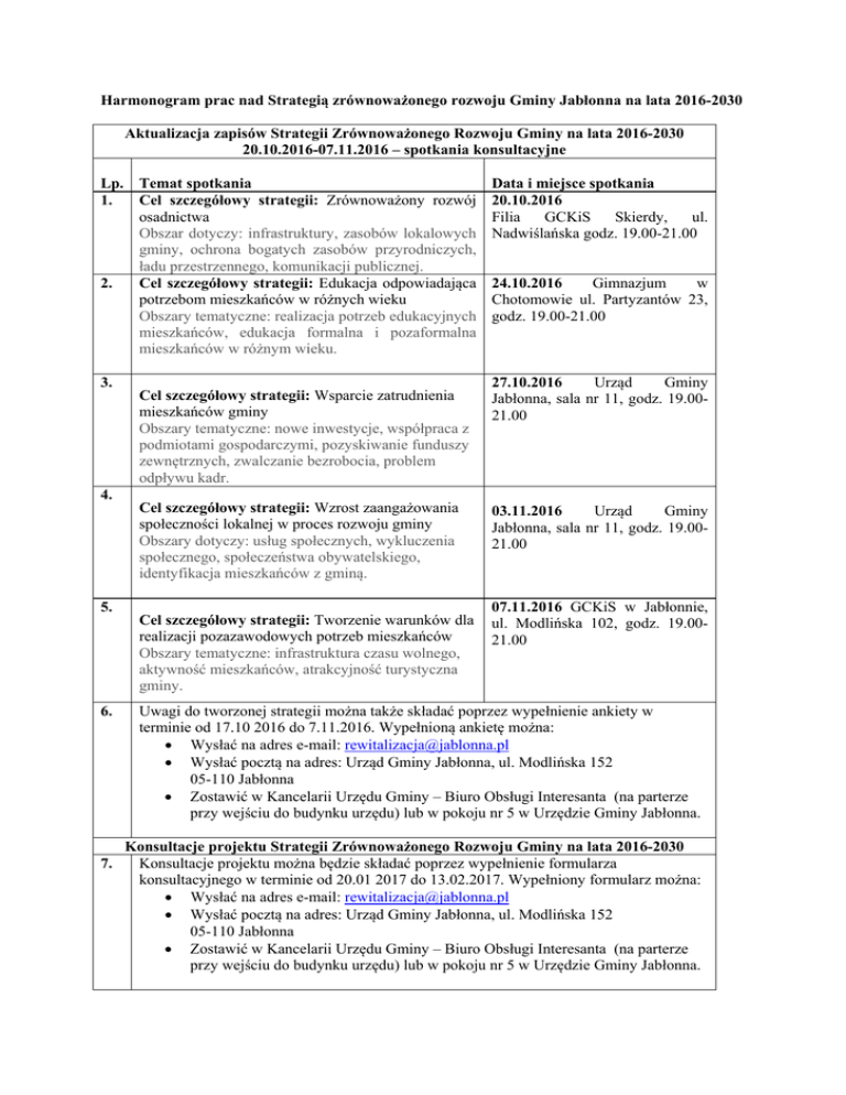 Harmonogram prac nad Strategią zrównoważonego rozwoju Gminy Jabłonna na lata 2016-2030 Aktualizacja zapisów Strategii Zrównoważonego Rozwoju Gminy na lata 2016-2030 20.10.2016-07.11.2016 – spotkania konsultacyjne Lp. Temat spotkania Cel szczegółowy strategii: Zrównoważony rozwój 1. osadnictwa Obszar dotyczy: infrastruktury, zasobów lokalowych gminy, ochrona bogatych zasobów przyrodniczych, ładu przestrzennego, komunikacji publicznej. Cel szczegółowy strategii: Edukacja odpowiadająca 2. potrzebom mieszkańców w różnych wieku Obszary tematyczne: realizacja potrzeb edukacyjnych mieszkańców, edukacja formalna i pozaformalna mieszkańców w różnym wieku. 3. 4. 5. 6. Cel szczegółowy strategii: Wsparcie zatrudnienia mieszkańców gminy Obszary tematyczne: nowe inwestycje, współpraca z podmiotami gospodarczymi, pozyskiwanie funduszy zewnętrznych, zwalczanie bezrobocia, problem odpływu kadr. Cel szczegółowy strategii: Wzrost zaangażowania społeczności lokalnej w proces rozwoju gminy Obszary dotyczy: usług społecznych, wykluczenia społecznego, społeczeństwa obywatelskiego, identyfikacja mieszkańców z gminą. Cel szczegółowy strategii: Tworzenie warunków dla realizacji pozazawodowych potrzeb mieszkańców Obszary tematyczne: infrastruktura czasu wolnego, aktywność mieszkańców, atrakcyjność turystyczna gminy. Data i miejsce spotkania 20.10.2016 Filia GCKiS Skierdy, ul. Nadwiślańska godz. 19.00-21.00 24.10.2016 Gimnazjum w Chotomowie ul. Partyzantów 23, godz. 19.00-21.00 27.10.2016 Urząd Gminy Jabłonna, sala nr 11, godz. 19.0021.00 03.11.2016 Urząd Gminy Jabłonna, sala nr 11, godz. 19.0021.00 07.11.2016 GCKiS w Jabłonnie, ul. Modlińska 102, godz. 19.0021.00 Uwagi do tworzonej strategii można także składać poprzez wypełnienie ankiety w terminie od 17.10 2016 do 7.11.2016. Wypełnioną ankietę można: Wysłać na adres e-mail: [email protected] Wysłać pocztą na adres: Urząd Gminy Jabłonna, ul. Modlińska 152 05-110 Jabłonna Zostawić w Kancelarii Urzędu Gminy – Biuro Obsługi Interesanta (na parterze przy wejściu do budynku urzędu) lub w pokoju nr 5 w Urzędzie Gminy Jabłonna. Konsultacje projektu Strategii Zrównoważonego Rozwoju Gminy na lata 2016-2030 Konsultacje projektu można będzie składać poprzez wypełnienie formularza 7. konsultacyjnego w terminie od 20.01 2017 do 13.02.2017. Wypełniony formularz można: Wysłać na adres e-mail: [email protected] Wysłać pocztą na adres: Urząd Gminy Jabłonna, ul. Modlińska 152 05-110 Jabłonna Zostawić w Kancelarii Urzędu Gminy – Biuro Obsługi Interesanta (na parterze przy wejściu do budynku urzędu) lub w pokoju nr 5 w Urzędzie Gminy Jabłonna.