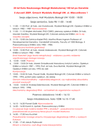 25 lat Koła Naukowego Biologii Molekularnej 150 lat po Darwinie 5 styczeń 2009, Gmach Wydziału Biologii UW, ul. Miecznikowa 1 Sesja zdjęciowa, Hall Wydziału Biologii UW 10:00 - 18:00 Sesja seniorów, Sala 9B 11:00 - 14:40 1. 11:00 - 11:05 Prof. dr hab. Jan Kwiatowski, Wydział Biologii UW, Opiekun KNBM w latach 1982 – 1987 Wprowadzenie 2. 11:05 - 11:10 Wojtek Michalski, PhD CSIRO, pierwszy opiekun KNBM, Dr hab. Maciek Garstka, Wydział Biologii UW, Członek założyciel KNBM Jak to się wszystko zaczęło 3. 11:10 - 12:00 Lila Solnica-Krężel PhD, Martha Rivers Ingram Professor of Developmental Genetics, Vanderbilt University, Faculty of 1000 Biology, II Przewodnicząca KNBM, lata 1983 - 1984. Genetyczna kontrola gastrulacji 4. 12:00 - 12:50 Prof. dr hab. Marek Maleszewski, Wydział Biologii UW, Członek KNBM w latach 1982 - 1984 Ernst Haeckel i jego teoria rekapitulacji - widziane z punktu widzenia współczesnego biologa rozwoju 5. 12:50 - 13:00 Przerwa 6. 13:00 - 13:05 Dr hab. Marek Gniadkowski Narodowy Instytut Leków, Opiekun KNBM w latach 1987 – 1992; Prof. dr hab. Ewa Bartnik, Wydział Biologii UW, Opiekun KNBM od roku 1992 do dziś Kontynuacja 7. 13:05 - 13:55 Dr hab. Paweł Golik, Wydział Biologii UW, Członek KNBM w latach 1990 - 1994, potem jako opiekun, do dzisiaj Genom mitochondrialny - najbardziej elegancki, czy najbardziej absurdalny produkt ewolucji? 8. 13:55 - 14:45 Dr Andrzej Dziembowski, Wydział Biologii UW, Członek KNBM w latach 1995 - 1998. Mechanizmy degradacji RNA - od bakterii do organizmów wyższych Przerwa obiadowa 14:40 – 16:15 Sesja młodzieżowa, Sala 103B 16.15-17.45 1. 16:15 - 16:20 Paweł Golik Wprowadzenie 2. 16:20 - 16:50 Kamil A. Lipiński, Przewodniczący KNBM Co jeszcze kryje rodzina białek PPR u drożdży? – poszukiwania nowych przedstawicieli za pomocą iteracyjnych modeli Markowa 3. 16:50 - 17:20 Iwo Kuciński Poszukiwanie nowego enzymu inicjującego degradację mRNA u wyższych Eukarya 4. 17:20 - 17:45 Jakub Piątkowski Klinem w Darwina, czyli długi marsz kreacjonistów