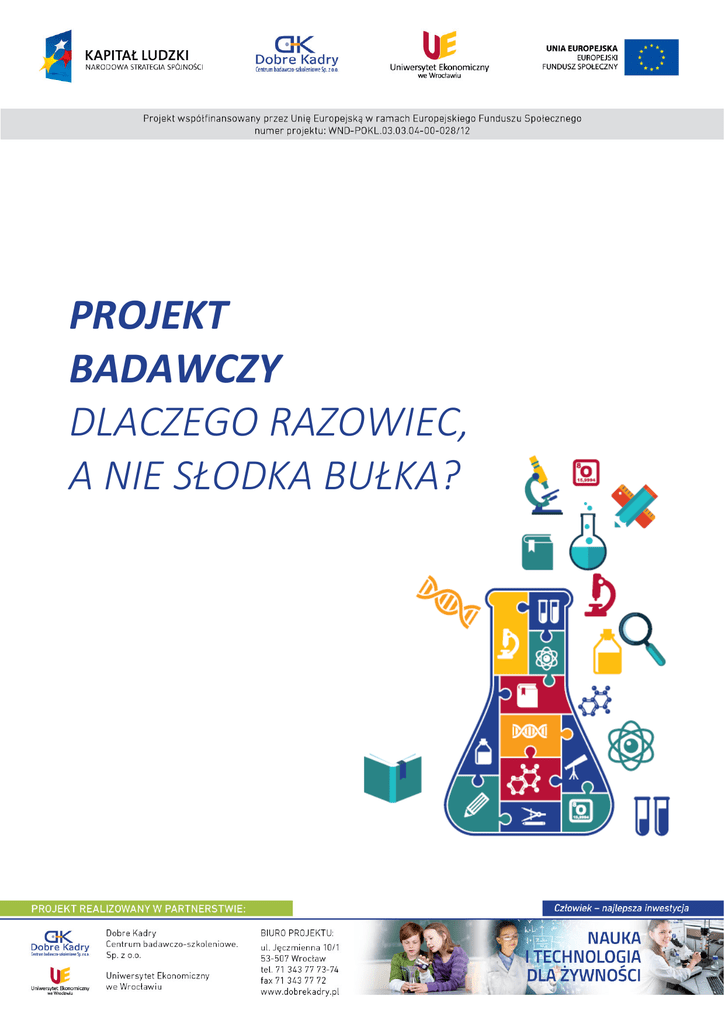 PROJEKT BADAWCZY DLACZEGO RAZOWIEC, A NIE SŁODKA BUŁKA? 1 Nauka i technologia dla żywności liceum Tytuł projektu Dlaczego razowiec, a nie słodka bułka? Wprowadzenie Chleb wymieniany jest wśród elementarnych posiłków człowieka w najstarszych źródłach historii kultury materialnej Europy i Bliskiego Wschodu, znany jest od co najmniej 10–11 tysięcy lat; stanowi jeden z podstawowych składników codziennej diety człowieka. Chleb odgrywa również istotną rolę kultową (wzmianki o tym znajdują się na przykład w Starym Testamencie) i kulturowosymboliczną. Znany był już w starożytności: w Babilonii i Asyrii, Egipcie, Izraelu, Grecji oraz cesarstwie rzymskim. Prawdopodobnie pierwszym chlebem było pieczywo zbożowe w postaci ugotowanej pasty, która była mieszanką różnych zbóż i wody. Najstarszy chleb, jaki udało się odnaleźć archeologom pochodzi z Krety, a jego wiek określa się na 6100 lat. Początkowo bochenki były płaskie i twarde. W dzisiejszych czasach uznano by zapewne, że nie nadają się do jedzenia. Czy kiedyś taki chleb smakował ludziom? Jeśli nie, to na pewno zaspokajał ich głód. Dopiero Egipcjanie około 2600 lat p.n.e. wpadli na to, w jaki sposób uczynić chleb pulchnym. To oni ponad 4000 lat temu po raz pierwszy upiekli chleb na zakwasie. Pieczywo było jest i będzie ważnym składnikiem naszej codziennej diety. Jedyny problem - co wybrać? Białą pachnącą bułę, chrupiącą grahamkę a może razowy chleb? Cel projektu Sesja popularno - naukowa: Sztuka wyboru – słodka bułeczka czy razowego kromeczka? Cele kształcenia i wychowania - Poszerzenie wiedzy na temat głównych składników używanych do wypieku pieczywa oraz wpływu na zdrowie człowieka substancji wchodzących w skład produktów zbożowych. - Wyjaśnienie zjawisk zachodzących podczas wypieku chleba. - Wdrażanie zasad zdrowego odżywiania. - Poszerzenie wiedzy na temat objawów i patomechanizmu chorób wynikających z zaburzenia odżywiania. - Wyzwalanie kreatywności i umacnianie wiary we własne możliwości. - Rozwijanie umiejętności planowania, wykonywania i dokumentowania doświadczeń. - Rozwijanie umiejętności korzystania z różnych źródeł informacji. - Doskonalenie umiejętności pracy zespołowej, logicznego myślenia, efektywnego komunikowania się w różnych sytuacjach. - Doskonalenie umiejętności prezentacji efektów swojej pracy. Pytanie kluczowe Dlaczego powinno spożywać się pieczywo razowe, a nie tzw. białe i słodkie? 2 Etapy projektu Etapy Przygotowanie Planowanie Realizacja Działania 1. Zapoznanie uczniów z tematyką i problemami, które podejmowane będą w trakcie realizacji projektu (temat, cele, zasady i formy pracy, metody, proponowane działania). 2. Podział uczniów na zespoły problemowe (tematyczne). 3. Przydział funkcji w zespołach, wybór liderów. Omówienie obowiązków lidera i członków poszczególnych grup. 4. Ustalenie zadań dla zespołów. 1. Omówienie zadań, form pracy (samodzielne wyszukiwanie i gromadzenie materiałów, informacji w szkole i w domu, korzystanie z biblioteki i Internetu, spotkania grupowe poświęcone omawianiu stopnia realizacji zadań, występujących trudności, dokumentowaniu zadań, udział w konsultacjach z nauczycielem, zajęcia praktyczne w pracowni biologicznej i w pracowni chemicznej). 2. Ustalenie zasad współpracy w zespole. 3. Ustalenie zasad dobrej komunikacji w zespole 4. Ustalenie terminów konsultacji. 5. Wprowadzenie w tematykę dotyczącą projektu. 6. Omówienie zasad bezpiecznego eksperymentu oraz prowadzenia obserwacji i doświadczeń. 7. Przygotowanie materiałów i sprzętu koniecznego do przeprowadzania doświadczeń. 1. Zapoznanie z budową ziaren zbóż. 2. Zapoznanie z rodzajami i właściwościami i zastosowaniem różnych rodzajów mąk. 3. Badanie jakości wybranej mąki. 4. Sporządzanie zakwasu oraz badanie właściwości substancji spulchniających ciasto (drożdże, proszek do pieczenia ) 5. Określanie zasad zdrowego żywienia 6. Zapoznanie z budową cukrów prostych i złożonych oraz ich właściwościami. 7. Doświadczalne wykrywanie cukrów w produktach zbożowych i piekarniczych, badanie właściwości wybranych cukrów. 8. Zapoznanie z substancjami słodzącymi stosowane w przemyśle piekarniczym. 9. Wyszukiwanie przepisów na chleb, słodkie bułki itp. 10. Przygotowanie materiałów (foldery, postery, publikacja) dotyczących promocji wyrobów piekarniczych zawierających pożądane dla zdrowia składniki odżywcze. 11. Przygotowanie własnych wypieków z opisem i analizą składników wchodzących w ich skład połączonych z degustacją tych produktów. 12. Rola węglowodanów w organizmie człowieka ze szczególnym uwzględnieniem błonnika, analiza produktów zbożowych pod kątem indeksu glikemicznego. 13. Choroby wynikające z zaburzeń odżywiania (otyłość, cukrzyca, 3 Prezentacja anoreksja, bulimia, choroby układu krążenia). 14. Przygotowanie scenariusza sesji popularno-naukowej na temat: Sztuka wyboru – słodka bułeczka czy razowego kromeczka? 15. Przygotowanie sesji popularno-naukowej na temat: Sztuka wyboru – słodka bułeczka czy razowego kromeczka? Sesja popularno-naukowa: Sztuka wyboru - słodka bułeczka czy razowego kromeczka? z prezentacją wybranych doświadczeń, posterów i materiałów promujących wyroby piekarnicze z o wysokich wartościach odżywczych. 4 Szczegółowy opis działań na etapie realizacji L.p. 1 Zespół uczniów Wszyscy uczestnicy projektu. Treści Wprowadzenie do tematu Główne składniki żywności. Sposób realizacji zadania - Zajęcia z nauczycielem – skojarzenia i doświadczenia z życia codziennego uczniów. - Wyodrębnienie głównych „składowych” i problemów w ramach tematu. - Ustalanie zasad bezpiecznego eksperymentu. - Ustalanie zasad dobrej komunikacji w zespole. - Zapoznanie uczniów z kryteriami oceniany pracy. Efekt realizacji zadania Podział na zespoły i przydzia