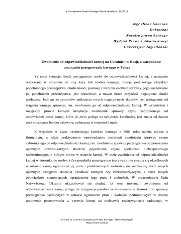 e-Czasopismo Prawa Karnego i Nauk Penalnych 13/2013 mgr Olena Sharvan Doktorant Katedra prawa karnego Wydział Prawa i Administracji Uniwersytet Jagielloński Zwolnienie od odpowiedzialności karnej na Ukrainie i w Rosji, a warunkowe umorzenie postępowania karnego w Polsce Są takie sytuacje, kiedy pociągnięcie osoby do odpowiedzialności karnej, a następnie orzeczenie w stosunku do niej kary lub środka karnego, biorąc pod uwagę charakter popełnionego przestępstwa, okoliczności, postawę i warunki osobiste sprawcy, jego zachowanie po popełnieniu przestępstwa, jest niecelowe, a nawet może przynieść negatywne skutki społeczne. Jednym ze sposobów uniknięcia owych negatywnych skutków jest odstąpienie od ścigania karnego sprawcy, tzn. zwolnienie go od odpowiedzialności karnej. W ukraińskim i rosyjskim prawie karnym instytucja zwolnienia sprawcy czynu zabronionego od odpowiedzialności karnej, która de facto polega na uchyleniu karalności, jest znana od dawna oraz stosowana bardzo aktywnie, zwłaszcza w ostatnich latach. Z wejściem w życie ukraińskiego kodeksu karnego z 2001 roku można mówić o formalnym, a także praktycznym wprowadzeniu instytucji zwolnienia sprawcy czynu zabronionego od odpowiedzialności karnej, tzn. zwolnienie sprawcy przestępstwa od ponoszenia ujemnych prawno-karnych skutków popełnienia czynu społecznie niebezpiecznego (zabronionego), o którym mowa w ustawie karnej. W razie zwolnienia od odpowiedzialności karnej w stosunku do osoby, która popełniła przestępstwo (sprawcy), nie stosuje się określonych w ustawie karnej ograniczeń jej praw i podstawowych wolności, nie orzeka się także innych ujemnych następstw skazania (środków karnych czy zabezpieczających, a także innych obowiązków stanowiących ograniczenie jego praw i wolności). W orzecznictwie Sądu Najwyższego Ukrainy ukształtował się pogląd, iż sens instytucji zwolnienia od odpowiedzialności karnej polega na rezygnacji państwa ze stosowania w stosunku do sprawcy przestępstwa określonych w ustawie ograniczeń praw i wolności podmiotowych w drodze umorzenia postępowania w sprawie karnej na podstawie rozstrzygnięcia sądowego, w Artykuł ze strony e-Czasopisma Prawa Karnego i Nauk Penalnych http://www.czpk.pl e-Czasopismo Prawa Karnego i Nauk Penalnych 13/2013 wypadkach i trybie określonym przez przepisy ustawodawstwa karnego 1. Tak samo owa instytucja jest traktowana w rosyjskim prawie karnym 2. Po wstępnej analizie uregulowań polskiego i ukraińskiego prawa karnego (ma się tutaj na myśli prawo karne w znaczeniu szerokim) można dojść do przekonania, iż instytucja zwolnienia od odpowiedzialności karnej w prawie karnym ukraińskim i rosyjskim jest instytucją podobną do instytucji warunkowego umorzenia postępowania karnego w Polsce. Instytucje te wykazują szereg wspólnych cech, chociażby takich jak cel, niektóre przesłanki ich stosowania, jednak szersza analiza ogólnej charakterystyki oraz specyfika poszczególnych przesłanek i warunków zwolnienia sprawcy od odpowiedzialności karnej nie pozwalają wnioskować o ich pełnej tożsamości. W niniejszym opracowaniu podjęto próbę zaprezentowania instytucji zwolnienia od odpowiedzialności karnej w regulacjach ukraińskiego i rosyjskiego prawa karnego, podając jej charakterystykę, a także wskazując jej mocne i słabe strony w porównaniu z warunkowym umorzeniem postępowania karnego. Jak już było wspomniane, podstawą normatywną zwolnienia sprawcy czynu zabronionego od odpowiedzialności karnej jest na Ukrainie kodeks karny (Кримінальний кодекс України) z 2001 roku, jako jedyne źródło odpowiedzialności karnej. W kodeksie tym instytucje zwolnienia od odpowiedzialności karnej uregulowano w Rozdziale IX części ogólnej. Z kolei w Rosji kodeks karny (Уголовный кодекс Российской Федерации) z 1996 roku, szczególnie Rozdział XI części ogólnej zawiera odpowiednie uregulowania dotyczące instytucji zwolnienia sprawcy od odpowiedzialności karnej. Zaś żaden z wymienionych aktów prawnych nie podaje definicji pojęcia „zwolnienie od odpowiedzialności karnej”, tylko określają podstawowe zasady i warunki, a także przesłanki stosowania owej instytucji; za tryb i reguły postępowania w sprawach o zwolnienie sprawcy czynu zabronionego od odpowiedzialności karnej odpowiadają przepisy prawa karnego procesowego – Kodeks postępowania karnego Ukrainy 2012 roku i Kodeks postępowania karnego Federacji Rosyjskiej 2001 roku. Zgodnie z art. 44 § 1 ukraińskiego kodeksu karnego sprawca czynu zabronionego podlega zwolnieniu od odpowiedzialności karnej w wypadkach, przewidzianych tym kodeksem, a także na podstawie ustawy o amnestii lub aktu ułaskawienia. Jak wynika z przywołanej regulacji, zwolnienie od odpowiedzialności karnej nastąpić może jedynie w enumeratywnie wyliczonych wypadkach. I tak, oprócz amnestii i ułaskawienia, sprawca czynu zabronionego, co do zasady 1 П.1 Постанови Верховного Суду України №1 від 23.12.2005 - Про практику застосування судами України законодавства про звільнення особи від кримінальної відповідальності, Бізнес: законодавство та практика, 2006 р., № 7. 2 Уголовное права. Общая часть. Учебник, 5-е издание, ред. Козаченко И.Я., Москва «Норма» 2013, C.477. Artykuł ze strony e-Czasopisma Prawa Karnego i Nauk Penalnych http://www.czpk.pl e-Czasopismo Prawa Karnego i Nauk Penalnych 13/2013 podlega zwolnieniu od odpowiedzialności karnej w wypadku: czynnego żalu (art. 45 k.k. Ukrainy), pojednania się z pokrzywdzonym (art. 46 k.k. Ukrainy), poręczenie się za niego (poruka) (art. 47 k.k. Ukrainy), zmiany okoliczności3 (art. 48 k.k. Ukrainy) albo upływu term