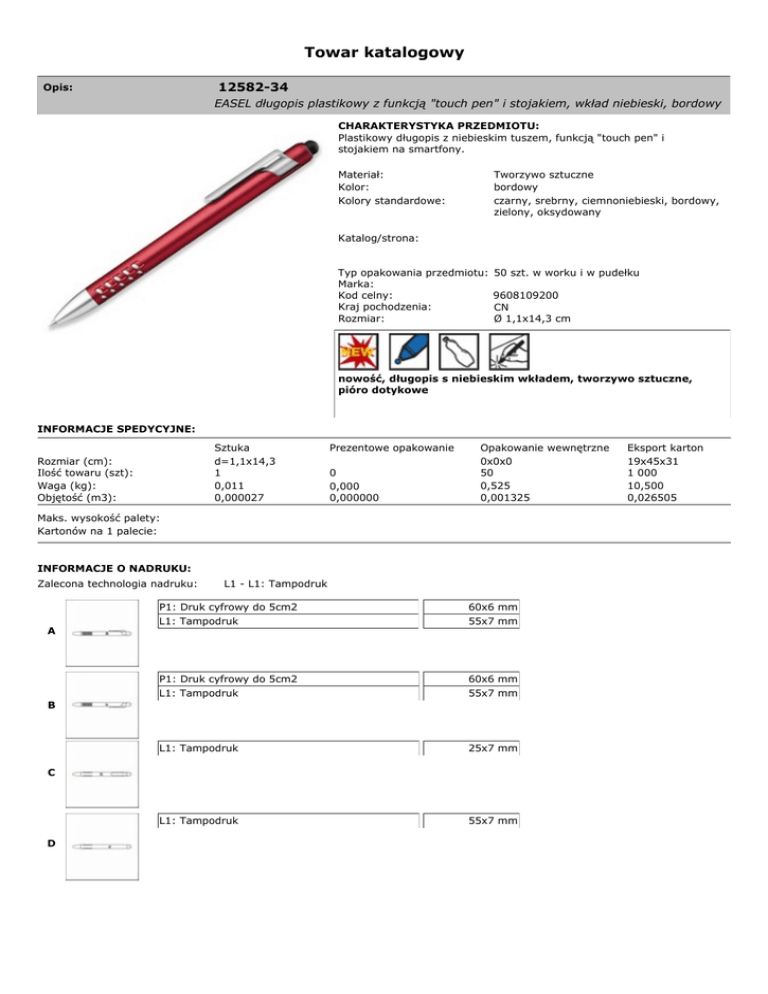 Towar katalogowy 12582-34 Opis: EASEL długopis plastikowy z funkcją "touch pen" i stojakiem, wkład niebieski, bordowy CHARAKTERYSTYKA PRZEDMIOTU: Plastikowy długopis z niebieskim tuszem, funkcją "touch pen" i stojakiem na smartfony. Tworzywo sztuczne bordowy czarny, srebrny, ciemnoniebieski, bordowy, zielony, oksydowany Materiał: Kolor: Kolory standardowe: Katalog/strona: Typ opakowania przedmiotu: Marka: Kod celny: Kraj pochodzenia: Rozmiar: 50 szt. w worku i w pudełku 9608109200 CN Ø 1,1x14,3 cm nowość, długopis s niebieskim wkładem, tworzywo sztuczne, pióro dotykowe INFORMACJE SPEDYCYJNE: Sztuka d=1,1x14,3 1 0,011 0,000027 Rozmiar (cm): Ilość towaru (szt): Waga (kg): Objętość (m3): Prezentowe opakowanie 0 0,000 0,000000 Opakowanie wewnętrzne 0x0x0 50 0,525 0,001325 Maks. wysokość palety: Kartonów na 1 palecie: INFORMACJE O NADRUKU: Zalecona technologia nadruku: L1 - L1: Tampodruk P1: Druk cyfrowy do 5cm2 A L1: Tampodruk 60x6 mm 55x7 mm P1: Druk cyfrowy do 5cm2 L1: Tampodruk 60x6 mm 55x7 mm L1: Tampodruk 25x7 mm L1: Tampodruk 55x7 mm B C D Eksport karton 19x45x31 1 000 10,500 0,026505 Towar katalogowy L1: Tampodruk 30x4 mm P1: Druk cyfrowy do 5cm2 L1: Tampodruk 60x6 mm 55x7 mm P1: Druk cyfrowy do 5cm2 L1: Tampodruk 60x6 mm 55x7 mm L1: Tampodruk 25x7 mm L1: Tampodruk 55x7 mm L1: Tampodruk 30x4 mm E F G H I J