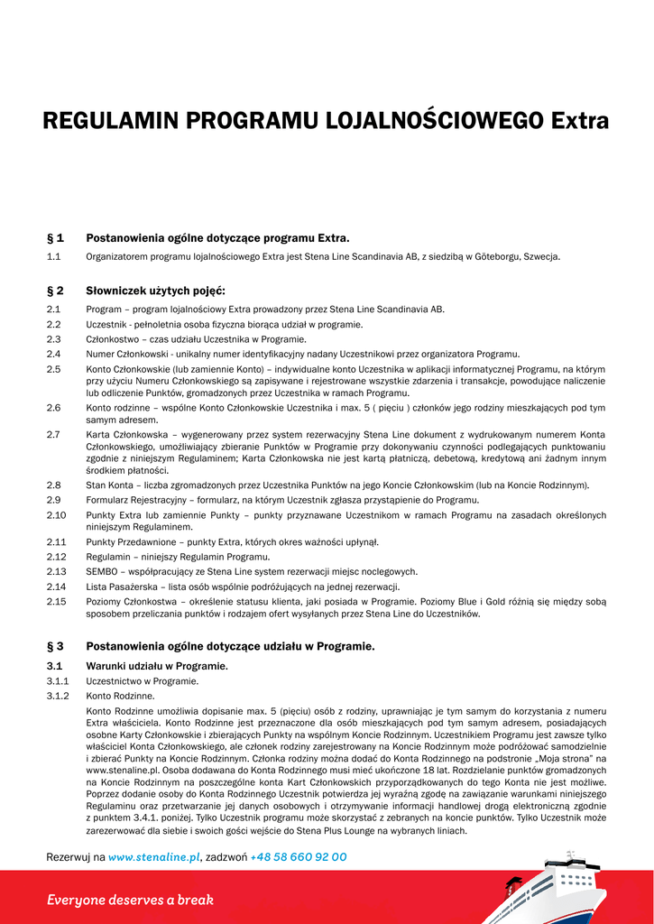 REGULAMIN PROGRAMU LOJALNOŚCIOWEGO Extra §1 Postanowienia ogólne dotyczące programu Extra. 1.1 Organizatorem programu lojalnościowego Extra jest Stena Line Scandinavia AB, z siedzibą w Göteborgu, Szwecja. §2 Słowniczek użytych pojęć: 2.1 Program – program lojalnościowy Extra prowadzony przez Stena Line Scandinavia AB. 2.2 Uczestnik - pełnoletnia osoba fizyczna biorąca udział w programie. 2.3 Członkostwo – czas udziału Uczestnika w Programie. 2.4 Numer Członkowski - unikalny numer identyfikacyjny nadany Uczestnikowi przez organizatora Programu. 2.5 Konto Członkowskie (lub zamiennie Konto) – indywidualne konto Uczestnika w aplikacji informatycznej Programu, na którym przy użyciu Numeru Członkowskiego są zapisywane i rejestrowane wszystkie zdarzenia i transakcje, powodujące naliczenie lub odliczenie Punktów, gromadzonych przez Uczestnika w ramach Programu. 2.6 Konto rodzinne – wspólne Konto Członkowskie Uczestnika i max. 5 ( pięciu ) członków jego rodziny mieszkających pod tym samym adresem. 2.7 Karta Członkowska – wygenerowany przez system rezerwacyjny Stena Line dokument z wydrukowanym numerem Konta Członkowskiego, umożliwiający zbieranie Punktów w Programie przy dokonywaniu czynności podlegających punktowaniu zgodnie z niniejszym Regulaminem; Karta Członkowska nie jest kartą płatniczą, debetową, kredytową ani żadnym innym środkiem płatności. 2.8 Stan Konta – liczba zgromadzonych przez Uczestnika Punktów na jego Koncie Członkowskim (lub na Koncie Rodzinnym). 2.9 Formularz Rejestracyjny – formularz, na którym Uczestnik zgłasza przystąpienie do Programu. 2.10 Punkty Extra lub zamiennie Punkty – punkty przyznawane Uczestnikom w ramach Programu na zasadach określonych niniejszym Regulaminem. 2.11 Punkty Przedawnione – punkty Extra, których okres ważności upłynął. 2.12 Regulamin – niniejszy Regulamin Programu. 2.13 SEMBO – współpracujący ze Stena Line system rezerwacji miejsc noclegowych. 2.14 Lista Pasażerska – lista osób wspólnie podróżujących na jednej rezerwacji. 2.15 Poziomy Członkostwa – określenie statusu klienta, jaki posiada w Programie. Poziomy Blue i Gold różnią się między sobą sposobem przeliczania punktów i rodzajem ofert wysyłanych przez Stena Line do Uczestników. § 3 Postanowienia ogólne dotyczące udziału w Programie. 3.1 Warunki udziału w Programie. 3.1.1 Uczestnictwo w Programie. 3.1.2 Konto Rodzinne. Konto Rodzinne umożliwia dopisanie max. 5 (pięciu) osób z rodziny, uprawniając je tym samym do korzystania z numeru Extra właściciela. Konto Rodzinne jest przeznaczone dla osób mieszkających pod tym samym adresem, posiadających osobne Karty Członkowskie i zbierających Punkty na wspólnym Koncie Rodzinnym. Uczestnikiem Programu jest zawsze tylko właściciel Konta Członkowskiego, ale członek rodziny zarejestrowany na Koncie Rodzinnym może podróżować samodzielnie i zbierać Punkty na Koncie Rodzinnym. Członka rodziny można dodać do Konta Rodzinnego na podstronie „Moja strona” na www.stenaline.pl. Osoba dodawana do Konta Rodzinnego musi mieć ukończone 18 lat. Rozdzielanie punktów gromadzonych na Koncie Rodzinnym na poszczególne konta Kart Członkowskich przyporządkowanych do tego Konta nie jest możliwe. Poprzez dodanie osoby do Konta Rodzinnego Uczestnik potwierdza jej wyraźną zgodę na zawiązanie warunkami niniejszego Regulaminu oraz przetwarzanie jej danych osobowych i otrzymywanie informacji handlowej drogą elektroniczną zgodnie z punktem 3.4.1. poniżej. Tylko Uczestnik programu może skorzystać z zebranych na koncie punktów. Tylko Uczestnik może zarezerwować dla siebie i swoich gości wejście do Stena Plus Lounge na wybranych liniach. Rezerwuj na www.stenaline.pl, zadzwoń +48 58 660 92 00 Everyone deserves a break 20 3.2 Rejestracja Uczestnika Programu i osób na Koncie Rodzinnym. Uczestnictwo w Programie jest bezpłatne, Karty Członkowskie udostępniane są pełnoletnim Uczestnikom po zadeklarowaniu uczestnictwa w Programie, poprzez złożenie wypełnionego Formularza Rejestracyjnego na stronie www.stenaline.pl na podstronie „Moja strona”. Można też przystąpić do Programu dokonując stosownego zgłoszenia podczas dokonywania rezerwacji usług Stena Line przez Internet (pod warunkiem posiadania zarejestrowanego profilu online) lub telefonicznie, na terminalu promowym, w autoryzowanych biurach podróży albo osobiście w recepcji na promach Stena Line. 3.3 Okres obowiązywania Członkostwa. Członkostwo w Programie rozpoczyna się od złożenia wypełnionego Formularza Rejestracyjnego, z chwilą otrzymania przez organizatora potwierdzenia rejestracji Uczestnika składanego poprzez kliknięcie na link w mailu potwierdzającym rejestrację, jaki zostaje wysłany do osoby składającej Formularz Rejestracyjny po jego złożeniu albo dokonującej rejestracji telefonicznej; w odniesieniu do rejestracji osobiście w recepcji na promach Stena Line Członkostwo rozpoczyna się z chwilą wprowadzenia danych Uczestnika do Programu. Członkostwo rozpoczyna się wraz z wysłaniem przez Uczestnika smsa, w treści podając swój adres mailowy, na specjalny numer telefonu +48 799 353 720 oraz otrzymaniem wiadomości zwrotnej z Numerem Członkowskim. Koszt smsa zależy od lokalnych stawek operatora. Stena Line nie ponosi odpowiedzialności w przypadku, gdy usługa nie jest dostępna u danego operatora. Każdy nowy Uczestnik otrzymuje wiadomość powitalną zawierającą Numer Członkowski. Można też otrzymać Kartę Członkowską z Numerem Członkowskim na pokładzie promu, w recepcji. Organizator może warunkować wydanie Karty Członkowskiej okazaniem dokumentu tożsamości przez Uczestnika 3.4 Dane osobowe i ich aktualizacja. 3.4.1 Administrowanie danymi osobowym. Dane osobowe Uczestników i osób zarejestrowanych na Kontach Rodzinnych będą wykorzystywane do administrowania Programem oraz do przesyłania im indywidualnych ofert 