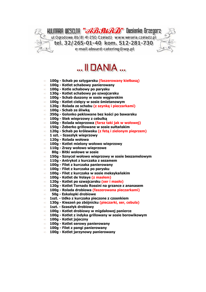 • • • • • • • • • • • • • • • • • • • • • • • • • • • • • • • • • • • • • 100g - Schab po sztygarsku (faszerowany kiełbasą) 100g - Kotlet schabowy panierowany 100g - Kotle schabowy po parysku 130g - Kotlet schabowy po szwajcarsku 100g - Schab duszony w sosie węgierskim 100g - Kotlet cielęcy w sosie śmietanowym 120g - Rolada ze schabu (z szynką i pieczarkami) 100g - Schab ze śliwką 350g - Golonko peklowane bez kości po bawarsku 100g - Stek wieprzowy z cebulką 100g - Rolada wieprzowa (farsz taki jak w wołowej) 150g - Żeberko grillowane w sosie sułtańskim 120g - Schab po królewsku (z fetą i zielonym pieprzem) 1 szt. - Szaszłyk wieprzowy 120g - Rolada wołowa 100g - Kotlet mielony wołowo wieprzowy 110g - Zrazy wołowo wieprzowe 80g - Bitki wołowe w sosie 150g - Sznycel wołowo wieprzowy w sosie beszamelowym 110g - Antrykot z kurczaka z sezamem 100g - Filet z kurczaka panierowany 100g - Filet z kurczaka po parysku 100g - Filet z kurczaka w sosie meksykańskim 100g - Kotlet de Volaye (z masłem) 120g - Kotlet po szwajcarsku (ser i masło) 120g - Kotlet Tornado Rossini na grzance z ananasem 100g - Rolada drobiowa (faszerowana pieczarkami) 50g - Eskalopki drobiowe 1szt. - Udko z kurczaka pieczone z czosnkiem 130g - Kieszeń po zbójnicku (pieczarki, ser, cebula) 1szt. - Szaszłyk drobiowy 100g - Kotlet drobiowy w migdałowej panierce 100g - Kotlet z indyka grillowany w sosie borowikowym 100g - Kotlet jajeczny 100g - Kotlet serowy panierowany 100g - Filet z pangi panierowany 100g - Kotlet jarzynowy panierowany