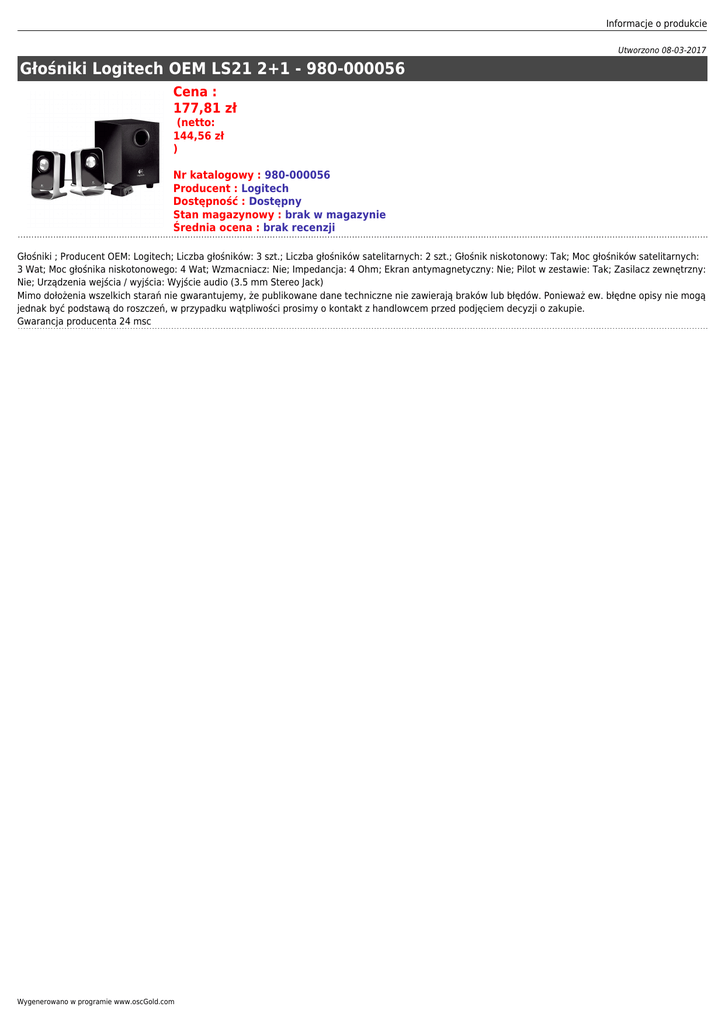 Informacje o produkcie Utworzono 08-03-2017 Głośniki Logitech OEM LS21 2+1 - 980-000056 Cena : 177,81 zł (netto: 144,56 zł ) Nr katalogowy : 980-000056 Producent : Logitech Dostępność : Dostępny Stan magazynowy : brak w magazynie Średnia ocena : brak recenzji Głośniki ; Producent OEM: Logitech; Liczba głośników: 3 szt.; Liczba głośników satelitarnych: 2 szt.; Głośnik niskotonowy: Tak; Moc głośników satelitarnych: 3 Wat; Moc głośnika niskotonowego: 4 Wat; Wzmacniacz: Nie; Impedancja: 4 Ohm; Ekran antymagnetyczny: Nie; Pilot w zestawie: Tak; Zasilacz zewnętrzny: Nie; Urządzenia wejścia / wyjścia: Wyjście audio (3.5 mm Stereo Jack) Mimo dołożenia wszelkich starań nie gwarantujemy, że publikowane dane techniczne nie zawierają braków lub błędów. Ponieważ ew. błędne opisy nie mogą jednak być podstawą do roszczeń, w przypadku wątpliwości prosimy o kontakt z handlowcem przed podjęciem decyzji o zakupie. Gwarancja producenta 24 msc Wygenerowano w programie www.oscGold.com
