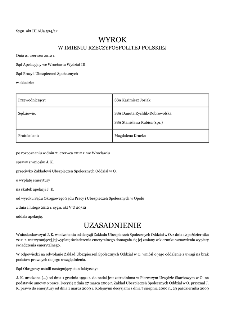 Sygn. akt III AUa 504/12 WYROK W IMIENIU RZECZYPOSPOLITEJ POLSKIEJ Dnia 21 czerwca 2012 r. Sąd Apelacyjny we Wrocławiu Wydział III Sąd Pracy i Ubezpieczeń Społecznych w składzie: Przewodniczący: SSA Kazimierz Josiak Sędziowie: SSA Danuta Rychlik-Dobrowolska SSA Stanisława Kubica (spr.) Protokolant: Magdalena Krucka po rozpoznaniu w dniu 21 czerwca 2012 r. we Wrocławiu sprawy z wniosku J. K. przeciwko Zakładowi Ubezpieczeń Społecznych Oddział w O. o wypłatę emerytury na skutek apelacji J. K. od wyroku Sądu Okręgowego Sądu Pracy i Ubezpieczeń Społecznych w Opolu z dnia 1 lutego 2012 r. sygn. akt V U 20/12 oddala apelację. UZASADNIENIE Wnioskodawczyni J. K. w odwołaniu od decyzji Zakładu Ubezpieczeń Społecznych Oddział w O. z dnia 12 października 2011 r. wstrzymującej jej wypłatę świadczenia emerytalnego domagała się jej zmiany w kierunku wznowienia wypłaty świadczenia emerytalnego. W odpowiedzi na odwołanie Zakład Ubezpieczeń Społecznych Oddział w O. wniósł o jego oddalenie z uwagi na brak podstaw prawnych do jego uwzględnienia. Sąd Okręgowy ustalił następujący stan faktyczny: J. K. urodzona (...) od dnia 1 grudnia 1990 r. do nadal jest zatrudniona w Pierwszym Urzędzie Skarbowym w O. na podstawie umowy o pracę. Decyzją z dnia 27 marca 2009 r. Zakład Ubezpieczeń Społecznych Oddział w O. przyznał J. K. prawo do emerytury od dnia 1 marca 2009 r. Kolejnymi decyzjami z dnia 7 sierpnia 2009 r., 29 października 2009 r., 28 stycznia 2010 r., 10 maja 2010 r., 4 sierpnia 2010 r., 17 listopada 2010 r., 9 lutego 2011 r., 29 kwietnia 2011 r., 4 sierpnia 2011 r. organ rentowy na wniosek J. K. doliczył jej do stażu ubezpieczeniowego dalsze okresy ubezpieczenia po przyznaniu prawa do emerytury. Decyzją z dnia 12 października 2011 r. organ rentowy wstrzymał J. K. od dnia 1 października 2011 r. wypłatę emerytury wobec kontynuowania przez nią zatrudnienia li pracodawcy na rzecz, którego wykonywała pracę bezpośrednio przed dniem nabycia prawa do emerytury. Przy tak ustalonym stanie faktycznym Sąd Okręgowy w Opolu Sąd Pracy i Ubezpieczeń Społecznych wyrokiem z dnia 1 lutego 2012 r. oddalił odwołanie wnioskodawczyni od decyzji Zakładu Ubezpieczeń Społecznych Oddział w O. z dnia 12 października 2011 r. i zasądził od wnioskodawczyni na rzecz Zakładu Ubezpieczeń Społecznych Oddział w O. kwotę 60 złotych tytułem zwrotu kosztów zastępstwa procesowego. W uzasadnieniu do wyroku Sąd Okręgowy wskazał, iż treść przepisu art. 103a wskazuje więc z jednej strony, że kontynuowanie zatrudnienia u dotychczasowego pracodawcy nie ma wpływu na nabycie prawa do emerytury, gdyż prawo to powstaje z mocy ustawy po spełnieniu warunków określonych w przepisach, z drugiej jednak strony przesądza o uznaniu, że realizacja tego prawa (polegająca na wypłacie świadczenia) ulega zawieszeniu w razie kontynuowania zatrudnienia po nabyciu prawa do emerytury niezależnie od wysokości uzyskiwanego przychodu ze stosunku pracy. Zgodnie z ugruntowanym poglądem orzeczniczym emerytura jest w założeniu świadczeniem, które zastępuje, a nie uzupełnia wynagrodzenie ze stosunku pracy. Celem wprowadzenia regulacji o jakiej mowa wart. 103a (w tym także w stosunku do tych podmiotów, którzy nabyli już uprawnienia emerytalne i możliwość ich wypłaty z jednoczesnym zachowaniem prawa do zarobku ze stosunku pracy u dotychczasowego pracodawcy) była interwencją państwa na rynku pracy poprzez oczekiwane zwolnienie miejsc pracy. Wprowadzenie rozwiązania miało zachęcać osoby, które nabyły uprawnienia emerytalne do rozwiązania stosunku pracy, a tym samym do definitywnego zwolnienia miejsca pracy dla osób młodszych. Godne podkreślenia pozostaje, że ustawodawca ma prawo wprowadzać, ale także modyfikować zasady zawieszalności świadczeń emerytalno-rentowych mając na uwadze aspekty społecznoekonomiczne, w tym aktualne tendencje na rynku pracy, a więc stopę i strukturę pogłębiającego się bezrobocia, co nie narusza wyrażonej w art. 2 Konstytucji RP zasady demokratycznego państwa prawa urzeczywistniającego zasady sprawiedliwości społecznej. Podobna racja kierowała ustawodawcą wprowadzającym w życie obecnie brzmiący art.103a ustawy emerytalno-rentowej. Jak bowiem wynika z uzasadnienia projektu ustawy z dnia 16.12.2010 r. o zmianie ustawy o finansach publicznych..., rozwiązanie wprowadzone od dnia 8.01.2009 r. przepisami ustawy z dnia 21.11.2008 r. o emeryturach kapitałowych, pozwalające na jednoczesne pobieranie wynagrodzenia ze stosunku pracy oraz wypłaty emerytury stało się konsekwencją realizacji programu solidarność pokoleń - działania dla zwiększenia aktywności zawodowej osób po 50-tym roku życia i oznaczało usunięcie jednej z barier aktywności zawodowej osób po 50 roku życia. Jak wskazano jednak rozwiązanie to stało się zbyt daleko idące. Istotnie w warunkach kryzysu gospodarczego gwałtownie spada liczba miejsc pracy co wymaga podjęcia działań zmierzających do odzyskania miejsc pracy, które obecnie zajmowane są przez emerytów. W dobie kryzysu gospodarczego i spadku dochodów ze składek, rozwiązanie zwiększające równoległe wydatki FUS na emerytury pogłębia deficyt tego funduszu i pośrednio wpływa na wzrost wydatków budżetowych, gdyż zwiększony deficyt FUS wymaga zwiększonej dotacji uzupełniającej z budżetu państwa. Powyższe względy przemawiały dla ustawodawcy za modyfikacją obowiązujących dotychczas w tej kwestii rozwiązań, zaś ich przyjęcie oznacza, że to pracownik i pracodawca solidarnie podejmują decyzję czy pracownik, który legitymuje się prawem do emerytury powinien kontynuować zatrudnienie. Sąd Okręgowy podkreślił, iż art. 67 ust. 1 Konstytucji gwarantuje prawo do zabezpieczenia społecznego. Niemniej prawodawca konstytucyjny pozostawia określenie zakresu i form zabezpieczenia społecznego ustawie zwykłej. Regulacja konstytucyjna 