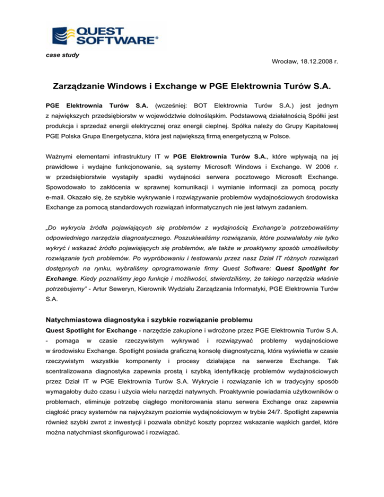 case study Wrocław, 18.12.2008 r. Zarządzanie Windows i Exchange w PGE Elektrownia Turów S.A. PGE Elektrownia Turów S.A. (wcześniej: BOT Elektrownia Turów S.A.) jest jednym z największych przedsiębiorstw w województwie dolnośląskim. Podstawową działalnością Spółki jest produkcja i sprzedaż energii elektrycznej oraz energii cieplnej. Spółka należy do Grupy Kapitałowej PGE Polska Grupa Energetyczna, która jest największą firmą energetyczną w Polsce. Ważnymi elementami infrastruktury IT w PGE Elektrownia Turów S.A., które wpływają na jej prawidłowe i wydajne funkcjonowanie, są systemy Microsoft Windows i Exchange. W 2006 r. w przedsiębiorstwie wystąpiły spadki wydajności serwera pocztowego Microsoft Exchange. Spowodowało to zakłócenia w sprawnej komunikacji i wymianie informacji za pomocą poczty e-mail. Okazało się, że szybkie wykrywanie i rozwiązywanie problemów wydajnościowych środowiska Exchange za pomocą standardowych rozwiązań informatycznych nie jest łatwym zadaniem. „Do wykrycia źródła pojawiających się problemów z wydajnością Exchange’a potrzebowaliśmy odpowiedniego narzędzia diagnostycznego. Poszukiwaliśmy rozwiązania, które pozwalałoby nie tylko wykryć i wskazać źródło pojawiających się problemów, ale także w proaktywny sposób umożliwiłoby rozwiązanie tych problemów. Po wypróbowaniu i testowaniu przez nasz Dział IT różnych rozwiązań dostępnych na rynku, wybraliśmy oprogramowanie firmy Quest Software: Quest Spotlight for Exchange. Kiedy poznaliśmy jego funkcje i możliwości, stwierdziliśmy, że takiego narzędzia właśnie potrzebujemy” - Artur Seweryn, Kierownik Wydziału Zarządzania Informatyki, PGE Elektrownia Turów S.A. Natychmiastowa diagnostyka i szybkie rozwiązanie problemu Quest Spotlight for Exchange - narzędzie zakupione i wdrożone przez PGE Elektrownia Turów S.A. - pomaga w czasie rzeczywistym wykrywać i rozwiązywać problemy wydajnościowe w środowisku Exchange. Spotlight posiada graficzną konsolę diagnostyczną, która wyświetla w czasie rzeczywistym wszystkie komponenty i procesy działające na serwerze Exchange. Tak scentralizowana diagnostyka zapewnia prostą i szybką identyfikację problemów wydajnościowych przez Dział IT w PGE Elektrownia Turów S.A. Wykrycie i rozwiązanie ich w tradycyjny sposób wymagałoby dużo czasu i użycia wielu narzędzi natywnych. Proaktywnie powiadamia użytkowników o problemach, eliminuje potrzebę ciągłego monitorowania stanu serwera Exchange oraz zapewnia ciągłość pracy systemów na najwyższym poziomie wydajnościowym w trybie 24/7. Spotlight zapewnia również szybki zwrot z inwestycji i pozwala obniżyć koszty poprzez wskazanie wąskich gardeł, które można natychmiast skonfigurować i rozwiązać. Odzyskiwanie danych serwera Exchange Po rozwiązaniu problemów wydajnościowych za pomocą narzędzia Quest Spotlight for Exchange, Spółka PGE Elektrownia Turów zdecydowała się pójść krok naprzód i jeszcze bardziej usprawnić wydajność swojego środowiska Exchange. W tym celu zakupiono rozwiązanie Quest Recovery Manager for Exchange do błyskawicznego i efektywnego wyszukiwania oraz odzyskiwania wiadomości e-mail z serwera Exchange. Quest Recovery Manager pozwala zautomatyzować proces wyszukiwania oraz odzyskiwania pojedynczej wiadomości, całych skrzynek pocztowych oraz folderów publicznych bezpośrednio z urządzenia do backup’owania. Wyszukiwanie odbywa się na podstawie takich kryteriów jak typ wiadomości czy folderu, nadawca lub odbiorca, temat i rozmiar wiadomości, data lub wybrana treść w załączniku. Pozwala użytkownikom na odzyskiwanie wiadomości, które wcześniej skasowali, a także jednego lub kilku folderów publicznych przy jednoczesnym zachowaniu ich hierarchii. Quest Recovery Manager pozwala zredukować czas do minimum oraz zminimalizować koszty odzyskiwania poczty e-mail. “Odtwarzanie skrzynek pocztowych z serwera Exchange zabierało dużo czasu. Wykorzystując do tego Recovery Manager for Exchange kilkakrotnie skracamy ten czas. Recovery Manager pomaga odzyskiwać pojedyncze wiadomości w kilka minut a nie godzin i to bez konieczności ingerowania w ich treści. Mieliśmy sytuację, w której pilnie musieliśmy wyszukać oraz odzyskać krytyczne z punktu widzenia biznesu pliki według filtrów, ściśle określonych kluczy. Udało się to sprawnie i szybko przeprowadzić. Trudno wyobrazić sobie ile czasu zajęłoby to bez narzędzi Quest Software.” - Artur Seweryn, Kierownik “Oprogramowanie Wydziału Quest Zarządzania Software do Informatyki, zarządzania PGE Exchangem Elektrownia sprawdza Turów się w S.A. naszym przedsiębiorstwie doskonale, a odzyskiwanie skrzynek pocztowych za pomocą Recovery Managera okazało się rewelacją.” Większe bezpieczeństwo Spółka PGE Elektrownia Turów S.A. działa w oparciu o rozbudowane heterogeniczne środowisko IT oraz posiada Politykę Zintegrowanego Systemu Zarządzania Jakością, Środowiskiem, Bezpieczeństwem Pracy i Bezpieczeństwem Informacji, spełniającego wymagania norm PN-EN ISO 9001, PN-EN ISO 14001, PN-N 18001 oraz ISO/IEC 27001. W 2007 r., w związku z rozbudową całej infrastruktury IT oraz nowymi inwestycjami Spółki, zdecydowano się na zakup rozwiązań do monitorowania bezpieczeństwa. “Okazało się, że po rozbudowie infrastruktury IT, działający do tej pory system zbierania logów systemowych i ich analizowania, okazał się niewystarczający. Stare oprogramowanie, z którego korzystaliśmy, nie było już w stanie zebrać i analizować dużej ilości danych. Żeby zapewnić jak największe bezpieczeństwo środowiska IT i sprostać wymogom przepisów oraz regulacji, szukaliśmy narzędzia, które pozwoliłoby monitorować, zbierać i analizować bardzo dużą ilość informacji zawartych w logach systemowych. Poza tym potrzebowaliśmy rozwiązania, które da się zastosować w środowis