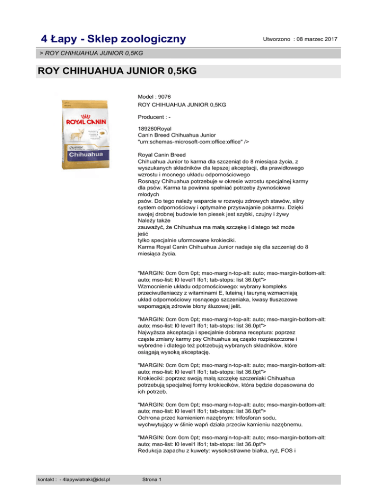 4 Łapy - Sklep zoologiczny Utworzono : 08 marzec 2017 > ROY CHIHUAHUA JUNIOR 0,5KG ROY CHIHUAHUA JUNIOR 0,5KG Model : 9076 ROY CHIHUAHUA JUNIOR 0,5KG Producent : 189260Royal Canin Breed Chihuahua Junior "urn:schemas-microsoft-com:office:office" /> Royal Canin Breed Chihuahua Junior to karma dla szczeniąt do 8 miesiąca życia, z wyszukanych składników dla lepszej akceptacji, dla prawidłowego wzrostu i mocnego układu odpornościowego Rosnący Chihuahua potrzebuje w okresie wzrostu specjalnej karmy dla psów. Karma ta powinna spełniać potrzeby żywnościowe młodych psów. Do tego należy wsparcie w rozwoju zdrowych stawów, silny system odpornościowy i optymalne przyswajanie pokarmu. Dzięki swojej drobnej budowie ten piesek jest szybki, czujny i żywy Należy także zauważyć, że Chihuahua ma małą szczękę i dlatego też może jeść tylko specjalnie uformowane krokieciki. Karma Royal Canin Chihuahua Junior nadaje się dla szczeniąt do 8 miesiąca życia. "MARGIN: 0cm 0cm 0pt; mso-margin-top-alt: auto; mso-margin-bottom-alt: auto; mso-list: l0 level1 lfo1; tab-stops: list 36.0pt"> Wzmocnienie układu odpornościowego: wybrany kompleks przeciwutleniaczy z witaminami E, luteiną i tauryną wzmacniają układ odpornościowy rosnącego szczeniaka, kwasy tłuszczowe wspomagają zdrowie błony śluzowej jelit. "MARGIN: 0cm 0cm 0pt; mso-margin-top-alt: auto; mso-margin-bottom-alt: auto; mso-list: l0 level1 lfo1; tab-stops: list 36.0pt"> Najwyższa akceptacja i specjalnie dobrana receptura: poprzez częste zmiany karmy psy Chihuahua są często rozpieszczone i wybredne i dlatego też potrzebują wybranych składników, które osiągają wysoką akceptację. "MARGIN: 0cm 0cm 0pt; mso-margin-top-alt: auto; mso-margin-bottom-alt: auto; mso-list: l0 level1 lfo1; tab-stops: list 36.0pt"> Krokieciki: poprzez swoją małą szczękę szczeniaki Chihuahua potrzebują specjalnej formy krokiecików, która będzie dopasowana do ich potrzeb. "MARGIN: 0cm 0cm 0pt; mso-margin-top-alt: auto; mso-margin-bottom-alt: auto; mso-list: l0 level1 lfo1; tab-stops: list 36.0pt"> Ochrona przed kamieniem nazębnym: trifosforan sodu, wychwytujący w ślinie wapń działa przeciw kamieniu nazębnemu. "MARGIN: 0cm 0cm 0pt; mso-margin-top-alt: auto; mso-margin-bottom-alt: auto; mso-list: l0 level1 lfo1; tab-stops: list 36.0pt"> Redukcja zapachu z kuwety: wysokostrawne białka, ryż, FOS i kontakt : - [email protected] Strona 1 4 Łapy - Sklep zoologiczny Utworzono : 08 marzec 2017 > ROY CHIHUAHUA JUNIOR 0,5KG ROY CHIHUAHUA JUNIOR 0,5KG kompleks EPA / DHA minimalizują ilość niestrawionego pokarmu i redukują zapach z kuwety, a także ilość odchodów SKŁAD: suszone białko drobiowe, ryż, tłuszcze zwierzęce, kukurydza, izolat białka roślinnego*, pulpa buraczana, hydrolizat białka zwierzę "lr83y7j4">cego, sole mineralne, olej sojowy, olej rybny, włókno roślinne, fruktooligosacharydy, wyciąg z drożdży (źródło mannooligosacharydów), wyciąg z aksamitki wzniesionej (źródło luteiny). DODATKI (na 1 kg karmy): Dodatki dietetyczne: Witamina A: 28000 UI, Witamina D3: 700 UI, E1 (Żelazo): 48 mg, E2 (Jod): 4,8 mg, E4 (Miedź): 9 mg, E5 (Mangan): 62 mg, E6 (Cynk): 187 mg, E8 (Selen): 0,11 mg - Dodatki technologiczne: Trifosforan pentasodu: 3,5 g Konserwanty - Przeciwutleniacze. SKŁADNIKI ANALITYCZNE: Białko surowe: 30% - Oleje i tłuszcze surowe: 20% - Popiół surowy: 6,6% - Włókno surowe: 2%. *L.I.P.: białko wyselekcjonowane ze względu na bardzo wysoką przyswajalność. � "FONT-SIZE: 10pt">Zalecane dzienne dawki (g/dzień): "FONT-SIZE: 10pt; FONT-STYLE: normal">Należy zapewnić zwierzęciu stały dostęp do świeżej wody "BORDER-RIGHT: windowtext 1pt solid; BORDER-TOP: windowtext 1pt solid; BORDER-LEFT: windowtext 1pt solid; BORDER-BOTTOM: windowtext 1pt solid; mso-cellspacing: 1.5pt; mso-border-alt: solid windowtext .5pt; mso-border-insideh: .5pt solid windowtext; mso-border-insidev: .5pt solid windowtext" cellpadding="0" border="1"> "BORDER-RIGHT: windowtext 1pt solid; PADDING-RIGHT: 0.75pt; BORDER-TOP: windowtext 1pt solid; PADDING-LEFT: 0.75pt; PADDING-BOTTOM: 0.75pt; BORDER-LEFT: windowtext 1pt solid; PADDING-TOP: 0.75pt; BORDER-BOTTOM: windowtext 1pt solid; BACKGROUND-COLOR: transparent; mso-border-alt: solid windowtext .5pt"> "MARGIN: 0cm 0cm 0pt; TEXT-ALIGN: center" align="center">Masa ciała psa dorosłego (kg) "BORDER-RIGHT: windowtext 1pt solid; PADDING-RIGHT: 0.75pt; BORDER-TOP: windowtext 1pt solid; PADDING-LEFT: 0.75pt; PADDING-BOTTOM: 0.75pt; BORDER-LEFT: windowtext 1pt solid; kontakt : - [email protected] Strona 2 4 Łapy - Sklep zoologiczny Utworzono : 08 marzec 2017 > ROY CHIHUAHUA JUNIOR 0,5KG ROY CHIHUAHUA JUNIOR 0,5KG PADDING-TOP: 0.75pt; BORDER-BOTTOM: windowtext 1pt solid; BACKGROUND-COLOR: transparent; mso-border-alt: solid windowtext .5pt"> "MARGIN: 0cm 0cm 0pt; TEXT-ALIGN: center" align="center">1 kg "BORDER-RIGHT: windowtext 1pt solid; PADDING-RIGHT: 0.75pt; BORDER-TOP: windowtext 1pt solid; PADDING-LEFT: 0.75pt; PADDING-BOTTOM: 0.75pt; BORDER-LEFT: windowtext 1pt solid; PADDING-TOP: 0.75pt; BORDER-BOTTOM: windowtext 1pt solid; BACKGROUND-COLOR: transparent; mso-border-alt: solid windowtext .5pt"> "MARGIN: 0cm 0cm 0pt; TEXT-ALIGN: center" align="center">2 kg "BORDER-RIGHT: windowtext 1pt solid; PADDING-RIGHT: 0.75pt; BORDER-TOP: windowtext 1pt solid; PADDING-LEFT: 0.75pt; PADDING-BOTTOM: 0.75pt; BORDER-LEFT: windowtext 1pt solid; PADDING-TOP: 0.75pt; BORDER-BOTTOM: windowtext 1pt solid; BACKGROUND-COLOR: transparent; mso-border-alt: solid windowtext .5pt"> "MARGIN: 0cm 0cm 0pt; TEXT-ALIGN: center" align="center">3 kg "BORDER-RIGHT: windowtext 1pt solid; PADDING-RIGHT: 0.75pt; BORDER-TOP: windowtext 1pt solid; PADDING-LEFT: 0.75pt; BACKGROUND: #b6b6b3; PADDING-BOTTOM: 0.75pt; BORDER-LEFT: windowtext 1pt solid; PADDING-TOP: 0.75pt; BORDER-BOTTOM: windowtext 1pt solid; mso-border-alt: solid windowtext .5pt"> 1 miesiąc "BORDER-RIGHT: windowtext 1pt solid; PADDIN