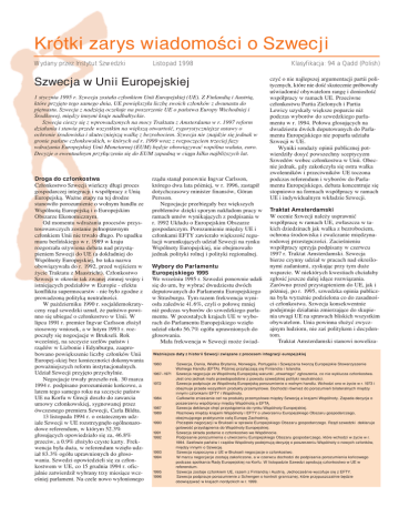 KrÛtki zarys wiadomoúci o Szwecji Wydany przez Instytut Szwedzki Listopad 1998 Szwecja w Unii Europejskiej 1 stycznia 1995 r. Szwecja zosta≥a cz≥onkiem Unii Europejskiej (UE). Z Finlandiπ i Austriπ, ktÛre przyjÍto tego samego dnia, UE powiÍkszy≥a liczbÍ swoich cz≥onkÛw z dwunastu do piÍtnastu. Szwecja z nadziejπ oczekuje na poszerzenie UE o paÒstwa Europy Wschodniej i årodkowej, miÍdzy innymi kraje nadba≥tyckie. Szwecja cieszy siÍ z wprowadzonych na mocy Traktatu z Amsterdamu w r. 1997 reform dzia≥ania i stawia przede wszystkim na wiÍkszπ otwartoúÊ, rygorystyczniejsze ustawy o ochronie úrodowiska i skuteczniejszπ walkÍ z bezrobociem. Szwecja nie znajdzie siÍ jednak w gronie paÒstw cz≥onkowskich, w ktÛrych od r. 1999 wraz z rozpoczÍciem trzeciej fazy wdraøania Europejskiej Unii Monetarnej (EUM) bÍdzie obowiπzywaÊ wspÛlna waluta, euro. Decyzje o ewentualnym przy≥πczeniu siÍ do EUM zapadnπ w ciπgu kilku najbliøszych lat. Droga do cz≥onkostwa Cz≥onkostwo Szwecji wieÒczy d≥ugi proces gospodarczej integracji i wspÛ≥pracy z Uniπ Europejskπ. Waøne etapy na tej drodze stanowi≥o porozumienie o wolnym handlu ze WspÛlnotπ Europejskπ i o Europejskim Obszarze Ekonomicznym. Od momentu wdraøania procesÛw przystosowawczych zostanie pe≥noprawnym cz≥onkiem Unii nie trwa≥o d≥ugo. Po upadku muru berliÒskiego w r. 1989 w kraju rozgorza≥a oøywiona debata nad przystπpieniem Szwecji do UE (a dok≥adniej do WspÛlnoty Europejskiej, bo taka nazwa obowiπzywa≥a do r. 1992, przed wejúciem w øycie Traktatu z Maastricht). Cz≥onkostwo Szwecji w okresie tak zwanej zimnej wojny i istniejπcych podzia≥Ûw w Europie - efektu konfliktu supermocarstw - nie by≥o zgodne z prowadzonπ politykπ neutralnoúci. W paødzierniku 1990 r. socjaldemokratyczny rzπd szwedzki uzna≥, øe paÒstwo powinno siÍ ubiegaÊ o cz≥onkostwo w Unii. W lipcu 1991 r. premier Ingvar Carlsson z≥oøy≥ stosowny wniosek, a w lutym 1993 r. rozpoczÍ≥y siÍ nogocjacje w Brukseli. Rok wczeúniej, na szczycie szefÛw paÒstw i rzπdÛw w Lizbonie i Edynburgu, zaaprobowano powiÍkszenie liczby cz≥onkÛw Unii Europej-skiej bez koniecznoúci dokonywania powaøniejszych reform instytucjonalnych. Udzia≥ Szwecji przyjÍto przychylnie. Negocjacje trwa≥y przesz≥o rok. 30 marca 1994 r. podpisano porozumienie koÒcowe, a latem tego samego roku na szczycie paÒstw UE na Korfu w Grecji dosz≥o do zawarcia umowy cz≥onkowskiej, sygnowanej przez Ûwczesnego premiera Szwecji, Carla Bildta. 13 listopada 1994 r. o ostatecznym udziale Szwecji w UE rozstrzygnÍ≥o ogÛlnonarodowe referendum, w ktÛrym 52.3% g≥osujπcych opowiedzia≥o siÍ za, 46.8% przeciw, a 0.9% z≥oøy≥o czyste karty. Frekwencja by≥a duøa, w referendum wziÍ≥o udzia≥ 83.3% ogÛ≥u uprawnionych do g≥osowania. Szwedzi opowiedzieli siÍ za cz≥onkostwem w UE, co 15 grudnia 1994 r. oficjalnie zatwierdzi≥ wybrany trzy miesiπce wczeúniej parlament. Na czele nowo wy≥onionego rzπdu stanπ≥ ponownie Ingvar Carlsson, ktÛrego dwa lata pÛøniej, w r. 1996, zastπpi≥ dotychczasowy minister finansÛw, Gˆran Persson. Negocjacje przebiega≥y bez wiÍkszych problemÛw dziÍki sporym nak≥adom pracy w ramach umÛw wynikajπcych z podpisania w r. 1992 Uk≥adu o Europejskim Obszarze gospodarczym. Porozumienie miÍdzy UE i cz≥onkami EFTY zawiera≥o wiÍkszoúÊ regulacji warunkujπcych udzia≥ Szwecji na rynku WspÛlnoty Europejskiej, nie obejmowa≥o jednak polityki rolnej i polityki regionalnej. Wybory do Parlamentu Europejskiego 1995 We wrzeúniu 1995 r. Szwedzi ponownie udali siÍ do urn, by wybraÊ dwudziestu dwÛch deputowanych do Parlamentu Europejskiego w Strasburgu. Tym razem frekwencja wynios≥a zaledwie 41.6%, czyli o po≥owÍ mniej niø podczas wyborÛw do szwedzkiego parlamentu. W pozosta≥ych krajach UE w wyborach do Parlamentu Europejskiego wziÍ≥o udzia≥ oko≥o 56.7% ogÛ≥u uprawnionych do g≥osowania. Ma≥a frekwencja w Szwecji moøe úwiad- Klasyfikacja: 94 a Qadd (Polish) czyÊ o nie najlepszej argumentacji partii politycznych, ktÛre nie doúÊ skutecznie prÛbowa≥y uúwiadomiÊ obywatelom rangÍ i donios≥oúÊ wspÛ≥pracy w ramach UE. Przeciwne cz≥onkostwu Partia Zielonych i Partia Lewicy uzyska≥y wiÍksze poparcie niø podczas wyborÛw do szwedzkiego parlamentu w r. 1994. Po≥owa g≥osujπcych na dwudziestu dwÛch deputowanych do Parlamentu Europejskiego nie popar≥a udzia≥u Szwecji w UE. Wyniki sondaøy opinii publicznej potwierdzi≥y dosyÊ powszechny sceptycyzm SzwedÛw wobec cz≥onkostwa w Unii. Obecnie jednak, gdy zakoÒczy≥a siÍ ostra walka zwolennikÛw i przeciwnikÛw UE toczona podczas referendum i wyborÛw do Parlamentu Europejskiego, debata koncentruje siÍ stopniowo na formach wspÛ≥pracy w ramach UE i indywidualnym wk≥adzie Szwecji. Traktat Amsterdamski W ocenie Szwecji naleøy usprawniÊ wspÛ≥pracÍ w ramach UE, zw≥aszcza w takich dziedzinach jak walka z bezrobociem, ochrona úrodowiska i zwalczanie miÍdzynarodowej przestÍpczoúci. Zacieúnieniu wspÛ≥pracy sprzyja podpisany w czerwcu 1997 r. Traktat Amsterdamski. Szwecja bierze czynny udzia≥ w pracach nad okreúlonymi zadaniami, zyskujπc przy tym duøe wsparcie. W niektÛrych kwestiach chcia≥aby zg≥osiÊ jeszcze dalej idπce rozwiπzania. ZarÛwno przed przystπpieniem do UE, jak i pÛøniej, po r. 1995, szwedzka opinia publiczna by≥a wyraønie podzielona co do zasadnoúci cz≥onkostwa. Szwecja konsekwentnie podejmuje dzia≥ania zmierzajπce do skupienia uwagi UE na sprawach bliskich wszystkim obywatelom. Unia powinna s≥uøyÊ zwyczajnym ludziom, nie zaú politykom i decydentom. Traktat Amsterdamski stanowi noweliza- Waøniejsze daty z historii Szwecji zwiπzane z procesem integracji europejskiej 1960 1967≠1971 1972 1984 1987 1989 1990 1991 1992 1993 1994 1995 1996 Szwecja, Dania, Wielka Brytania, Norwegia, Portugalia i Szwajcaria 