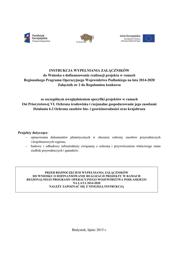 INSTRUKCJA WYPEŁNIANIA ZAŁĄCZNIKÓW do Wniosku o dofinansowanie realizacji projektu w ramach Regionalnego Programu Operacyjnego Województwa Podlaskiego na lata 2014-2020 Załącznik nr 2 do Regulaminu konkursu ze szczególnym uwzględnieniem specyfiki projektów w ramach Osi Priorytetowej VI. Ochrona środowiska i racjonalne gospodarowanie jego zasobami Działania 6.3 Ochrona zasobów bio- i georóżnorodności oraz krajobrazu Projekty dotyczące: - opracowania dokumentów planistycznych w obszarze ochrony zasobów przyrodniczych i krajobrazowych regionu, budowy i odbudowy infrastruktury związanej z ochroną i przywróceniem właściwego stanu siedlisk przyrodniczych i gatunków. PRZED ROZPOCZĘCIEM WYPEŁNIANIA ZAŁĄCZNIKÓW DO WNIOSKU O DOFINANSOWANIE REALIZACJI PROJEKTU W RAMACH REGIONALNEGO PROGRAMU OPERACYJNEGO WOJEWÓDZTWA PODLASKIEGO NA LATA 2014-2020 NALEŻY ZAPOZNAĆ SIĘ Z NINEJSZĄ INSTRUKCJĄ Białystok, lipiec 2015 r. Załączniki do wniosku o dofinansowanie realizacji projektu ze środków Europejskiego Funduszu Rozwoju Regionalnego (EFRR) w ramach Regionalnego Programu Operacyjnego na lata 20142020 (RPOWP 2014-2020) służą do uzupełnienia oraz uwiarygodnienia danych opisanych we wniosku o dofinansowanie projektu. 2 Spis załączników: 1. Studium Wykonalności ................................................................................................................4 2. Dokumenty związane z przeprowadzeniem postępowania oceny oddziaływania na środowisko ..................................................................................................................................8 3. Kopia pozwolenia na budowę lub zgłoszenie budowy/dokumenty dotyczące zagospodarowania przestrzennego ...........................................................................................11 4. Wyciąg z dokumentacji technicznej ..........................................................................................12 5. Kosztorys inwestorski................................................................................................................13 6. Potwierdzenie prawa do dysponowania gruntem lub obiektami - oświadczenie o prawie dysponowania nieruchomością na cele realizacji projektu, umowa najmu, dzierżawy itp. .....13 7. Oświadczenie Beneficjenta o braku możliwości odzyskania podatku VAT ..............................14 8. Pozostałe załączniki. .................................................................................................................14 3 Załączniki stanowią integralną część wniosku o dofinansowanie projektu ze środków EFRR w ramach RPOWP 2014-2020. Sposób złożenia oraz wymagany zakres określa Regulamin oceny i wyboru projektów w ramach Regionalnego Programu Operacyjnego Województwa Podlaskiego na lata 2014-2020, tj. niniejsza Instrukcja która stanowi jego załącznik nr 1. Lista załączników obowiązkowych może zostać rozszerzona w zależności od specyfiki działania, występującej pomocy publicznej, dodatkowych uregulowań prawnych i wytycznych. IZ RPOWP zastrzega sobie prawo do wezwania Wnioskodawcy do dostarczenia innych dokumentów niewymienionych w niniejszej Instrukcji pod warunkiem, że ich uzupełnienie nie będzie prowadziło do istotnej modyfikacji wniosku (art. 43 ust. 2 Ustawy z dnia 11 lipca 2014 r. o zasadach realizacji programów w zakresie polityki spójności finansowanych w perspektywie finansowej 2014-2020) oraz będą niezbędne do oceny spełnienia kryteriów wyboru projektów (art. 37 ust. 5 Ustawy z dnia 11 lipca 2014 r. o zasadach realizacji programów w zakresie polityki spójności finansowych w perspektywie finansowej 2014-2020). Dołączone decyzje administracyjne powinny być ważne na dzień składania wniosku o dofinansowanie oraz faktycznego rozpoczęcia realizacji projektu (w szczególności dotyczy to projektów obejmujących roboty budowlane), a także powinny być opatrzone adnotacją organu wydającego o ich ostateczności/prawomocności. Załączniki sporządzone na formularzach IZ RPOWP, zgodnie z pkt 10.3 Regulaminu Oceny i wyboru projektów, powinny być opatrzone pieczęcią nagłówkową (firmową) wystawiającego. Wszystkie załączniki do wniosku więcej niż jednostronicowe powinny być zszyte lub zbindowane i mieć ponumerowane strony, zaś każda ze stron załącznika składanego w oryginale powinna być parafowana przez osobę podpisującą wniosek. Na załącznikach powinna się również znajdować data ich sporządzenia/wydania. Wymóg nie dotyczy oryginalnych załączników sporządzonych przez inne podmioty niż wnioskodawca np. oryginału pozwolenia na budowę lub innej decyzji administracyjnej, oryginału kosztorysu inwestorskiego, oryginału opinii o innowacyjności, oryginału ofert dystrybutorów lub dostawców sprzętu, itp. Jednocześnie należy pamiętać, iż zgodnie z warunkami konkursu wystarczy przedłożyć kopie w/w dokumentów potwierdzone za zgodność z oryginałem. 1. Studium Wykonalności Zgodnie z definicją dokumentu Analiza kosztów i korzyści projektów inwestycyjnych: Przewodnik (Fundusz Strukturalny, Fundusz Spójności i ISPA) (Komisja Europejska, 1997 r.) studium wykonalności jest „badaniem proponowanego projektu, które ma ustalić, czy proponowana inwestycja jest na tyle atrakcyjna, aby uzasadniać dalsze szczegółowe prace przygotowawcze”. Sporządzane jest przez Wnioskodawców innych niż MŚP. Stanowi podstawowy załącznik do wniosku o dofinasowanie. Podstawą przygotowania Studium Wykonalności są następujące dokumenty: Wytyczne Ministra Infrastruktury i Rozwoju w zakresie zagadnień związanych z przygotowaniem projektów inwestycyjnych, w tym projektów generujących dochód 4 i projektów hybrydowych na lata 2014-2020 z dnia 18 marca 2015 r. (zwane dalej Wytycznymi przygotowania projektów inwestycyjnych); Rozporządzenie delegowane Komisji (UE) nr 480/2014 z dnia 3 marca 2014 r. uzupełniające rozpo