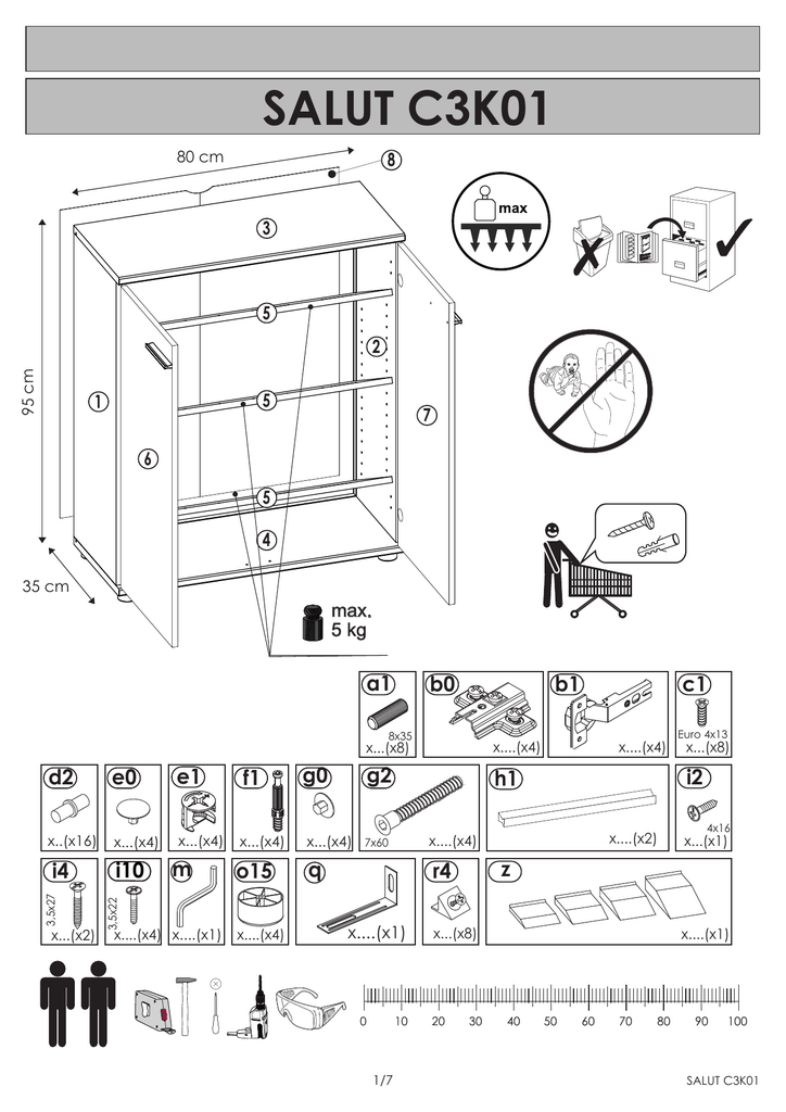 SALUT C3K01 80 cm 8 3 5 95 cm 2 5 1 7 6 5 4 35 cm max. 5 kg a1 b0 g0 e0 e1 ff1 x..(x16) x...(x4) x...(x4) x...(x4) x...(x4) o15 q x...(x2) i10 3,5x22 3,5x27 i4 m x....(x4) x....(x1) x....(x4) x...(x8) x....(x4) g2 h1 7x60 1/7 x...(x8) x....(x4) x...(x8) i2 x....(x2) x....(x4) r4 x....(x1) c1 Euro 4x13 8x35 d2 b1 4x16 x...(x1) z x....(x1) SALUT C3K01 1 a1 a1 e1 a1 e1 a1 b0 d2 d2 e1 e1 a1 b0 d2 d2 d2 2 d2 d2 d2 b0 b0 1 d2 d2 d2 b0 d2 a1 a1 e1 a1 a1 f1 f1 f1 3 f1 f1 i10 o15 o15 o15 SALUT C3K01 o15 4 2/7 o15 2 b1 b1 6 b1 b1 b1 c1 c1 7 3 a1 e1 f1 m 3 e1 e0 1 2 3/7 SALUT C3K01 4 3 8 2 1 8 2 m g2 4 g2 g2 g2 g2 g0 g2 5 A=B r4 B A r4 8 2 4 SALUT C3K01 4/7 6 q 20/30mm i2 3 30mm 20mm q q 3 d2 d2 5 2 8 1 5 5 d2 5 d2 d2 4 z 5/7 SALUT C3K01 7 3 8 5 h1 i4 i4 i4 i4 h1 5 2 1 7 6 5 4 SALUT C3K01 6/7 ! Uwaga ! Zasady użytkowania i konserwacji mebla. 1. Mebel powinien być użytkowany zgodnie z jego przeznaczeniem-w pomieszczeniach zamkniętych i zabezpieczonych przed działaniem warunków atmosferycznych. 2. Montaż wyrobu musi być wykonany zgodnie z załączoną instrukcją. 3. Wyrób nie może mieć zastosowania w saunie. 4. Mebel wykonany jest z płyty drewnopochodnej, należy chronić go przed bezpośrednim i długotrwałym kontaktem z wodą (w szczególności przed zalaniem), oraz przed wysoką temperaturą (np. odparzenia ). Wilgoć może wniknąć w materiał mebla i uszkodzić go. 5. Do czyszczenia powierzchni należy stosować lekko wilgotną, miękką tkaninę, następnie wytrzeć do sucha. 6. W przypadku powstania silniejszych zabrudzeń można użyć łagodnych środków myjących przeznaczonych do czyszczenia mebli. 7. Nie należy używać do czyszczenia aktywnych środków chemicznych (np. usuwających kamień, rdzę, środków do czyszczenia ceramiki itp.). 8. Za uszkodzenia powstałe w wyniku niestosowania się do powyższych zaleceń producent nie ponosi odpowiedzialności. 7/7