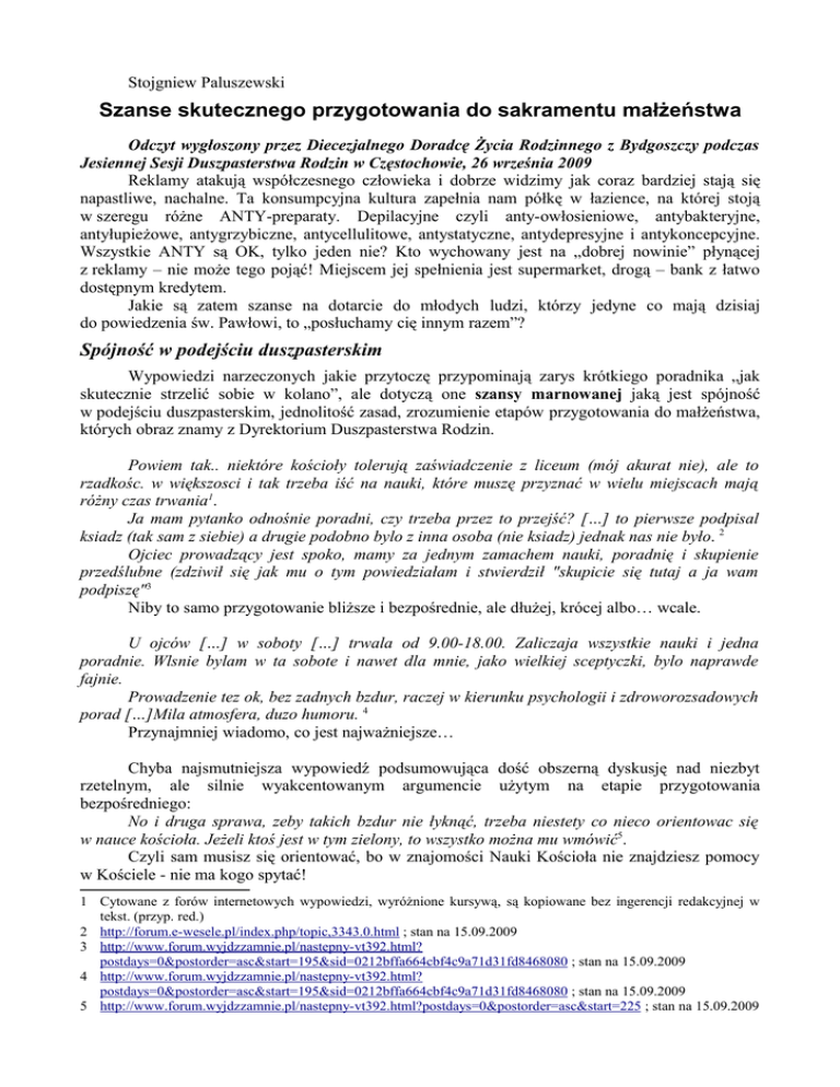 Stojgniew Paluszewski Szanse skutecznego przygotowania do sakramentu małżeństwa Odczyt wygłoszony przez Diecezjalnego Doradcę Życia Rodzinnego z Bydgoszczy podczas Jesiennej Sesji Duszpasterstwa Rodzin w Częstochowie, 26 września 2009 Reklamy atakują współczesnego człowieka i dobrze widzimy jak coraz bardziej stają się napastliwe, nachalne. Ta konsumpcyjna kultura zapełnia nam półkę w łazience, na której stoją w szeregu różne ANTY-preparaty. Depilacyjne czyli anty-owłosieniowe, antybakteryjne, antyłupieżowe, antygrzybiczne, antycellulitowe, antystatyczne, antydepresyjne i antykoncepcyjne. Wszystkie ANTY są OK, tylko jeden nie? Kto wychowany jest na „dobrej nowinie” płynącej z reklamy – nie może tego pojąć! Miejscem jej spełnienia jest supermarket, drogą – bank z łatwo dostępnym kredytem. Jakie są zatem szanse na dotarcie do młodych ludzi, którzy jedyne co mają dzisiaj do powiedzenia św. Pawłowi, to „posłuchamy cię innym razem”? Spójność w podejściu duszpasterskim Wypowiedzi narzeczonych jakie przytoczę przypominają zarys krótkiego poradnika „jak skutecznie strzelić sobie w kolano”, ale dotyczą one szansy marnowanej jaką jest spójność w podejściu duszpasterskim, jednolitość zasad, zrozumienie etapów przygotowania do małżeństwa, których obraz znamy z Dyrektorium Duszpasterstwa Rodzin. Powiem tak.. niektóre kościoły tolerują zaświadczenie z liceum (mój akurat nie), ale to rzadkośc. w większosci i tak trzeba iść na nauki, które muszę przyznać w wielu miejscach mają różny czas trwania1. Ja mam pytanko odnośnie poradni, czy trzeba przez to przejść? […] to pierwsze podpisal ksiadz (tak sam z siebie) a drugie podobno bylo z inna osoba (nie ksiadz) jednak nas nie było. 2 Ojciec prowadzący jest spoko, mamy za jednym zamachem nauki, poradnię i skupienie przedślubne (zdziwił się jak mu o tym powiedziałam i stwierdził "skupicie się tutaj a ja wam podpiszę"3 Niby to samo przygotowanie bliższe i bezpośrednie, ale dłużej, krócej albo… wcale. U ojców […] w soboty […] trwala od 9.00-18.00. Zaliczaja wszystkie nauki i jedna poradnie. Wlsnie bylam w ta sobote i nawet dla mnie, jako wielkiej sceptyczki, bylo naprawde fajnie. Prowadzenie tez ok, bez zadnych bzdur, raczej w kierunku psychologii i zdroworozsadowych porad […]Mila atmosfera, duzo humoru. 4 Przynajmniej wiadomo, co jest najważniejsze… Chyba najsmutniejsza wypowiedź podsumowująca dość obszerną dyskusję nad niezbyt rzetelnym, ale silnie wyakcentowanym argumencie użytym na etapie przygotowania bezpośredniego: No i druga sprawa, zeby takich bzdur nie łyknąć, trzeba niestety co nieco orientowac się w nauce kościoła. Jeżeli ktoś jest w tym zielony, to wszystko można mu wmówić5. Czyli sam musisz się orientować, bo w znajomości Nauki Kościoła nie znajdziesz pomocy w Kościele - nie ma kogo spytać! 1 Cytowane z forów internetowych wypowiedzi, wyróżnione kursywą, są kopiowane bez ingerencji redakcyjnej w tekst. (przyp. red.) 2 http://forum.e-wesele.pl/index.php/topic,3343.0.html ; stan na 15.09.2009 3 http://www.forum.wyjdzzamnie.pl/nastepny-vt392.html? postdays=0&postorder=asc&start=195&sid=0212bffa664cbf4c9a71d31fd8468080 ; stan na 15.09.2009 4 http://www.forum.wyjdzzamnie.pl/nastepny-vt392.html? postdays=0&postorder=asc&start=195&sid=0212bffa664cbf4c9a71d31fd8468080 ; stan na 15.09.2009 5 http://www.forum.wyjdzzamnie.pl/nastepny-vt392.html?postdays=0&postorder=asc&start=225 ; stan na 15.09.2009 Szanse dotarcia –2– Jasność zasad i rzetelność przekazu Dlaczego tak łatwo młodzi ludzie uciekają do Islamu? Mówią – bo nasze zasady są jasne – tak mówi Koran. A nasi katechizowani – bo tak nam ksiądz powiedział, a tak powiedzieli w poradnictwie! Czy nie za bardzo idziemy w kierunku psychologizowania, czy potrafimy pilnować form warsztatowych żeby nie przerodziły się w dyskusję w miejsce głoszenia Słowa, za mało dbając o oparcie katechezy na Piśmie Świętym i Nauczaniu Kościoła – i to z wyraźnym podaniem źródeł! Czy pokazujemy, że nauki szczegółowe czegoś nas uczą, a następnie, że ten przekaz jest również zawarty w Piśmie Świętym, czy raczej opieramy się na Słowie Bożym, a w odkryciach nauk szczegółowych dostrzegamy potwierdzenie skuteczności tego Słowa, znajdujemy spójność naszych odkryć z wyprzedzającą je logiką świata stworzonego. Szansą jest ten drugi sposób kierunkowania myśli, bo wiara rodzi się ze słuchania i uczynków zgodnych z głoszonym słowem, a niejako wtórnie – oświecony wiarą rozum szuka wsparcia wiary argumentami naukowymi. Wyjście od nauki do wiary łatwo rodzi dyskusje, a ta budzi potrzebę szukania argumentów, ale one nie są w stanie wzbudzić wiary. Formacja wzajemna Spotkania z kapłanami na gruncie ruchów małżeńskich i rodzinnych ujawniają sens poddawania wspólnej refleksji rozdźwięków tez współczesnej kultury masowej wobec Magisterium i wzajemnego ubogacania się przez spotkania kapłanów z rodzinami. Również nam – zanurzonym we współczesną kulturę jest łatwiej wychwycić postać tez głoszonych w różnych mediach – bo do nas są adresowane. Łatwo tu jednak o sprowadzenie rozumienia obecności kapłana w tych spotkaniach do roli strażnika depozytu wiary. Szansa zaistnieje wtedy gdy powstaje osobiste doświadczenie nurtu obustronnej wymiany – świadków i nauczycieli. Kapłańskie doświadczenia życia małżeńskiego bywa, na skutek posługi w konfesjonale, zawężone do poznania jedynie problemów i konfliktów. Poszerzenie go o doświadczenie radości życia sakramentalnością małżeństwa – drogi poszukiwania Boga i to często w trudnych warunkach codzienności, jest poważną szansą. Żyjąc w małżeństwie jesteśmy świadkami, że Nauczanie Kościoła dotyczące małżeństwa i rodziny jest żywe, działa, że nie da się zepchnąć w sferę teorii. To istotna info