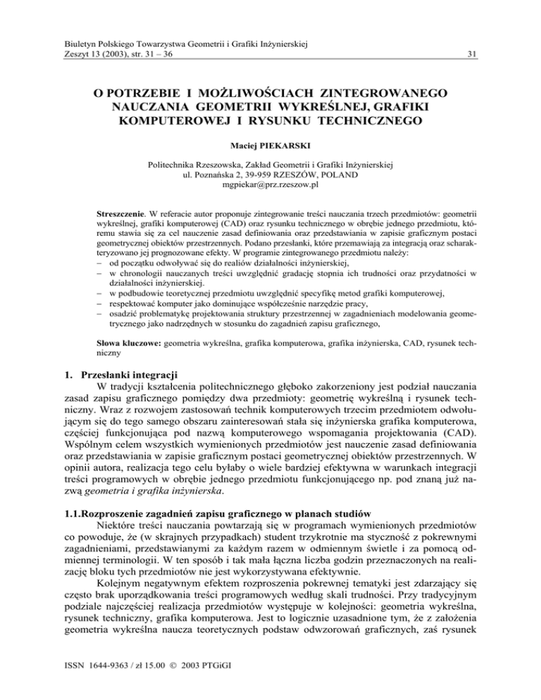 Biuletyn Polskiego Towarzystwa Geometrii i Grafiki Inżynierskiej Zeszyt 13 (2003), str. 31 – 36 31 O POTRZEBIE I MOŻLIWOŚCIACH ZINTEGROWANEGO NAUCZANIA GEOMETRII WYKREŚLNEJ, GRAFIKI KOMPUTEROWEJ I RYSUNKU TECHNICZNEGO Maciej PIEKARSKI Politechnika Rzeszowska, Zakład Geometrii i Grafiki Inżynierskiej ul. Poznańska 2, 39-959 RZESZÓW, POLAND [email protected] Streszczenie. W referacie autor proponuje zintegrowanie treści nauczania trzech przedmiotów: geometrii wykreślnej, grafiki komputerowej (CAD) oraz rysunku technicznego w obrębie jednego przedmiotu, któremu stawia się za cel nauczenie zasad definiowania oraz przedstawiania w zapisie graficznym postaci geometrycznej obiektów przestrzennych. Podano przesłanki, które przemawiają za integracją oraz scharakteryzowano jej prognozowane efekty. W programie zintegrowanego przedmiotu należy: − od początku odwoływać się do realiów działalności inżynierskiej, − w chronologii nauczanych treści uwzględnić gradację stopnia ich trudności oraz przydatności w działalności inżynierskiej. − w podbudowie teoretycznej przedmiotu uwzględnić specyfikę metod grafiki komputerowej, − respektować komputer jako dominujące współcześnie narzędzie pracy, − osadzić problematykę projektowania struktury przestrzennej w zagadnieniach modelowania geometrycznego jako nadrzędnych w stosunku do zagadnień zapisu graficznego, Słowa kluczowe: geometria wykreślna, grafika komputerowa, grafika inżynierska, CAD, rysunek techniczny 1. Przesłanki integracji W tradycji kształcenia politechnicznego głęboko zakorzeniony jest podział nauczania zasad zapisu graficznego pomiędzy dwa przedmioty: geometrię wykreślną i rysunek techniczny. Wraz z rozwojem zastosowań technik komputerowych trzecim przedmiotem odwołującym się do tego samego obszaru zainteresowań stała się inżynierska grafika komputerowa, częściej funkcjonująca pod nazwą komputerowego wspomagania projektowania (CAD). Wspólnym celem wszystkich wymienionych przedmiotów jest nauczenie zasad definiowania oraz przedstawiania w zapisie graficznym postaci geometrycznej obiektów przestrzennych. W opinii autora, realizacja tego celu byłaby o wiele bardziej efektywna w warunkach integracji treści programowych w obrębie jednego przedmiotu funkcjonującego np. pod znaną już nazwą geometria i grafika inżynierska. 1.1.Rozproszenie zagadnień zapisu graficznego w planach studiów Niektóre treści nauczania powtarzają się w programach wymienionych przedmiotów co powoduje, że (w skrajnych przypadkach) student trzykrotnie ma styczność z pokrewnymi zagadnieniami, przedstawianymi za każdym razem w odmiennym świetle i za pomocą odmiennej terminologii. W ten sposób i tak mała łączna liczba godzin przeznaczonych na realizację bloku tych przedmiotów nie jest wykorzystywana efektywnie. Kolejnym negatywnym efektem rozproszenia pokrewnej tematyki jest zdarzający się często brak uporządkowania treści programowych według skali trudności. Przy tradycyjnym podziale najczęściej realizacja przedmiotów występuje w kolejności: geometria wykreślna, rysunek techniczny, grafika komputerowa. Jest to logicznie uzasadnione tym, że z założenia geometria wykreślna naucza teoretycznych podstaw odwzorowań graficznych, zaś rysunek ISSN 1644-9363 / zł 15.00 © 2003 PTGiGI 32 M. PIEKARSKI: O potrzebie i możliwości zintegrowanego nauczania ... techniczny wykorzystując te podstawy, zajmuje się zapisem graficznym konkretnych obiektów technicznych. W obszarze geometrii wykreślnej czasem rozpatrywane są m.in. także zagadnienia, przydatne niewielkiemu odsetkowi przyszłych absolwentów. Przytłaczają one zwłaszcza słabszych studentów już na początku studiów, gdy tymczasem dalsza nauka – rysunku technicznego i grafiki komputerowej nie przysparzając takich trudności, utwierdza wręcz w przekonaniu, że geometria wykreślna jest przedmiotem zbędnym. 1.2. Komputer – nowe narzędzie projektowania Pojawienie się zastosowań komputera w zagadnieniach zapisu graficznego nie zaowocowało wyraźną zmianą treści nauczania geometrii wykreślnej i rysunku technicznego. Jeżeli doskonalenie biegłości w posługiwaniu się tradycyjnym sprzętem kreślarskim znajdowało przez dziesięciolecia swoje miejsce w programach nauczania, to po pojawieniu się komputera miejsce to powinno było zostać chociaż częściowo przeznaczone na naukę posługiwania się nowym narzędziem. W okresie początkowego rozwoju technik komputerowych drastyczny brak środków finansowych nie pozwalał na odpowiednie wyposażenie pracowni komputerowych zwłaszcza, że zarówno sprzęt jak i oprogramowanie szybko się dezaktualizowały, Wzrost liczby studentów potęgował trudności sprzętowo-lokalowe, a towarzyszący mu spadek liczby godzin przeznaczonych na omawiane przedmioty stanowił wygodne usprawiedliwienie dla ignorowania technik komputerowych w dydaktyce. Pojawienie się możliwości modelowania w wirtualnej przestrzeni trójwymiarowej dokonało przełomu już nie tylko ilościowego, skutkującego poprawą wydajności i klasy narzędzia kreślarskiego, ale przełomu jakościowego, który objawił się dostarczeniem zupełnie nowego aparatu do rozwiązywania problemów przestrzennych, konkurencyjnego wobec geometrii wykreślnej. Ta zmiana powinna była, zdaniem autora, znaleźć swoje odzwierciedlenie w teoretycznych podstawach geometrii inżynierskiej. Obecna sytuacja, korzystna zarówno w zakresie dostępności jak i jakości sprzętu i oprogramowania, bezwzględnie zobowiązuje do dokonania zmian w dydaktyce szeroko pojętej geometrii inżynierskiej. 1.3. Niekorzystny wizerunek geometrii wykreślnej Geometria wykreślna w odczuciu autora nie była nigdy przedmiotem entuzjastycznie przyjmowanym przez studentów. Potoczna, a zarazem lekceważąca nazwa tego przedmiotu „kreski” wywodzi się jeszcze z epoki „przedkomputerowej”. Geometria wykreślna, kt