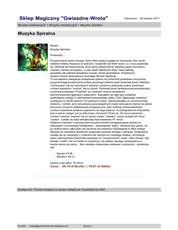 Sklep Magiczny "Gwiezdne Wrota" Utworzono : 08 marzec 2017 Muzyka relaksacyjna > Muzyka medatycyjna > Muzyka Spiralna Muzyka Spiralna Model : Muzyka Spiralna Producent : Przypomnijcie sobie muzykę, która Was kiedyś wyjątkowo wzruszyła. Być może mieliście wtedy dreszcze na plecach, rozjaśniła się Wam twarz, a z oczu popłynęły łzy. Możliwe że towarzyszyły temu silne wspomnienia. Byliście wtedy wzruszeni i bardzo, bardzo szczęśliwi, a cały świat należał do Was. Taką reakcję wywołała siła wibracji dźwięków muzyki, której słuchaliście. Podobnych wrażeń można doświadczyć słuchając Muzyki Spiralnej. Ta szczególna medytacja dźwiękowa oparta na rytmicznej podstawie muzycznej przypominającej taktowanie bolera powoduje właśnie takie doświadczenia. Melodia "wznosząca" się od najniższych wibracji z poziomu pierwszej czakry powolnym ruchem spiralnym "wznosi" się ku górze. Doświadczacie fantastycznej enerdetyzacji za pomocą dźwięku! "Podróże" po czakrach można dodatkowo zsynchronizować głębszym oddechem. Sygnałem do tego jest subtelnie podkreślony dźwięk 3 uderzeniami drewnianego kołka. Cykl "głębszego oddechu" występuje co 50-80 sekund. Po pewnym czasie, doprowadzając do synchronizacji oddechu i rytmiki, przy wizualizacji poszczególnych czakr odczujecie niemal na planie fizycznym znaczne doładowanie energetyczne. Moc wibracji niezauważalnym ruchem przeniknie wnętrze organizmu do tego stopnia, iż wielogodzinne zmęczenie jest w stanie ustąpić już po kilkunastu minutach! Przez ok. 20 minut spiralnym ruchem melodia "wspina" się ku górze, potem "zakręci" i przez kolejne 20 minut "opada". Całość tej sesji dźwiękowej trwa dokładnie 47 minut. Kolejnym utworem z tej płyty jest muzyka (równie energetyzująca) oparta na wibracjach i brzmieniach Didgeridoo - australijskiej "trąby". Możecie być pewni, że po wysłuchaniu całej płyty nie oprzecie się wrażeniu narastającej w Was energii. Muzyka do medytacji spiralnych wspaniale podnosi energie i wibracje. Znakomicie nadaje się do medytacji z czakrami jak również do zwykłego relaksu. Brzmienia wielu instrumentów doskonale wpływają na "oczyszczenie" czakr. Jeśli chcesz, aby dźwięk "zrobił" coś za Ciebie to wystarczy, że oddasz się jego prowadzeniu a reszta stanie się sama... Moc dźwięku doskonale uzdrawia i oczyszcza - przekonaj się! � Spirala 47:06 � Spirala II 28:12 Łączny czas płyty: 75 minut Cena : 24,19 zł Brutto ( 19,67 zł Netto) Dostępność: Produkt dostępny w naszym sklepie od 14 październik 2008 kontakt : - [email protected] Strona 1