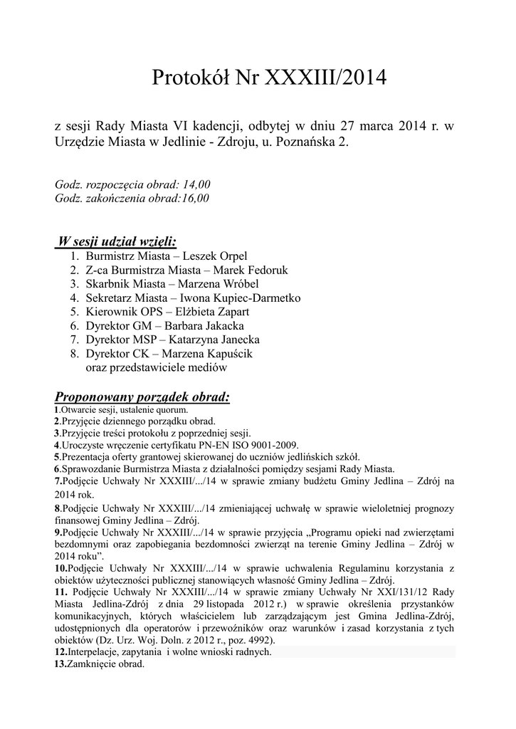 Protokół Nr XXXIII/2014 z sesji Rady Miasta VI kadencji, odbytej w dniu 27 marca 2014 r. w Urzędzie Miasta w Jedlinie - Zdroju, u. Poznańska 2. Godz. rozpoczęcia obrad: 14,00 Godz. zakończenia obrad:16,00 W sesji udział wzięli: 1. 2. 3. 4. 5. 6. 7. 8. Burmistrz Miasta – Leszek Orpel Z-ca Burmistrza Miasta – Marek Fedoruk Skarbnik Miasta – Marzena Wróbel Sekretarz Miasta – Iwona Kupiec-Darmetko Kierownik OPS – Elżbieta Zapart Dyrektor GM – Barbara Jakacka Dyrektor MSP – Katarzyna Janecka Dyrektor CK – Marzena Kapuścik oraz przedstawiciele mediów Proponowany porządek obrad: 1.Otwarcie sesji, ustalenie quorum. 2.Przyjęcie dziennego porządku obrad. 3.Przyjęcie treści protokołu z poprzedniej sesji. 4.Uroczyste wręczenie certyfikatu PN-EN ISO 9001-2009. 5.Prezentacja oferty grantowej skierowanej do uczniów jedlińskich szkół. 6.Sprawozdanie Burmistrza Miasta z działalności pomiędzy sesjami Rady Miasta. 7.Podjęcie Uchwały Nr XXXIII/.../14 w sprawie zmiany budżetu Gminy Jedlina – Zdrój na 2014 rok. 8.Podjęcie Uchwały Nr XXXIII/.../14 zmieniającej uchwałę w sprawie wieloletniej prognozy finansowej Gminy Jedlina – Zdrój. 9.Podjęcie Uchwały Nr XXXIII/.../14 w sprawie przyjęcia „Programu opieki nad zwierzętami bezdomnymi oraz zapobiegania bezdomności zwierząt na terenie Gminy Jedlina – Zdrój w 2014 roku”. 10.Podjęcie Uchwały Nr XXXIII/.../14 w sprawie uchwalenia Regulaminu korzystania z obiektów użyteczności publicznej stanowiących własność Gminy Jedlina – Zdrój. 11. Podjęcie Uchwały Nr XXXIII/.../14 w sprawie zmiany Uchwały Nr XXI/131/12 Rady Miasta Jedlina-Zdrój z dnia 29 listopada 2012 r.) w sprawie określenia przystanków komunikacyjnych, których właścicielem lub zarządzającym jest Gmina Jedlina-Zdrój, udostępnionych dla operatorów i przewoźników oraz warunków i zasad korzystania z tych obiektów (Dz. Urz. Woj. Doln. z 2012 r., poz. 4992). 12.Interpelacje, zapytania i wolne wnioski radnych. 13.Zamknięcie obrad. Ad. 1. Obrady otworzył Przewodniczący Rady Miasta w Jedlinie – Zdroju Romuald Wysocki. Powitał zebranych. Stwierdził, iż w obradach udział bierze 13 radnych, co upoważnia Radę do prawomocnego podejmowania uchwał. Lista obecności stanowi Załącznik Nr 1 do niniejszego protokołu. Ad.2. Następnie Przewodniczący Rady zapytał czy są wnioski w sprawie zmian w porządku obrad. Wniosków nie zgłoszono. Porządek obrad został przyjęty. .Ad. 3. Uwag do protokołu z poprzedniej sesji nie zgłoszono, tym samym przyjęto jego treść bez zastrzeżeń. Ad. 4. Głos zabrał Burmistrz Miasta. Przypomniał, że Urząd Miasta posiada certyfikat od 10 lat. To bardzo ważny i bardzo praktyczny dokument o czym przekonują nas klienci. Z ankiet wynika, że ten sposób zarzadzania organizacją jest właściwy i słuszny, a dzięki certyfikatowi w Urzędzie dużo się zmieniło na lepsze. Burmistrz podziękował pracownikom za wysiłek jaki wkładają w utrzymanie certyfikatu, a kierownictwu za jego wdrożenie. Następnie głos zabrała Pani Sekretarz. Powiedziała, cyt. „ Wysoka Rado, Szanowni Państwo, jest mi niezmiernie miło poinformować, że Urząd Miasta Jedlina – Zdrój otrzymał ponowną rekomendację utrzymania i odnowienia Certyfikatu Systemu Zarządzania Jakością zgodne z normą PN-EN ISO 9001:2009. Rekomendację dot. utrzymania Certyfikatu, Urząd Miasta otrzymał na podstawie wyników auditu odnowieniowego, przeprowadzonego przez Auditorów Polskiej Izby Handlu Zagranicznego w dniu 12 marca 2014 r. Auditorem Wiodącym tego audytu była Pani Urszula Parulska, którą pozwolę sobie Państwu przedstawić. Pani Urszula przyjechała specjalnie na dzisiejszą sesję, by dokonać uroczystego wręczenia certyfikatu, który jest ważny do marca 2017 r. Ale zanim to nastąpi słowem przypomnienia chciałam przedstawić kilka faktów. Decyzja o wdrożeniu Systemu ISO zapadła w 2004 r., a pierwszy Certyfikat Systemu Zarządzania Jakością zgodnego wówczas z Normą ISO 9001:2001 Urząd Miasta Jedlina – Zdrój otrzymał w 2005 r. Ustanowiono wówczas Politykę Jakości czyli kierunek zamierzeń organizacji dotyczący jakości. Polityka jakości zawiera zobowiązanie do spełnienia oczekiwań klienta i wymagań wynikających z przepisów prawa oraz ciągłego doskonalenia Systemu. Stworzono Księgę Jakości wraz z przynależnymi mapami procesów. Opracowano i wdrożono procedury systemowe wymagane normą oraz procedury operacyjne stworzone dla prawidłowej realizacji zadań na poziomie komórek organizacyjnych. Obecnie w jednostce funkcjonuje 5 procedur systemowych i 8 procedur operacyjnych. W Urzędzie Miasta funkcjonują wzory pism, druków i wniosków dostępnych w Biurze Obsługi Klienta oraz na stronie BIP. Wdrożenie systemu zdecydowanie wpłynęło na poprawę terminowości załatwiania spraw, przejrzystość i staranność prowadzonej dokumentacji. Odnotowano wyraźny spadek ilości uchylanych decyzji administracyjnych, a także negatywnych rozstrzygnięć dotyczących aktów prawnych ustanawianych przez organy gminy. Klientom udostępniono na stronach internetowych oraz w Biurze Obsługi Klienta kompletna informację o sposobie załatwiania spraw. Należy podkreślić, iż jest to już 10 audit, który pomyślnie przeszedł nasz Urząd. Auditorzy przeprowadzający audity nigdy nie stwierdzili żadnych niezgodności podczas funkcjonowania Systemu Zarządzania Jakością. Wskazywali jedynie obszary wymagające usprawnień, mające na celu podniesienie jakości świadczonych usług publicznych. Wskazano mocne strony organizacji, takie jak zaangażowanie Kierownictwa i Pełnomocnika ds. Jakości oraz pracowników w nadzorowaniu i doskonaleniu systemu, profesjonalizm pracowników, bardzo dobry mechanizm ustalania celów jakościowych oraz monitorowania procesów i ich celów. Auditorzy firmy certyfikującej podkreślali, że kierownictwo Urzędu, a także wysiłek pracowników tw