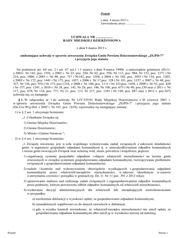 Projekt z dnia 4 marca 2013 r. Zatwierdzony przez ......................... UCHWAŁA NR .................... RADY MIEJSKIEJ DZIERŻONIOWA z dnia 8 marca 2013 r. zmiieniająca uchwałę w sprawie utworzenia Związku Gmin Powiatu Dzierżoniowskiego „ZGPD-7” i przyjęcia jego statutu Na podstawie art. 64 ust. 2 i art. 67 ust.1 i 3 ustawy z dnia 8 marca 1990r. o samorządzie gminnym (Dz.U. z 2001r. Nr 142, poz. 1591, z 2002 r. Nr 23, poz. 220, Nr 62, poz. 558, Nr 113, poz. 984, Nr 153, poz. 1271 i Nr 214, poz. 1806, z 2003 r. Nr 80, poz. 717 i Nr162, poz. 1568, z 2004 r. Nr 102, poz. 1055 i Nr 116, poz. 1203, z 2005 r. Nr 172, poz. 1441 i Nr 175, poz. 1457, z 2006 r. Nr 17,poz. 128 i Nr 181, poz. 1337, z 2007 r. Nr 48, poz. 327, Nr 138, poz. 974 i Nr 173, poz.1218, z 2008 r. Nr 180, poz. 1111 i Nr 223,poz. 1458, z 2009 r. Nr 52, poz. 420 i Nr 157, poz. 1241, z 2010 r. Nr 28, poz. 142, Nr 28, poz. 146, Nr 106, poz. 675 i Nr 40, poz.230 oraz z 2011 r. Nr 117, poz. 679, Nr 134, poz. 777, Nr 21, poz. 113, Nr 217, poz. 1281 i Nr 149, poz. 887 oraz z 2012 r. poz.567) uchwala się, co następuje: § 1. W załączniku nr 1 do uchwały Nr LIV/355/01 Rady Miejskiej Dzierżoniowa z 26 czerwca 2001 r. w sprawie utworzenia Związku Gmin Powiatu Dzierżoniowskiego „ZGPD-7” i przyjęcia jego statutu (Dz.Urz.Woj.Dol. z 2002 r. Nr 101, poz. 1610), wprowadza się następujące zmiany: 1) w § 2 ust. 1 otrzymuje brzmienie: „1. Członkami Związku są: 1) Gmina Miejska Dzierżoniów; 2) Gmina Dzierżoniów; 3) Miasto i Gmina Niemcza.”; 2) w § 6 ust. 1 otrzymuje brzmienie: „1. Związek stworzony jest w celu wspólnego wykonywania zadań związanych z zakresem działalności gmin, w segmencie gospodarki odpadami komunalnym tj. z: unieszkodliwianiem odpadów komunalnych z terenu gmin tworzących Związek oraz ochroną wód, ziemi, powietrza i krajobrazu, poprzez: 1) organizację systemu gospodarki odpadami i objęcie właścicieli nieruchomości na terenie gmin zrzeszonych w związku systemem gospodarowania odpadami komunalnymi, rozwiązywanie problemów związanych z gospodarowaniem odpadami komunalnymi; 2) nadzór i kontrola nad wykonywaniem obowiązków wynikających z gospodarowania odpadami komunalnymi przez właścicieli/zarządców nieruchomości, w zakresie określonym w ustawie o utrzymaniu czystości i porządku w gminach (tj. Dz. U. Nr 11 poz. 391 z 2012 roku); 3) sprawowanie nadzoru nad realizacją zadań związanych z zagospodarowaniem odpadów komunalnych przez podmioty, którym powierzono odbiór odpadów komunalnych od właścicieli nieruchomości; 4) wydawanie decyzji w przypadku: administracyjnych dla właścicieli lub zarządzających nieruchomościami a) niezłożenia deklaracji o wysokości opłaty za gospodarowanie odpadami komunalnymi, b) uzasadnionych wątpliwości co do danych zawartych w deklaracji, c) gdy w wyniku kontroli stwierdzono, że właściciel/zarządca nieruchomości nie uiścił opłaty za gospodarowanie odpadami komunalnymi albo uiścił ją w wysokości niższej od należnej, Projekt Strona 1 d) nie posiadania umów na odbiór odpadów komunalnych przez właścicieli nieruchomości, którzy nie są obowiązani do ponoszenia opłat za gospodarowanie odpadami komunalnymi na rzecz Związku; 5) tworzenie możliwości do zagospodarowywania, w ramach działań Związku, także innych niż niebezpieczne odpadów poprodukcyjnych, powstających w wyniku prowadzonej działalności gospodarczej na obszarze gmin zrzeszonych w Związku; 6) przyjmowanie kwartalnych sprawozdań sporządzonych przez podmioty prowadzące działalność w zakresie odbierania odpadów komunalnych od właścicieli nieruchomości; 7) sporządzenia rocznych komunalnymi; sprawozdań z realizacji zadań z zakresu gospodarowania odpadami 8) wprowadzenie systemu selektywnego zbierania odpadów komunalnych, tworzenie punktów selektywnego zbierania odpadów komunalnych i ich zagospodarowanie oraz nadzór nad selektywną zbiórką odpadów; 9) prowadzenie rejestru działalności regulowanej w zakresie odbierania odpadów komunalnych od właścicieli nieruchomości, zgodnie z ustawą o utrzymaniu czystości i porządku w gminach (tj. Dz. U. Nr 11 poz. 391 z 2012 roku); 10) zapewnieniem osiągnięcia odpowiednich poziomów recyklingu, przygotowania do ponownego użycia i odzysku innymi metodami oraz ograniczenia masy odpadów komunalnych ulegających biodegradacji przekazywanych do składowania oraz nadzór nad tą działalnością; 11) przygotowanie i prowadzenie strony internetowej, na której udostępniane będą informacje o: a) podmiotach odbierających odpady komunalne poszczególnych gmin zrzeszonych w związku, od właścicieli nieruchomości z terenu b) miejscach zagospodarowania zmieszanych odpadów komunalnych, odpadów zielonych oraz pozostałości z sortowania odpadów komunalnych przeznaczonych do składowania, c) osiągniętych poziomach recyklingu, przygotowaniu do ponownego użycia i odzysku innymi metodami oraz o ograniczeniach masy odpadów komunalnych ulegających biodegradacji, przekazywanych do składowania, d) adresach i godzinach działalności punktów selektywnego zbierania odpadów komunalnych oraz punktów zbierających zużyty sprzęt elektryczny i elektroniczny, pochodzący z gospodarstw domowych; 12) przygotowywanie i przedstawianie gminom zrzeszonym w związku corocznej analizy stanu gospodarki odpadami komunalnymi, w celu weryfikacji możliwości technicznych i organizacyjnych związku w zakresie gospodarowania odpadami komunalnymi, w tym: a) możliwości przetwarzania zmieszanych odpadów komunalnych, odpadów zielonych oraz pozostałości z sortowania odpadów komunalnych przeznaczonych do składowania, b) potrzeb inwestycyjnych związanych z gospodarowaniem odpadami komunalnymi, c) kosztów poniesionych w związku z odbieraniem, odzyskiem, recyklingiem i unieszkodliwianiem odpadów komunalnych, d) liczby mieszkańców na terenie gmin zrzeszonych w związku, e) ilości od