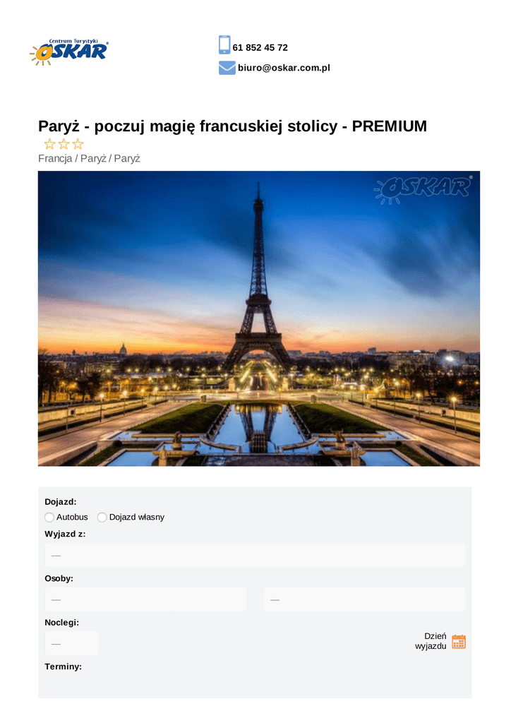 61 852 45 72 [email protected] Paryż - poczuj magię francuskiej stolicy - PREMIUM Francja / Paryż / Paryż Dojazd: Autobus Dojazd własny Wyjazd z: Osoby: Noclegi: Dzień wyjazdu Terminy: Pokój: Wyżywienie: Najtańsza oferta First Minute cena katalogowa do 11 marca 2017: 1950,00 zł do 11 marca 2017: 585,00 zł do 11 marca 2017: 0,00 zł do 11 marca 2017: 1365,00 zł Suma:1950,00 zł Suma: 1950,00 zł Opis oferty Miejscowość Udogodnienia Premium Opinie Elite Rozkład jazdy Cena nie obejmuje Chcesz wiedzieć szybciej? Polub nas na facebooku OSKAR Sp. z o.o. pl.Wolności 2/4c, 61-738 Poznań Potrzebujesz pomocy? Zadzwoń lub napisz: 61 852 45 72 [email protected] Zadzwoń Projekt i wdrożenie: Simply User