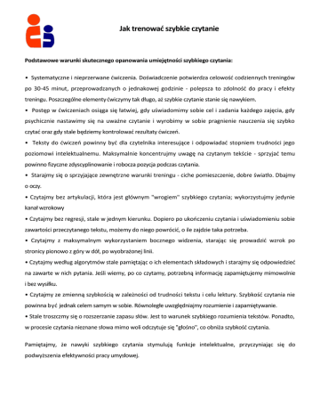 Jak trenować szybkie czytanie Podstawowe warunki skutecznego opanowania umiejętności szybkiego czytania: • Systematyczne i nieprzerwane ćwiczenia. Doświadczenie potwierdza celowość codziennych treningów po 30-45 minut, przeprowadzanych o jednakowej godzinie - polepsza to zdolność do pracy i efekty treningu. Poszczególne elementy ćwiczymy tak długo, aż szybkie czytanie stanie się nawykiem. • Postęp w ćwiczeniach osiąga się łatwiej, gdy uświadomimy sobie cel i zadania każdego zajęcia, gdy psychicznie nastawimy się na uważne czytanie i wyrobimy w sobie pragnienie nauczenia się szybko czytać oraz gdy stale będziemy kontrolować rezultaty ćwiczeń. • Teksty do ćwiczeń powinny być dla czytelnika interesujące i odpowiadać stopniem trudności jego poziomowi intelektualnemu. Maksymalnie koncentrujmy uwagę na czytanym tekście - sprzyjać temu powinno fizyczne zdyscyplinowanie i robocza pozycja podczas czytania. • Starajmy się o sprzyjające zewnętrzne warunki treningu - ciche pomieszczenie, dobre światło. Dbajmy o oczy. • Czytajmy bez artykulacji, która jest głównym "wrogiem" szybkiego czytania; wykorzystujmy jedynie kanał wzrokowy • Czytajmy bez regresji, stale w jednym kierunku. Dopiero po ukończeniu czytania i uświadomieniu sobie zawartości przeczytanego tekstu, możemy do niego powrócić, o ile zajdzie taka potrzeba. • Czytajmy z maksymalnym wykorzystaniem bocznego widzenia, starając się prowadzić wzrok po stronicy pionowo z góry w dół, po wyobrażonej linii. • Czytajmy według algorytmów stale pamiętając o ich elementach składowych i starajmy się odpowiedzieć na zawarte w nich pytania. Jeśli wiemy, po co czytamy, potrzebną informację zapamiętujemy mimowolnie i bez wysiłku. • Czytajmy ze zmienną szybkością w zależności od trudności tekstu i celu lektury. Szybkość czytania nie powinna być jednak celem samym w sobie. Równoległe uwzględniajmy rozumienie i zapamiętywanie. • Stale troszczmy się o rozszerzanie zapasu słów. Jest to warunek szybkiego rozumienia tekstów. Ponadto, w procesie czytania nieznane słowa mimo woli odczytuje się "głośno", co obniża szybkość czytania. Pamiętajmy, że nawyki szybkiego czytania stymulują funkcje intelektualne, przyczyniając się do podwyższenia efektywności pracy umysłowej.