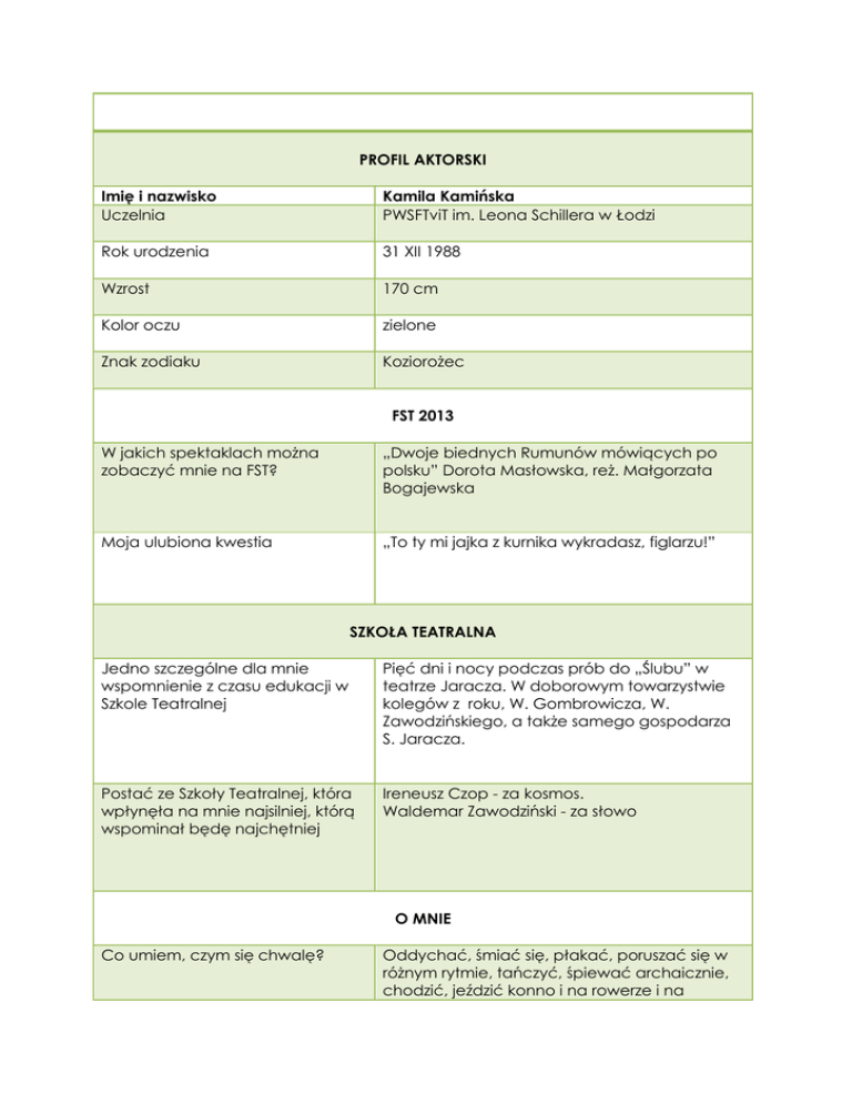 PROFIL AKTORSKI Imię i nazwisko Uczelnia Kamila Kamińska PWSFTviT im. Leona Schillera w Łodzi Rok urodzenia 31 XII 1988 Wzrost 170 cm Kolor oczu zielone Znak zodiaku Koziorożec FST 2013 W jakich spektaklach można zobaczyć mnie na FST? „Dwoje biednych Rumunów mówiących po polsku” Dorota Masłowska, reż. Małgorzata Bogajewska Moja ulubiona kwestia „To ty mi jajka z kurnika wykradasz, figlarzu!” SZKOŁA TEATRALNA Jedno szczególne dla mnie wspomnienie z czasu edukacji w Szkole Teatralnej Pięć dni i nocy podczas prób do „Ślubu” w teatrze Jaracza. W doborowym towarzystwie kolegów z roku, W. Gombrowicza, W. Zawodzińskiego, a także samego gospodarza S. Jaracza. Postać ze Szkoły Teatralnej, która wpłynęła na mnie najsilniej, którą wspominał będę najchętniej Ireneusz Czop - za kosmos. Waldemar Zawodziński - za słowo O MNIE Co umiem, czym się chwalę? Oddychać, śmiać się, płakać, poruszać się w różnym rytmie, tańczyć, śpiewać archaicznie, chodzić, jeździć konno i na rowerze i na Czego nie potrafię? łyżwach, i jeść i igrać, i być tam, gdzie mnie nie ma. Jeździć na deskorolce Aktor jest po to by… żyć Ja jestem aktorem bo… to też człowiek W teatrze kocham… zderzenia, zdarzenia, spotkania, tu i teraz. MOJE PLANY Zawodowa propozycja nie do odrzucenia/ zawodowa propozycja konieczna do odrzucenia Zwiedzenie ze spektaklem dyplomowym całego świata Marzę o… wyzwaniach