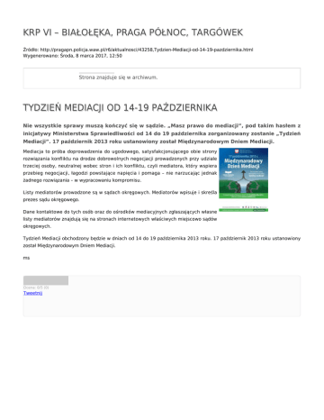 KRP VI – BIAŁOŁĘKA, PRAGA PÓŁNOC, TARGÓWEK Źródło: http://pragapn.policja.waw.pl/r6/aktualnosci/43258,Tydzien-Mediacji-od-14-19-pazdziernika.html Wygenerowano: Środa, 8 marca 2017, 12:50 Strona znajduje się w archiwum. TYDZIEŃ MEDIACJI OD 14-19 PAŹDZIERNIKA Nie wszystkie sprawy muszą kończyć się w sądzie. „Masz prawo do mediacji”, pod takim hasłem z inicjatywy Ministerstwa Sprawiedliwości od 14 do 19 października zorganizowany zostanie „Tydzień Mediacji”. 17 październik 2013 roku ustanowiony został Międzynarodowym Dniem Mediacji. Mediacja to próba doprowadzenia do ugodowego, satysfakcjonującego obie strony rozwiązania konfliktu na drodze dobrowolnych negocjacji prowadzonych przy udziale trzeciej osoby, neutralnej wobec stron i ich konfliktu, czyli mediatora, który wspiera przebieg negocjacji, łagodzi powstające napięcia i pomaga – nie narzucając jednak żadnego rozwiązania – w wypracowaniu kompromisu. Listy mediatorów prowadzone są w sądach okręgowych. Mediatorów wpisuje i skreśla prezes sądu okręgowego. Dane kontaktowe do tych osób oraz do ośrodków mediacyjnych zgłaszających własne listy mediatorów znajdują się na stronach internetowych właściwych miejscowo sądów okręgowych. Tydzień Mediacji obchodzony będzie w dniach od 14 do 19 października 2013 roku. 17 październik 2013 roku ustanowiony został Międzynarodowym Dniem Mediacji. ms Ocena: 0/5 (0) Tweetnij
