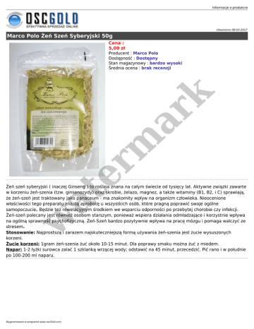 Informacje o produkcie Utworzono 08-03-2017 Marco Polo Żeń Szeń Syberyjski 50g Cena : 5,00 zł er m ar k Producent : Marco Polo Dostępność : Dostępny Stan magazynowy : bardzo wysoki Średnia ocena : brak recenzji w at Żeń szeń syberyjski ( inaczej Ginseng ) to roślina znana na całym świecie od tysięcy lat. Aktywne związki zawarte w korzeniu żeń-szenia (tzw. ginsenozydy) oraz skrobie, żelazo, magnez, a także witaminy (B1, B2, i C) sprawiają, że żeń-szeń jest traktowany jako panaceum - ma znakomity wpływ na organizm człowieka. Nieocenione właściwości tego preparatu znajdą aprobatę u wszystkich osób, które pragną poprawić swoje ogólne samopoczucie. Będzie też rewelacyjnym środkiem we wsparciu odporności po przebytej chorobie czy infekcji. Żeń-szeń polecany jest również osobom starszym, ponieważ wspiera działania odmładzające i korzystnie wpływa na ogólną sprawność psychofizyczną. Żeń-Szeń bardzo pozytywnie wpływa na pracę mózgu i pomaga walczyć ze stresem. Stosowanie: Najprostszą i zarazem najskuteczniejszą formą używania żeń-szenia jest żucie wysuszonych korzeni. Żucie korzeni: 1gram żeń-szenia żuć około 10-15 minut. Dla poprawy smaku można żuć z miodem. Napar: 1-2 łyżki surowca zalać 1 szklanką wrzącej wody; odstawić na 45 minut, przecedzić. Pić rano i w południe po 100-200 ml naparu. Wygenerowano w programie www.oscGold.com