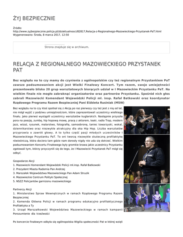 ŻYJ BEZPIECZNIE Źródło: http://www.zyjbezpiecznie.policja.pl/zb/aktualnosci/82817,Relacja-z-Regionalnego-Mazowieckiego-Przystanek-PaT.html Wygenerowano: Środa, 8 marca 2017, 12:50 Strona znajduje się w archiwum. RELACJA Z REGIONALNEGO MAZOWIECKIEGO PRZYSTANEK PAT Bez względu na to czy mamy do czynienia z ogólnopolskim czy też regionalnym Przystankiem PaT zawsze podsumowaniem akcji jest Wielki Finałowy Koncert. Tym razem, swoje umiejętności prezentowało blisko 20 grup warsztatowych biorących udział w I Mazowieckim Przystanku PaT. Na wielkim finale nie mogło zabraknąć organizatorów oraz partnerów Przystanku. Spośród nich głos zabrali Mazowiecki Komendant Wojewódzki Policji mł. insp. Rafał Batkowski oraz koordynator Rządowego Programu Razem Bezpieczniej Pani Elżbieta Rusiniak (MSW) Bez względu na to czy ktoś spotkał się z Akcją po raz pierwszy czy też jest z nią od lat, nie mógł wyjść z podziwu umiejętnościom, które zaprezentowali uczestnicy wielkiego finału. Jako pierwsi wystąpili uczestnicy warsztatów kuglarskich. Następnie przyszła pora na poezję, zumbę, hip hopową mowę, pracę z aktorem, teatr, radio Trap, modern jazz, wizaż, rysunek, malarstwo, fotografię, samoobronę, taniec towarzyski, wokal, dziennikarstwo oraz niezwykle atrakcyjny dla oka Hip Hop. Liczba warsztatów przyprawia o zawrót głowy. A to tylko część pasji młodych uczestników I Mazowieckiego Przystanku PaT. To oni tworzą niezwykle skuteczną profilaktykę rówieśniczą, która dociera tam gdzie nam dorosły nigdy nie uda się dotrzeć. Wielkim podsumowaniem Koncertu Finałowego były gromkie brawa jakie uczestnicy Przystanku zgotowali tym, którzy przyczynili się do tego, że I Mazowiecki Przystanek PaT mógł się odbyć. Gospodarze Akcji 1. Mazowiecki Komendant Wojewódzki Policji mł.insp. Rafał Batkowski 2. Prezydent Miasta Radomia Pan Andrzej 3. Marszałek Województwa Mazowieckiego Pan Adam Struzik 4. Mazowieckie Centrum Polityki Społecznej 5. NSZZ Policjantów garnizonu mazowieckiego Partnerzy Akcji 1. Ministerstwo Spraw Wewnętrznych w ramach Rządowego Programu Razem Bezpieczniej 2. Komenda Główna Policji w ramach programu edukacyjno profilaktycznego Profilaktyka a Ty 3. Urząd Marszałkowski Województwa Mazowieckiego w ramach kampanii Porozumienie dla trzeźwości Po koncercie finałowym odbyła się ogólnopolska Wigilia społeczności Pat w której wzięli udział wszyscy uczestniczyli Regionalnego Mazowieckiego Przystanek Pat, gospodarze oraz partnerzy. W rodzinnej atmosferze uczestnicy spotkania łamali się opłatkiem, składali sobie życzenia i śpiewali kolędy. (KWP w Radomiu / pt) Ocena: 5/5 (1) Tweetnij