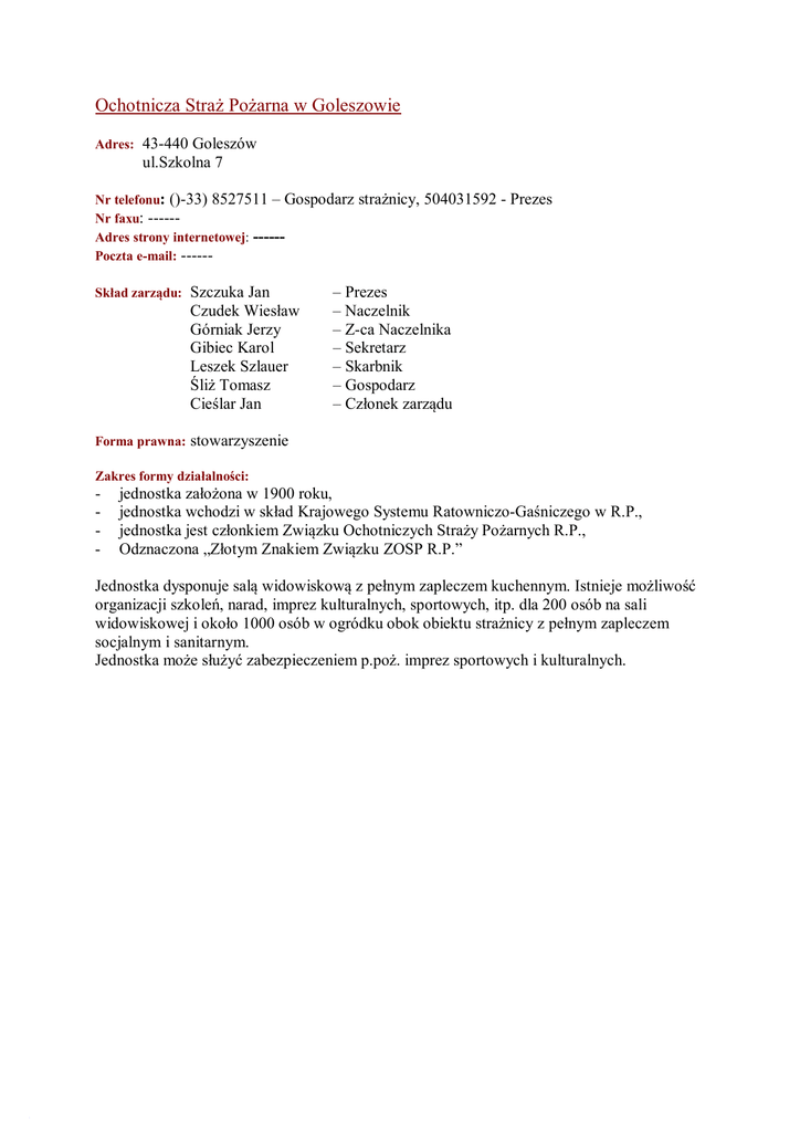 Ochotnicza Straż Pożarna w Goleszowie Adres: 43-440 Goleszów ul.Szkolna 7 Nr telefonu: ()-33) 8527511 – Gospodarz strażnicy, 504031592 - Prezes Nr faxu: -----Adres strony internetowej: -----Poczta e-mail: -----Skład zarządu: Szczuka Jan Czudek Wiesław Górniak Jerzy Gibiec Karol Leszek Szlauer Śliż Tomasz Cieślar Jan – Prezes – Naczelnik – Z-ca Naczelnika – Sekretarz – Skarbnik – Gospodarz – Członek zarządu Forma prawna: stowarzyszenie Zakres formy działalności: - jednostka założona w 1900 roku, jednostka wchodzi w skład Krajowego Systemu Ratowniczo-Gaśniczego w R.P., jednostka jest członkiem Związku Ochotniczych Straży Pożarnych R.P., Odznaczona „Złotym Znakiem Związku ZOSP R.P.” Jednostka dysponuje salą widowiskową z pełnym zapleczem kuchennym. Istnieje możliwość organizacji szkoleń, narad, imprez kulturalnych, sportowych, itp. dla 200 osób na sali widowiskowej i około 1000 osób w ogródku obok obiektu strażnicy z pełnym zapleczem socjalnym i sanitarnym. Jednostka może służyć zabezpieczeniem p.poż. imprez sportowych i kulturalnych.