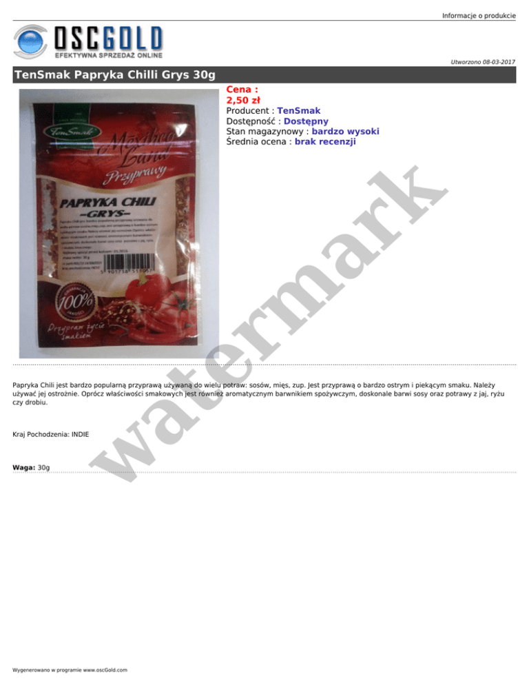 Informacje o produkcie Utworzono 08-03-2017 TenSmak Papryka Chilli Grys 30g Cena : 2,50 zł er m ar k Producent : TenSmak Dostępność : Dostępny Stan magazynowy : bardzo wysoki Średnia ocena : brak recenzji at Papryka Chili jest bardzo popularną przyprawą używaną do wielu potraw: sosów, mięs, zup. Jest przyprawą o bardzo ostrym i piekącym smaku. Należy używać jej ostrożnie. Oprócz właściwości smakowych jest również aromatycznym barwnikiem spożywczym, doskonale barwi sosy oraz potrawy z jaj, ryżu czy drobiu. w Kraj Pochodzenia: INDIE Waga: 30g Wygenerowano w programie www.oscGold.com