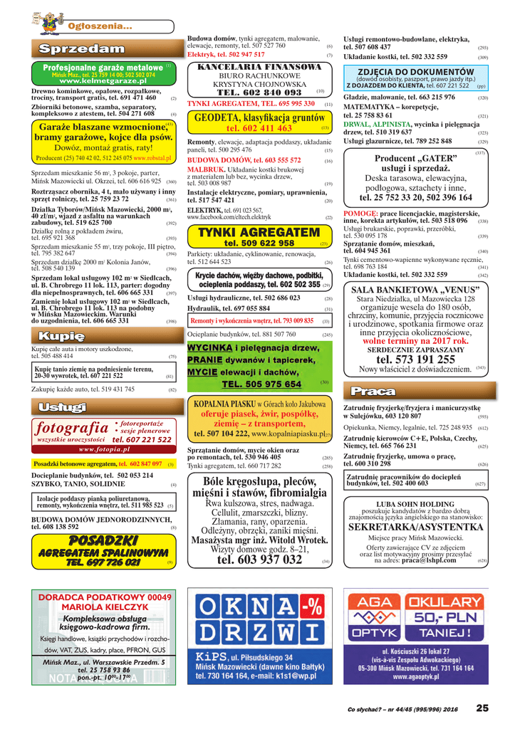 Ogłoszenia... Sprzedam Profesjonalne garaże metalowe (1) Mińsk Maz., tel. 25 759 14 00; 502 502 074 Drewno kominkowe, opałowe, rozpałkowe, trociny, transport gratis, tel. 691 471 460 (2) Zbiorniki betonowe, szamba, separatory, kompleksowo z atestem, tel. 504 271 608 (4) Garaże blaszane wzmocnione, bramy garażowe, kojce dla psów. (43) Dowóz, montaż gratis, raty! Producent (25) 740 42 02, 512 245 075 www.robstal.pl Sprzedam mieszkanie 56 m2, 3 pokoje, parter, Mińsk Mazowiecki ul. Okrzei, tel. 606 616 925 (360) Roztrząsacz obornika, 4 t, mało używany i inny (361) sprzęt rolniczy, tel. 25 759 23 72 Działka Tyborów/Mińsk Mazowiecki, 2000 m2, 40 zł/m2, wjazd z asfaltu na warunkach zabudowy, tel. 519 625 700 (392) Działkę rolną z pokładem żwiru, tel. 695 921 368 (393) Sprzedam mieszkanie 55 m2, trzy pokoje, III piętro, tel. 795 382 647 (394) Sprzedam działkę 2000 m2 Kolonia Janów, tel. 508 540 139 (396) Sprzedam lokal usługowy 102 m2 w Siedlcach, ul. B. Chrobrego 11 lok. 113, parter: dogodny (397) dla niepełnosprawnych, tel. 606 665 331 Zamienię lokal usługowy 102 m2 w Siedlcach, ul. B. Chrobrego 11 lok. 113 na podobny w Mińsku Mazowieckim. Warunki do uzgodnienia, tel. 606 665 331 (398) Kupię Elektryk, tel. 502 947 517 (7) KANCELARIA FINANSOWA TEL. 602 840 093 Kupię tanio ziemię na podniesienie terenu, 20-30 wywrotek, tel. 607 221 522 Zakupię każde auto, tel. 519 431 745 ELEKTRYK, tel. 691 023 567, www.facebook.com/eltech.elektryk TYNKI AGREGATEM (26) Krycie dachów, więźby dachowe, podbitki, ocieplenia poddaszy, tel. 602 502 355 (29) Usługi hydrauliczne, tel. 502 686 023 (28) Hydraulik, tel. 697 055 884 (31) Remonty i wykończenia wnętrz, tel. 793 009 835 (33) (245) (337) Producent „GATER” usługi i sprzedaż. Deska tarasowa, elewacyjna, podłogowa, sztachety i inne, tel. 25 752 33 20, 502 396 164 POMOGĘ: prace licencjackie, magisterskie, inne, korekta artykułów, tel. 503 518 096 (338) Usługi brukarskie, poprawki, przeróbki, (339) tel. 530 095 178 Sprzątanie domów, mieszkań, (340) tel. 604 945 361 Tynki cementowo-wapienne wykonywane ręcznie, (341) tel. 698 763 184 Układanie kostki, tel. 502 332 559 (342) SALA BANKIETOWA „VENUS” Stara Niedziałka, ul Mazowiecka 128 organizuje wesela do 180 osób, chrzciny, komunie, przyjęcia rocznicowe i urodzinowe, spotkania firmowe oraz inne przyjęcia okolicznościowe, wolne terminy na 2017 rok. tel. 573 191 255 Nowy właściciel z doświadczeniem. (81) (30) (82) KOPALNIA PIASKU w Górach koło Jakubowa oferuje piasek, żwir, pospółkę, ziemię – z transportem, tel. 607 221 522 www.fotopia.pl (3) Docieplanie budynków, tel. 502 053 214 SZYBKO, TANIO, SOLIDNIE (4) (5) BUDOWA DOMÓW JEDNORODZINNYCH, (8) tel. 608 138 592 Posadzki agregatem spalinowym tel. 697 726 021 (23) (320) MATEMATYKA – korepetycje, tel. 25 758 83 61 (321) DRWAL, ALPINISTA, wycinka i pielęgnacja drzew, tel. 510 319 637 (323) Usługi glazurnicze, tel. 789 252 848 (329) SERDECZNIE ZAPRASZAMY • fotoreportaże • sesje plenerowe Izolacje poddaszy pianką poliuretanową, remonty, wykończenia wnętrz, tel. 511 985 523 (22) (75) Usługi Posadzki betonowe agregatem, tel. 602 847 097 (13) BUDOWA DOMÓW, tel. 603 555 572 (16) MALBRUK. Układanie kostki brukowej z materiałem lub bez, wycinka drzew, (19) tel. 503 008 987 Instalacje elektryczne, pomiary, uprawnienia, tel. 517 547 421 (20) tel. 509 622 958 (309) Gładzie, malowanie, tel. 663 215 976 (11) Remonty, elewacje, adaptacja poddaszy, układanie paneli, tel. 500 295 476 (15) Parkiety: układanie, cyklinowanie, renowacja, tel. 512 644 523 (293) Układanie kostki, tel. 502 332 559 ZDJĘCIA DO DOKUMENTÓW GEODETA, klasyfikacja gruntów tel. 602 411 463 Usługi remontowo-budowlane, elektryka, tel. 507 608 437 (dowód osobisty, paszport, prawo jazdy itp.) Z DOJAZDEM DO KLIENTA, tel. 607 221 522 (pp) (10) TYNKI AGREGATEM, TEL. 695 995 330 Ocieplanie budynków, tel. 881 507 760 Kupię całe auta i motory uszkodzone, tel. 505 488 414 wszystkie uroczystości (6) BIURO RACHUNKOWE KRYSTYNA CHOJNOWSKA www.kelmetgaraze.pl fotografia Budowa domów, tynki agregatem, malowanie, elewacje, remonty, tel. 507 527 760 (9) tel. 507 104 222, www.kopalniapiasku.pl(27) Sprzątanie domów, mycie okien oraz po remontach, tel. 530 946 405 Tynki agregatem, tel. 660 717 282 (285) (258) Bóle kręgosłupa, pleców, mięśni i stawów, fibromialgia Rwa kulszowa, stres, nadwaga. Cellulit, zmarszczki, blizny. Złamania, rany, oparzenia. Odleżyny, obrzęki, zaniki mięśni. Masażysta mgr inż. Witold Wrotek. Wizyty domowe godz. 8–21, tel. 603 937 032 (34) (343) Praca Zatrudnię fryzjerkę/fryzjera i manicurzystkę (593) w Sulejówku, 603 120 807 Opiekunka, Niemcy, legalnie, tel. 725 248 935 (612) Zatrudnię kierowców C+E, Polska, Czechy, (625) Niemcy, tel. 665 766 231 Zatrudnię fryzjerkę, umowa o pracę, tel. 600 310 298 Zatrudnię pracowników do dociepleń budynków, tel. 502 400 603 (626) (627) LUBA SOHN HOLDING poszukuje kandydatów z bardzo dobrą znajomością języka angielskiego na stanowisko: SEKRETARKA/ASYSTENTKA Miejsce pracy Mińsk Mazowiecki. Oferty zawierające CV ze zdjęciem oraz list motywacyjny prosimy przesyłać na adres: [email protected] (628) DORADCA PODATKOWY 00049 MARIOLA KIELCZYK Kompleksowa obsługa księgowo-kadrowa firm. Księgi handlowe, książki przychodów i rozchodów, VAT, ZUS, kadry, płace, PFRON, GUS Mińsk Maz., ul. Warszawskie Przedm. 5 tel. 25 758 93 86 pon.-pt. 1000-1700 Co słychać? – nr 44/45 (995/996) 2016 25