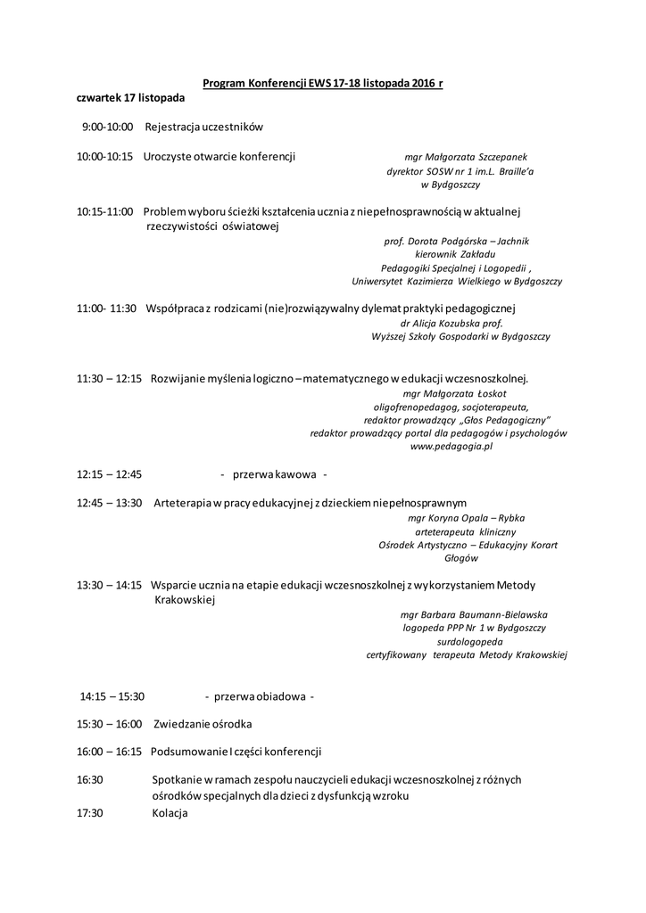 Program Konferencji EWS 17-18 listopada 2016 r czwartek 17 listopada 9:00-10:00 Rejestracja uczestników 10:00-10:15 Uroczyste otwarcie konferencji mgr Małgorzata Szczepanek dyrektor SOSW nr 1 im.L. Braille’a w Bydgoszczy 10:15-11:00 Problem wyboru ścieżki kształcenia ucznia z niepełnosprawnością w aktualnej rzeczywistości oświatowej prof. Dorota Podgórska – Jachnik kierownik Zakładu Pedagogiki Specjalnej i Logopedii , Uniwersytet Kazimierza Wielkiego w Bydgoszczy 11:00- 11:30 Współpraca z rodzicami (nie)rozwiązywalny dylemat praktyki pedagogicznej dr Alicja Kozubska prof. Wyższej Szkoły Gospodarki w Bydgoszczy 11:30 – 12:15 Rozwijanie myślenia logiczno – matematycznego w edukacji wczesnoszkolnej. mgr Małgorzata Łoskot oligofrenopedagog, socjoterapeuta, redaktor prowadzący „Głos Pedagogiczny” redaktor prowadzący portal dla pedagogów i psychologów www.pedagogia.pl 12:15 – 12:45 - przerwa kawowa - 12:45 – 13:30 Arteterapia w pracy edukacyjnej z dzieckiem niepełnosprawnym mgr Koryna Opala – Rybka arteterapeuta kliniczny Ośrodek Artystyczno – Edukacyjny Korart Głogów 13:30 – 14:15 Wsparcie ucznia na etapie edukacji wczesnoszkolnej z wykorzystaniem Metody Krakowskiej mgr Barbara Baumann-Bielawska logopeda PPP Nr 1 w Bydgoszczy surdologopeda certyfikowany terapeuta Metody Krakowskiej 14:15 – 15:30 - przerwa obiadowa - 15:30 – 16:00 Zwiedzanie ośrodka 16:00 – 16:15 Podsumowanie I części konferencji 16:30 17:30 Spotkanie w ramach zespołu nauczycieli edukacji wczesnoszkolnej z różnych ośrodków specjalnych dla dzieci z dysfunkcją wzroku Kolacja 18 listopada 8:30- 9:00 Śniadanie 9:00 – 9:45 Środowisko edukacyjne jako system wsparcia dla uczących się. W stronę modelu interaktywnego w edukacji wczesnoszkolnej. dr Jolanta Nowak Zakład Pedagogiki Wczesnoszkolnej i Przedszkolnej Uniwersytet Kazimierza Wielkiego 9:45 – 11:45 Arteterapia w pracy edukacyjnej z dzieckiem niepełnosprawnym poprzez techniki plastyczne i teatralne. mgr Koryna Opala – Rybka arteterapeuta kliniczny Ośrodek Artystyczno – Edukacyjny Korart Głogów 11:45 – 12:15 - przerwa kawowa – 12:15 – 14:15 Prezentacja pracy ośrodków i placówek w ramach dobrych praktyk pedagogicznych w edukacji wczesnoszkolnej . 14:15 – 14:30 Podsumowanie II części konferencji