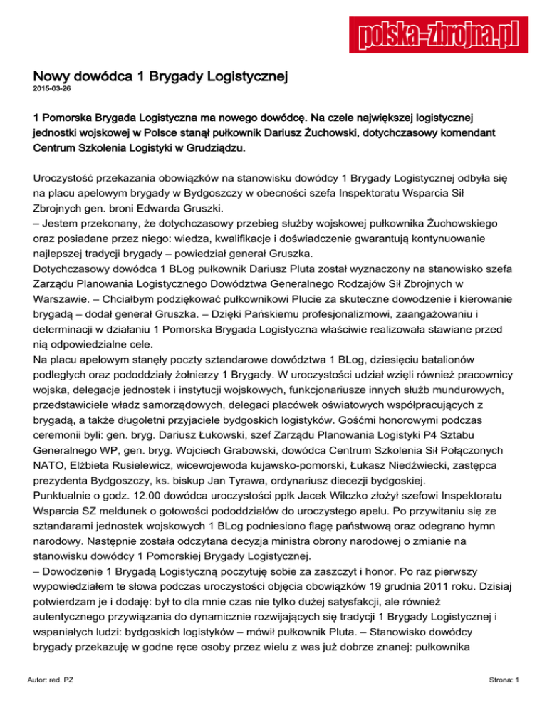 Nowy dowódca 1 Brygady Logistycznej 2015-03-26 1 Pomorska Brygada Logistyczna ma nowego dowódcę. Na czele największej logistycznej jednostki wojskowej w Polsce stanął pułkownik Dariusz Żuchowski, dotychczasowy komendant Centrum Szkolenia Logistyki w Grudziądzu. Uroczystość przekazania obowiązków na stanowisku dowódcy 1 Brygady Logistycznej odbyła się na placu apelowym brygady w Bydgoszczy w obecności szefa Inspektoratu Wsparcia Sił Zbrojnych gen. broni Edwarda Gruszki. – Jestem przekonany, że dotychczasowy przebieg służby wojskowej pułkownika Żuchowskiego oraz posiadane przez niego: wiedza, kwalifikacje i doświadczenie gwarantują kontynuowanie najlepszej tradycji brygady – powiedział generał Gruszka. Dotychczasowy dowódca 1 BLog pułkownik Dariusz Pluta został wyznaczony na stanowisko szefa Zarządu Planowania Logistycznego Dowództwa Generalnego Rodzajów Sił Zbrojnych w Warszawie. – Chciałbym podziękować pułkownikowi Plucie za skuteczne dowodzenie i kierowanie brygadą – dodał generał Gruszka. – Dzięki Pańskiemu profesjonalizmowi, zaangażowaniu i determinacji w działaniu 1 Pomorska Brygada Logistyczna właściwie realizowała stawiane przed nią odpowiedzialne cele. Na placu apelowym stanęły poczty sztandarowe dowództwa 1 BLog, dziesięciu batalionów podległych oraz pododdziały żołnierzy 1 Brygady. W uroczystości udział wzięli również pracownicy wojska, delegacje jednostek i instytucji wojskowych, funkcjonariusze innych służb mundurowych, przedstawiciele władz samorządowych, delegaci placówek oświatowych współpracujących z brygadą, a także długoletni przyjaciele bydgoskich logistyków. Gośćmi honorowymi podczas ceremonii byli: gen. bryg. Dariusz Łukowski, szef Zarządu Planowania Logistyki P4 Sztabu Generalnego WP, gen. bryg. Wojciech Grabowski, dowódca Centrum Szkolenia Sił Połączonych NATO, Elżbieta Rusielewicz, wicewojewoda kujawsko-pomorski, Łukasz Niedźwiecki, zastępca prezydenta Bydgoszczy, ks. biskup Jan Tyrawa, ordynariusz diecezji bydgoskiej. Punktualnie o godz. 12.00 dowódca uroczystości ppłk Jacek Wilczko złożył szefowi Inspektoratu Wsparcia SZ meldunek o gotowości pododdziałów do uroczystego apelu. Po przywitaniu się ze sztandarami jednostek wojskowych 1 BLog podniesiono flagę państwową oraz odegrano hymn narodowy. Następnie została odczytana decyzja ministra obrony narodowej o zmianie na stanowisku dowódcy 1 Pomorskiej Brygady Logistycznej. – Dowodzenie 1 Brygadą Logistyczną poczytuję sobie za zaszczyt i honor. Po raz pierwszy wypowiedziałem te słowa podczas uroczystości objęcia obowiązków 19 grudnia 2011 roku. Dzisiaj potwierdzam je i dodaję: był to dla mnie czas nie tylko dużej satysfakcji, ale również autentycznego przywiązania do dynamicznie rozwijających się tradycji 1 Brygady Logistycznej i wspaniałych ludzi: bydgoskich logistyków – mówił pułkownik Pluta. – Stanowisko dowódcy brygady przekazuję w godne ręce osoby przez wielu z was już dobrze znanej: pułkownika Autor: red. PZ Strona: 1 Dariusza Żuchowskiego, któremu życzę, aby brygada pod jego dowództwem nadal była ważnym ogniwem struktur Sił Zbrojnych RP i mogła kontynuować swoje, niemałe już, tradycje – dodał pułkownik Pluta. – Szef Inspektoratu Wsparcia Sił Zbrojnych powierzył mi obowiązki dowódcy 1 Pomorskiej Brygady Logistycznej – rozpoczął pułkownik Dariusz Żuchowski. – To dla mnie wielki zaszczyt, powód do dumy, a zarazem wyzwanie i obwiązek. To również duży kredyt zaufania, jakim obdarzyli mnie przełożeni, za który dziękuję – podkreślił. Ostatnim elementem uroczystości była defilada wojskowa pododdziałów 1 BLog, której akompaniowała Orkiestra Wojskowa z Bydgoszczy. Pułkownik Dariusz Żuchowski jest absolwentem Wyższej Oficerskiej Szkoły Samochodowej w Pile. Następnie studiował w Akademii Techniczno-Rolniczej w Bydgoszczy na kierunku mechanika i budowa maszyn. W latach 2002 - 2006 ukończył międzynarodowe kursy logistyczne w USA i Niemczech. W roku 2011 został absolwentem Podyplomowych Studiów OperacyjnoStrategicznych Akademii Obrony Narodowej w Warszawie. Pierwsze stanowisko - dowódcy plutonu - objął w 8. Ośrodku Szkolenia Specjalistów Czołgowych w Chełmnie. W latach 1992-1995 był dowódcą kompanii w tym Ośrodku. Następnie zajmował stanowiska logistyczne w 3. pułku drogowo - mostowym we Włocławku. Od 2002 do 2004 roku pełnił obowiązki Specjalisty Wydziału Planowania Oddziału Logistyki G-4 w 1. Korpusie Zmechanizowanym w Bydgoszczy. W 2004 roku został mianowany na stanowisko Szefa Sztabu w 1. Brygadzie Logistycznej. Następnym etapem kariery pułkownika była służba w strukturach międzynarodowych w Dowództwie Komponentu Lądowego w Heidelbergu na stanowisku Szefa Wydziału Operacyjnego G-4, w ramach których uczestniczył w wielu ćwiczeniach międzynarodowych oraz operacji stabilizacyjnej ISAF w Afganistanie na stanowisku Szefa Wydziału Operacyjnego CJ4 Dowództwa ISAF w Kabulu. W 2009 roku objął stanowisko Zastępcy Szefa Oddziału Organizacyjno-Koordynacyjnego w Inspektoracie Wsparcia Sił Zbrojnych w Bydgoszczy. Od października 2009 do sierpnia 2010 roku pełnił obowiązki Asystenta Zastępcy Szefa Sztabu ds. Wsparcia Połączonego Dowództwa ISAF w Afganistanie. W lipcu 2011 roku objął obowiązki Komendanta Centrum Szkolenia Logistyki w Grudziądzu. Jest inicjatorem wielu nowatorskich rozwiązań szkoleniowych i logistycznych, zna biegle język angielski. Interesuje się historią i sportem. Powstała w 2004 roku 1 Pomorska Brygada Logistyczna im. Kazimierza Wielkiego to największa pod względem liczby podporządkowanych jej batalionów jednostka w armii. Brygada ma ich dziesięć i mieści się w aż siedmiu garnizonach na obszarze Polski Północnej. Motto Brygady i służących w niej żołnierzy brzmi: „Logistyka wyrusza pierwsza i powraca ostatnia”. Przez prawie 11 lat istni